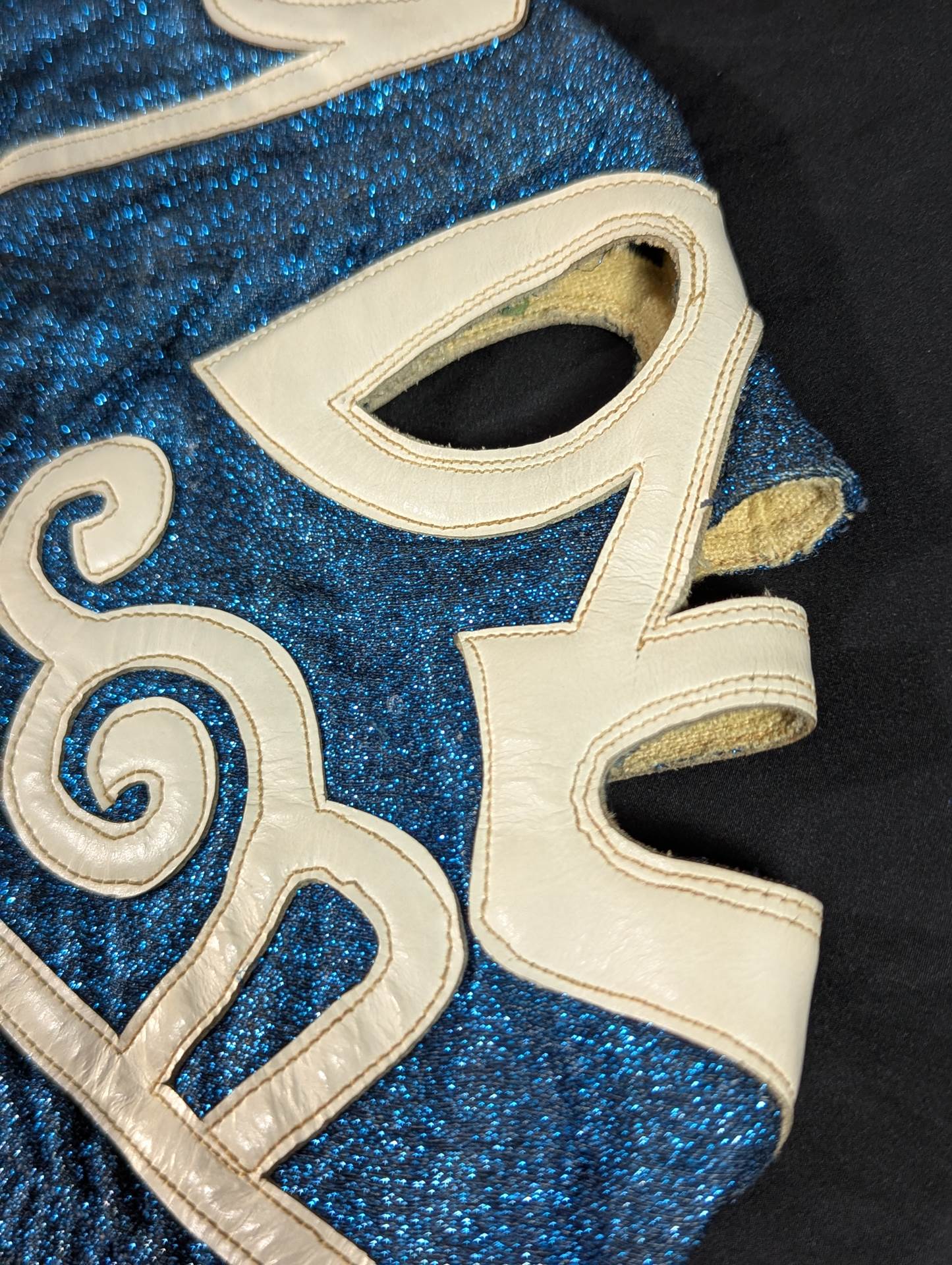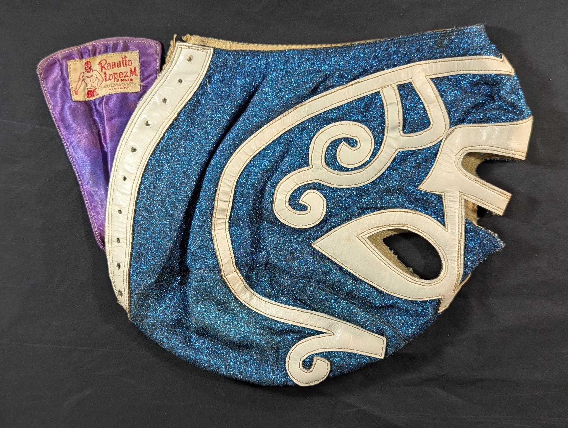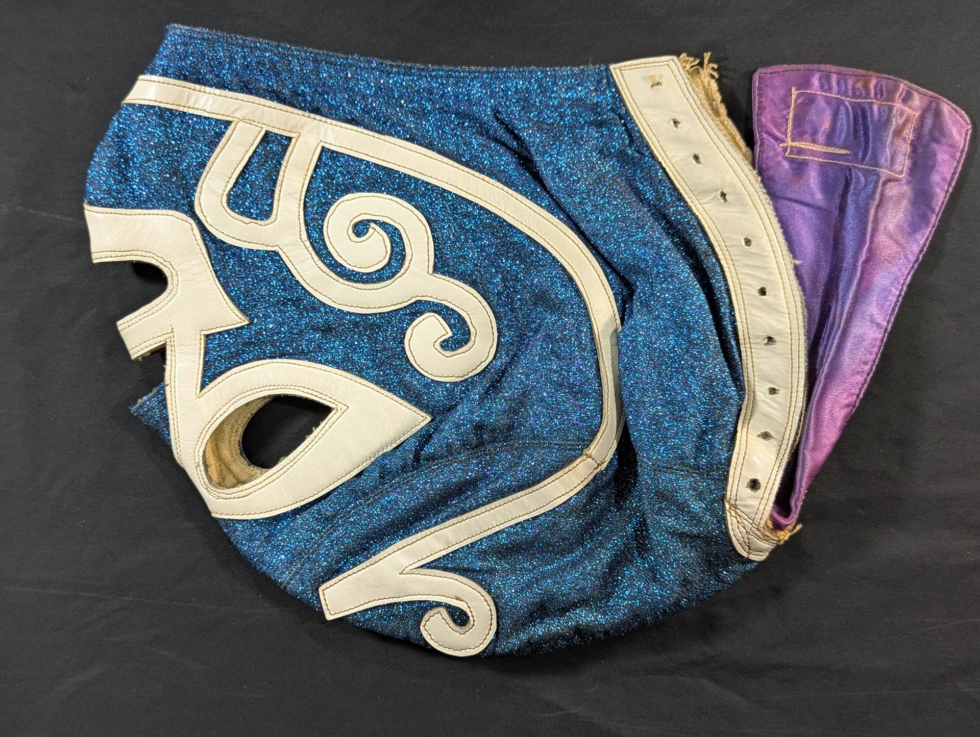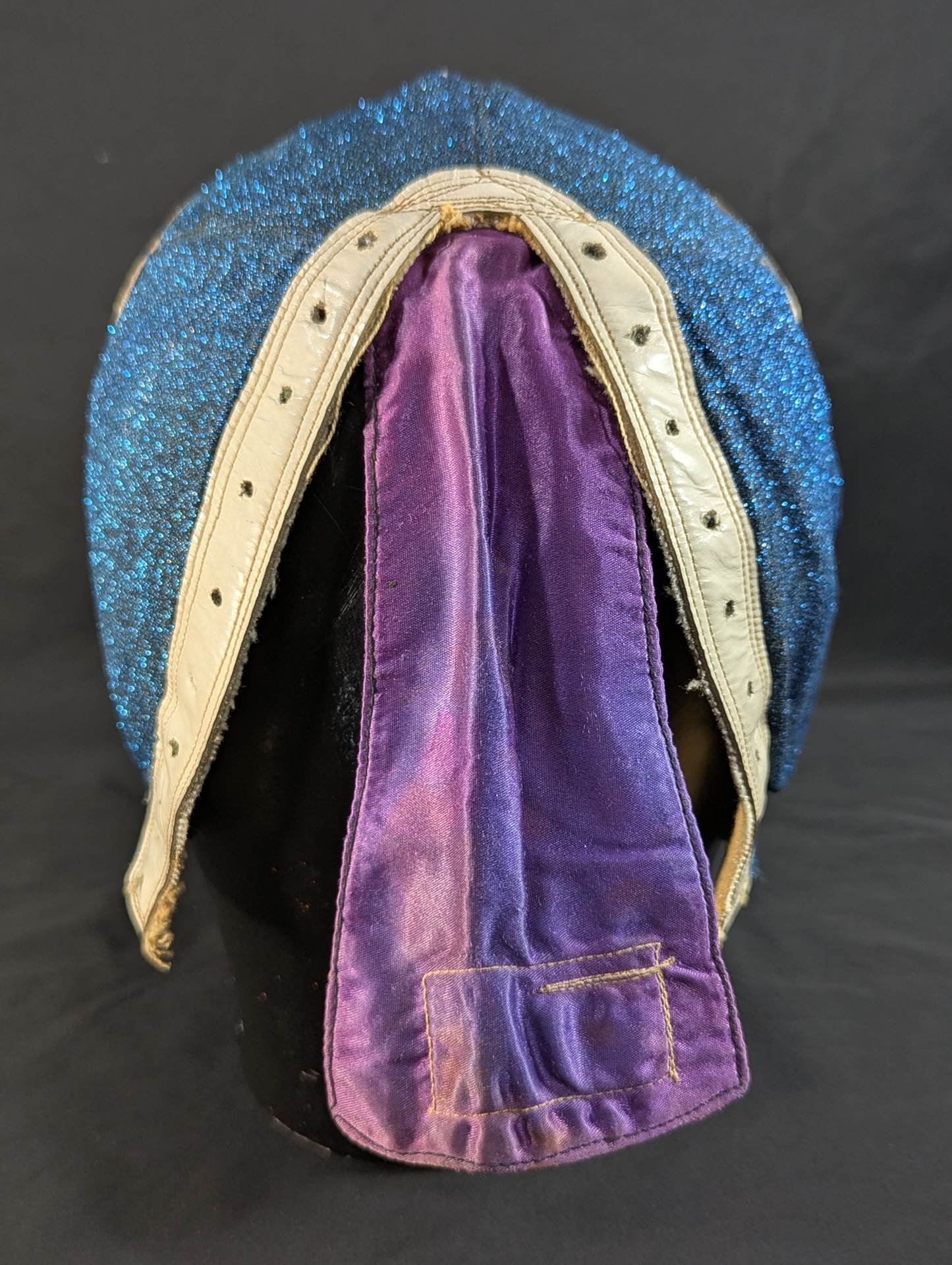 ★ worn by him !! 70s Original ★ Blue Briot Salame 2-layer fabric (lining is dark green old satin fabric) White leather edge The tongue is made of purple satin fabric, the throat tape is 1.5 cm wide and has dark yellow-green top and bottom W stitching ~Mysterious Mask Art~ The actual mask published on page 9 of the Lopez edition and page 6 of the Mexican Lucha Libre edition of the same book The actual mask that he kept for many years even after his retirement Since it has a double structure, it seems to have been produced around 1970 ~ 1972.