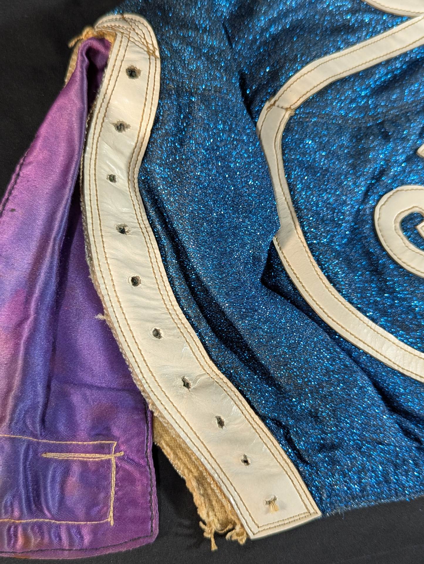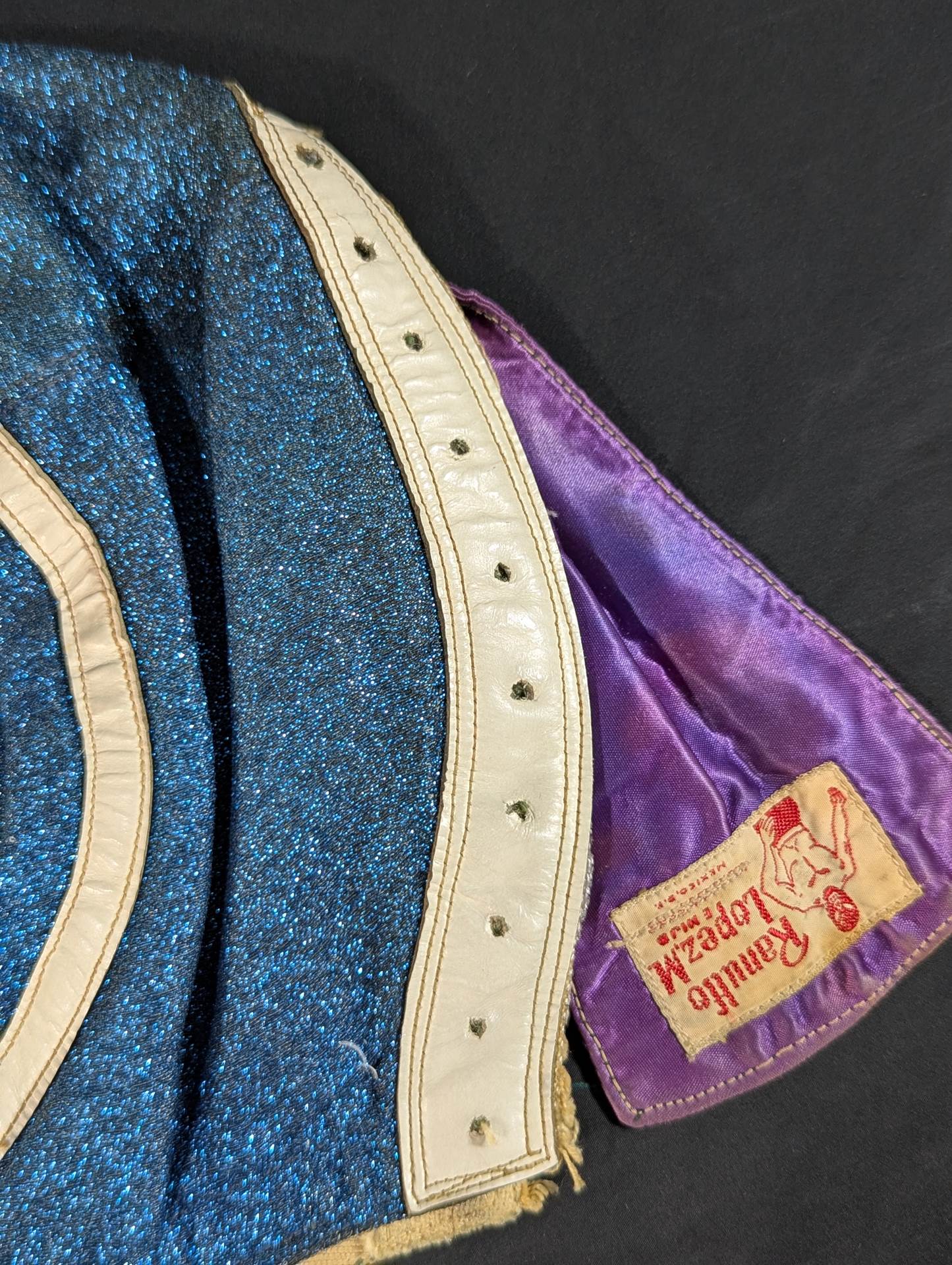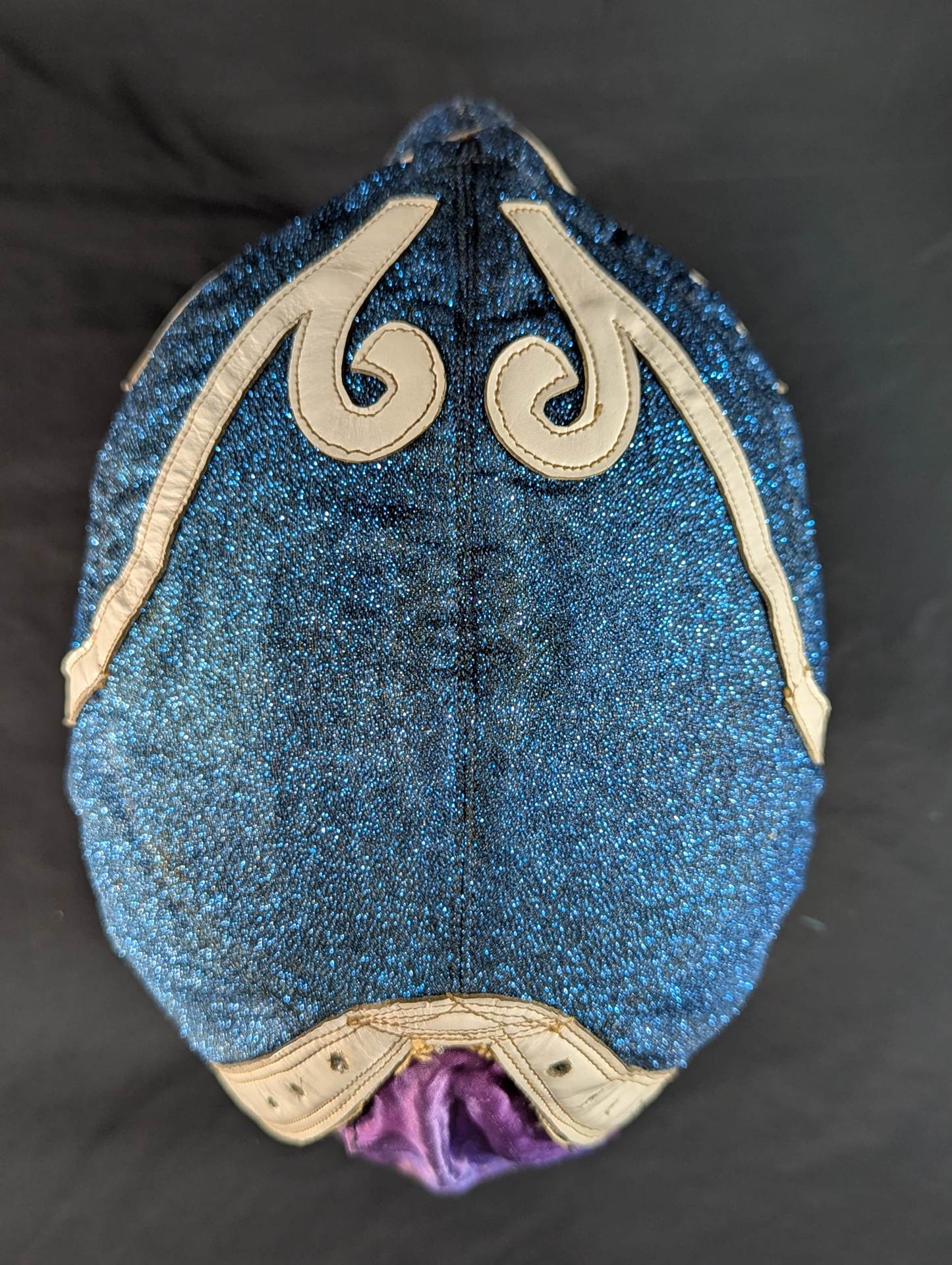 ★ worn by him !! 70s Original ★ Blue Briot Salame 2-layer fabric (lining is dark green old satin fabric) White leather edge The tongue is made of purple satin fabric, the throat tape is 1.5 cm wide and has dark yellow-green top and bottom W stitching ~Mysterious Mask Art~ The actual mask published on page 9 of the Lopez edition and page 6 of the Mexican Lucha Libre edition of the same book The actual mask that he kept for many years even after his retirement Since it has a double structure, it seems to have been produced around 1970 ~ 1972.
