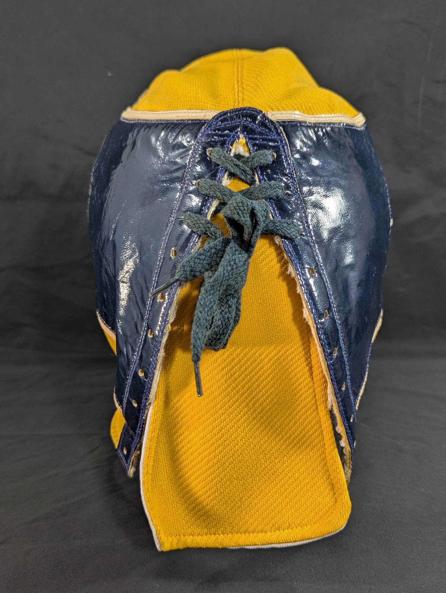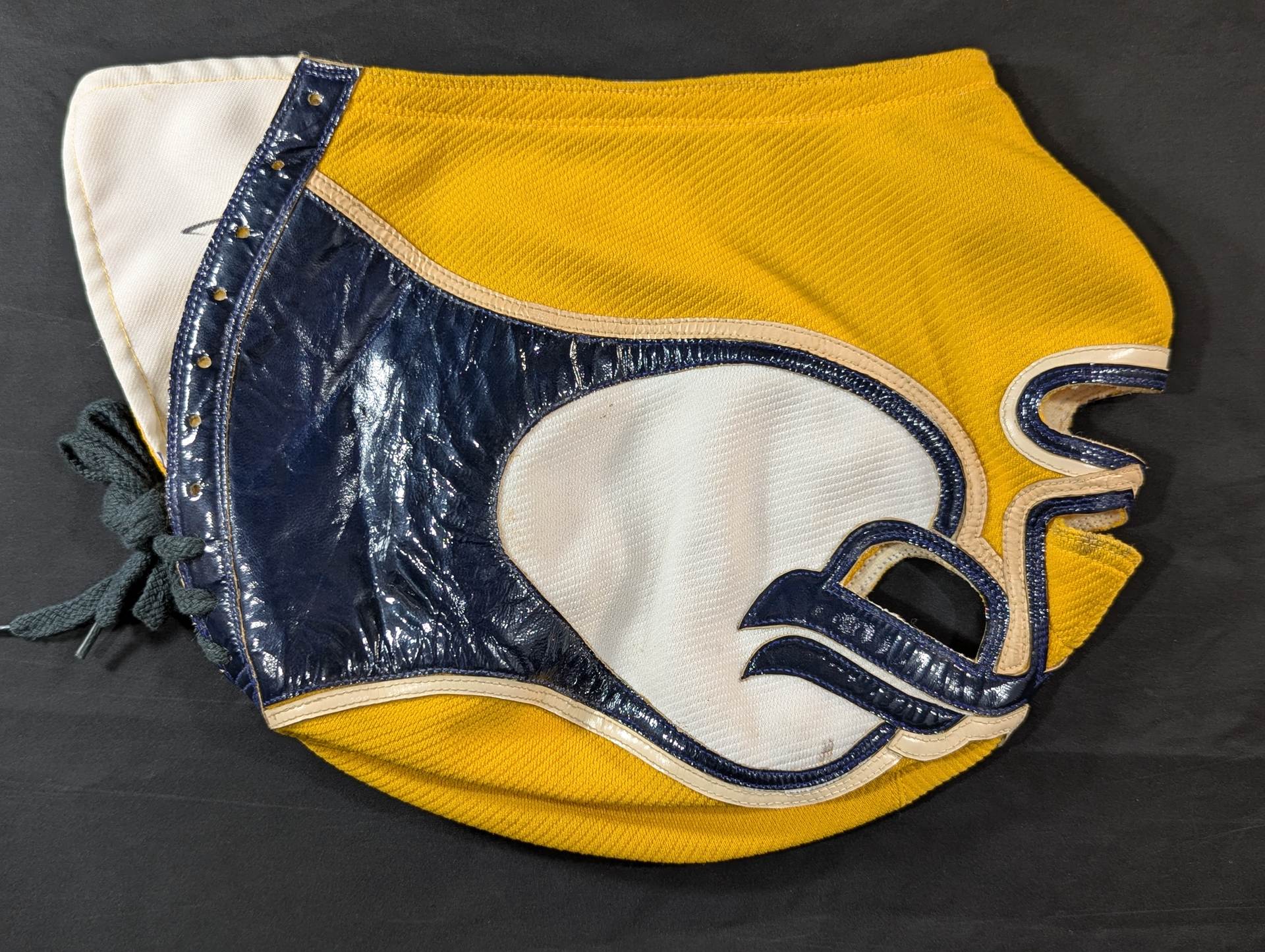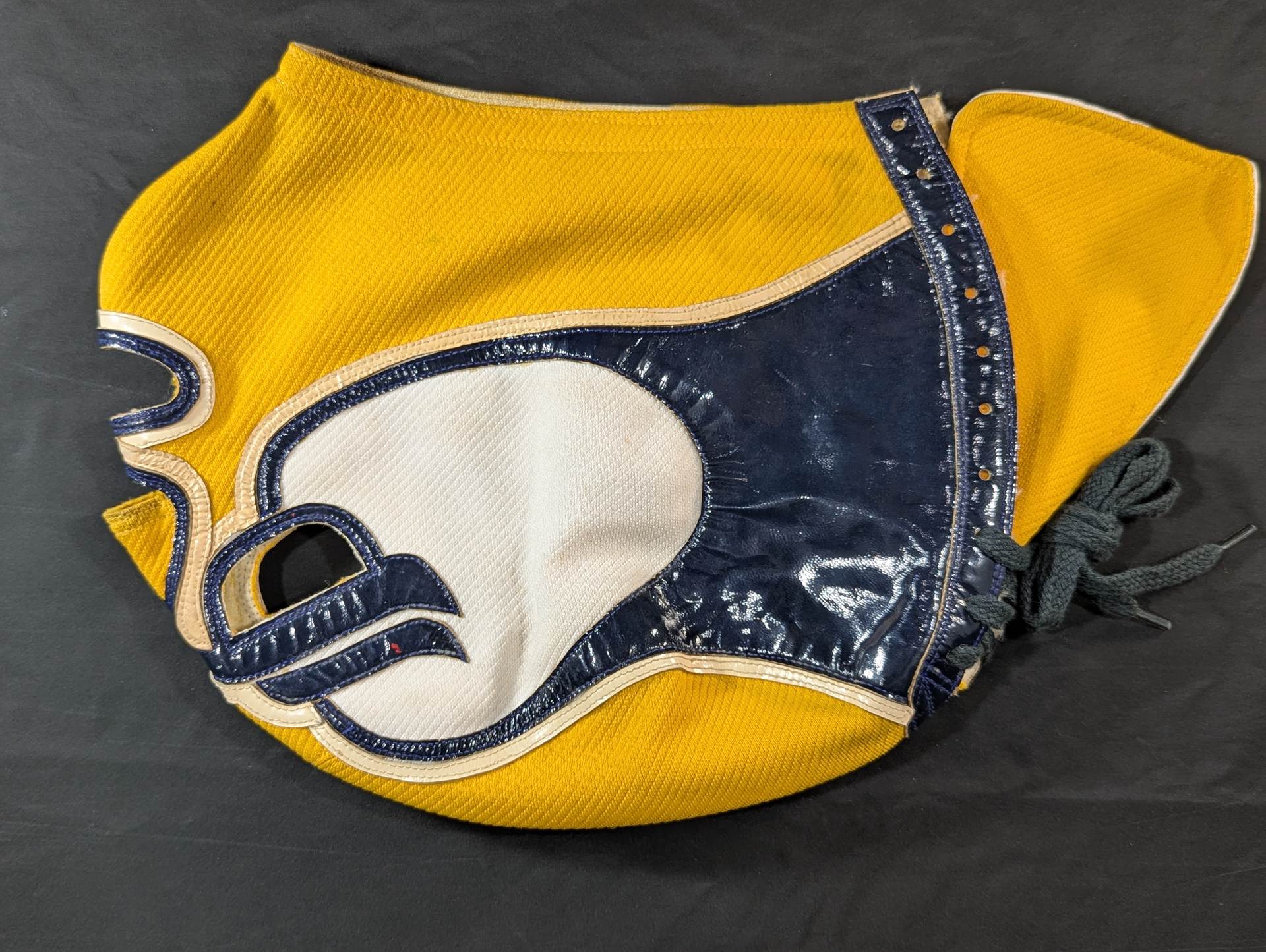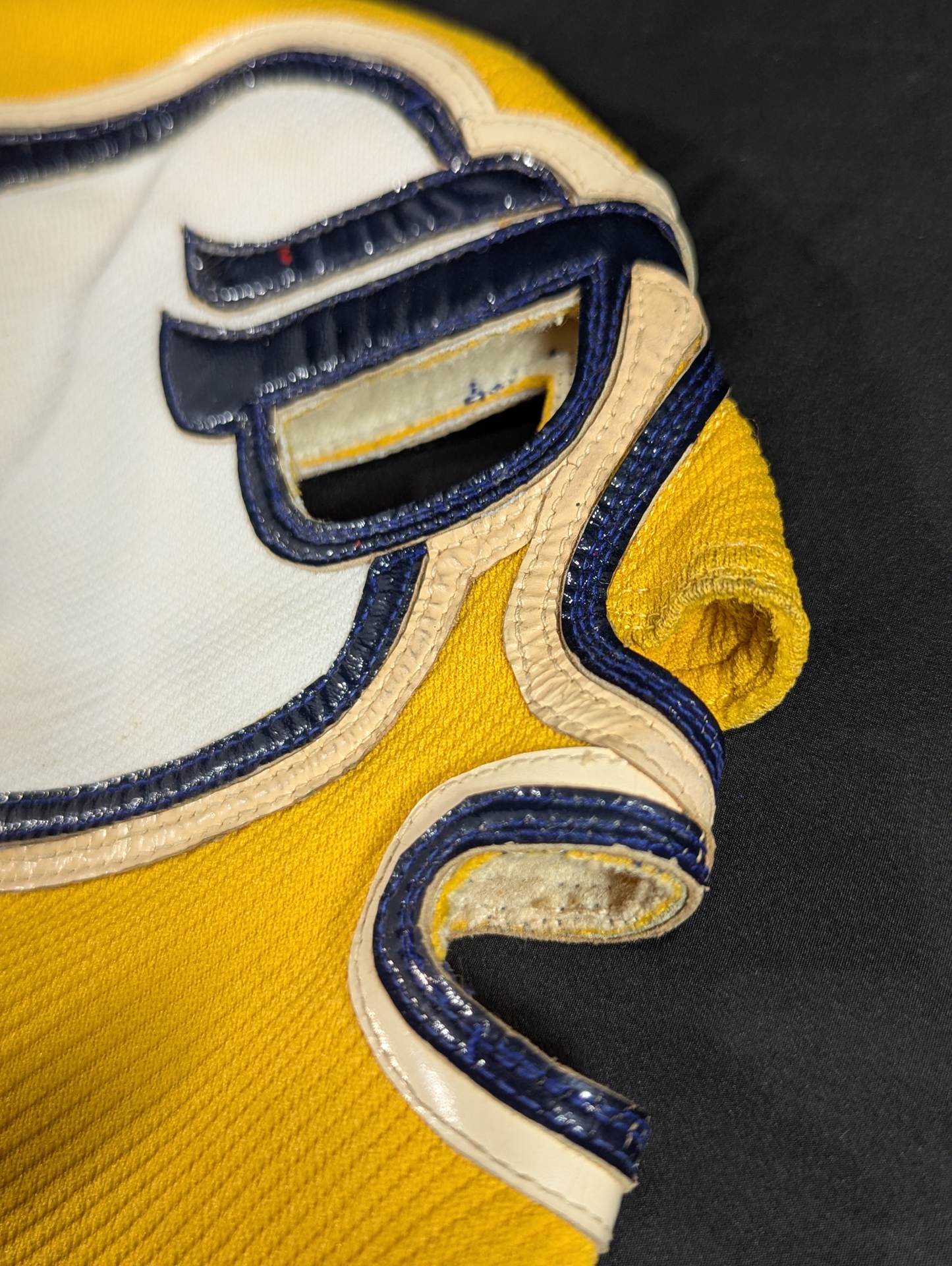 ★ worn by him !! 70's Original ★ Signed Yellow Tellenka Jersey Fabric & White Tellenka Jersey Fabric Dark Blue Leather edge & light beige leather edge (white) The tongue is made of yellow terlenca jersey fabric and white jersey fabric The throat tape is a plain color with a height width of 1.5 cm Jose Luis Mechor Ortiz used for a short time when he transformed into El Archon (original sound) Produced by Victor Romero Luna after 1973