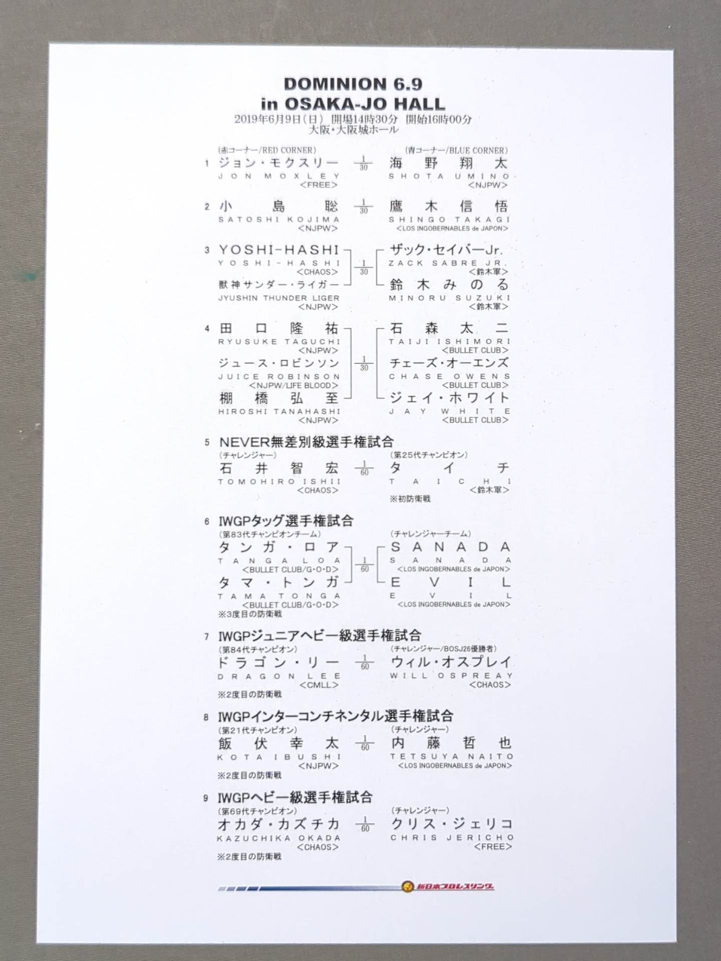 Venue: Osaka Castle Hall / list of the matches on the separate sheet Available: [IWGP Heavyweight Fighters Boxbox] Kazuchika Okada vs Chris Jericho / [IWGP Intercontinental fighters Championship Match] Kota Ibushi vs Tetsuya Naito / [IWGP Junior Heavyweight Fighters Championship Match] Dragon Lee vsWill Ospreay / DOMINION 6.9 in OSAKA-JO HALL