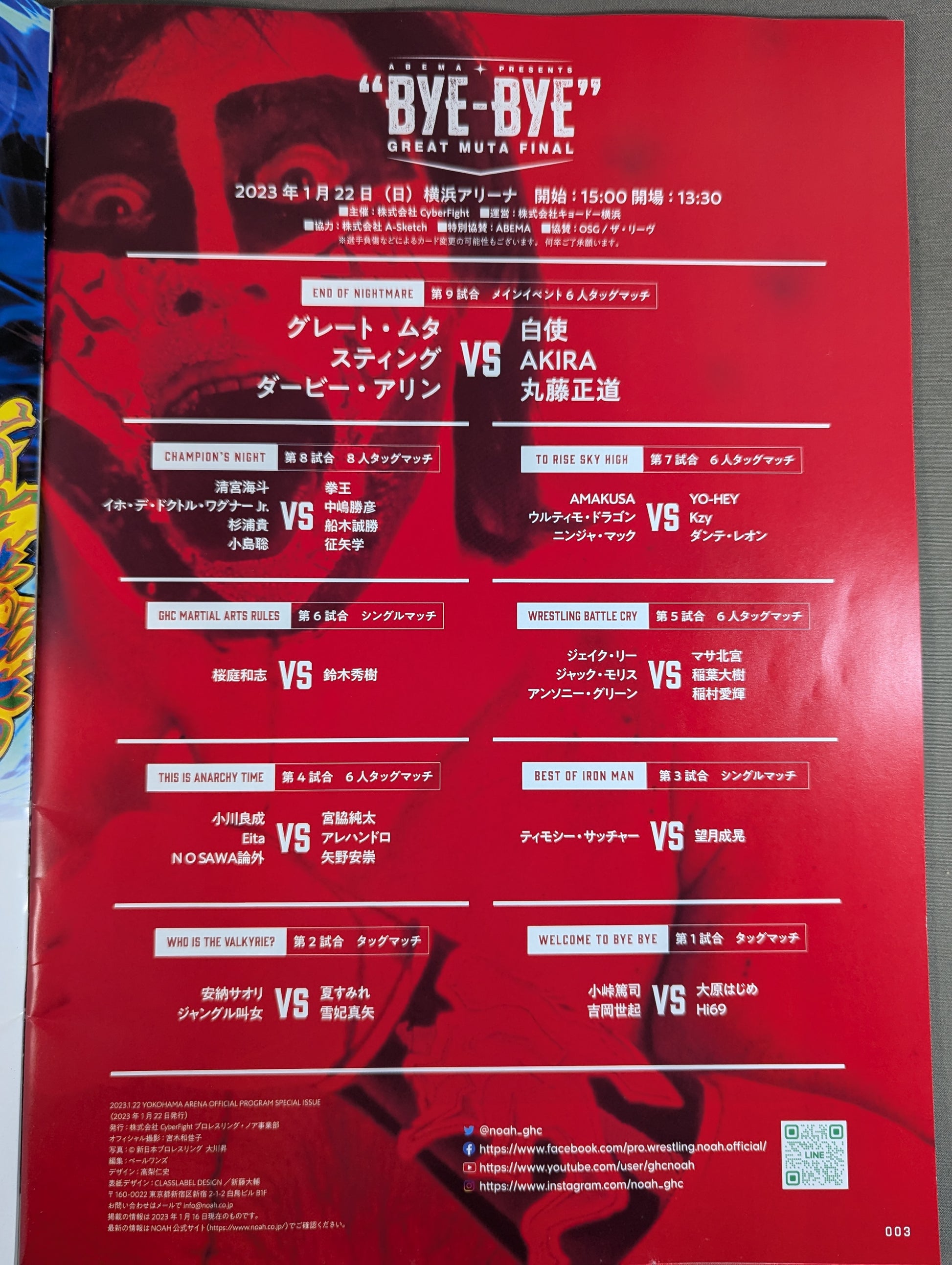 Venue: Yokohama Arena / list of the matches is printed : Great Muta & Sting &Darby Allin vsHakushi &AKIRA& Naomichi Marufuji ABEMA presents Great Muta Final Bye Bye Bye