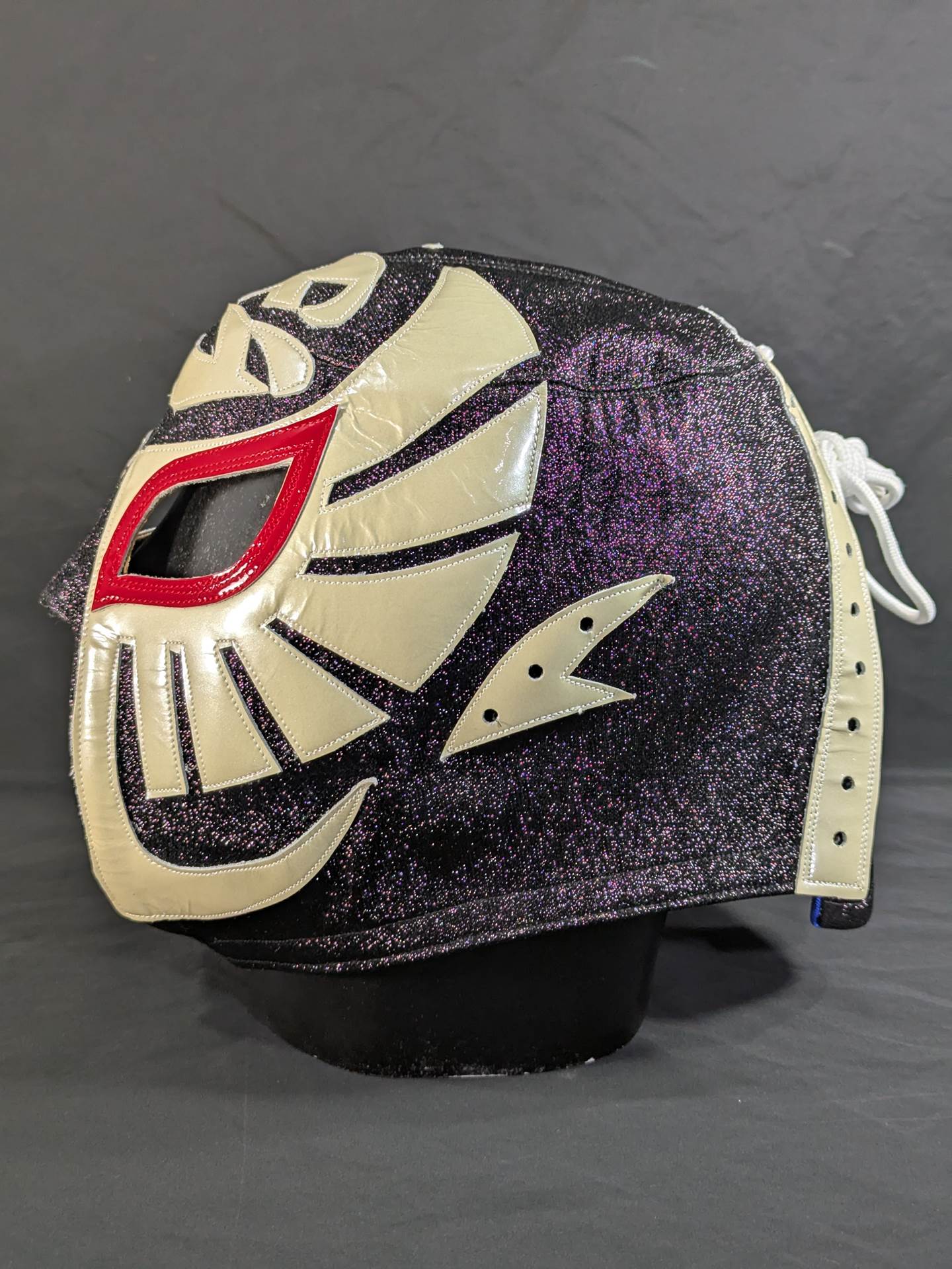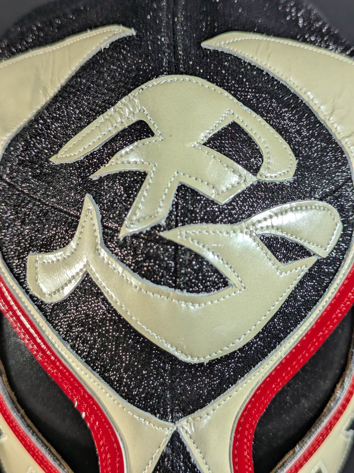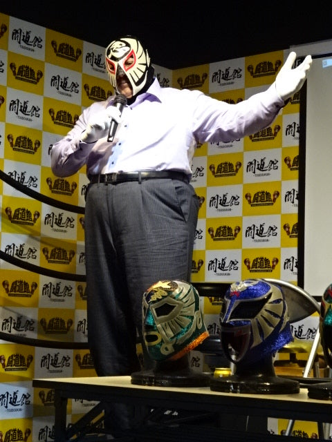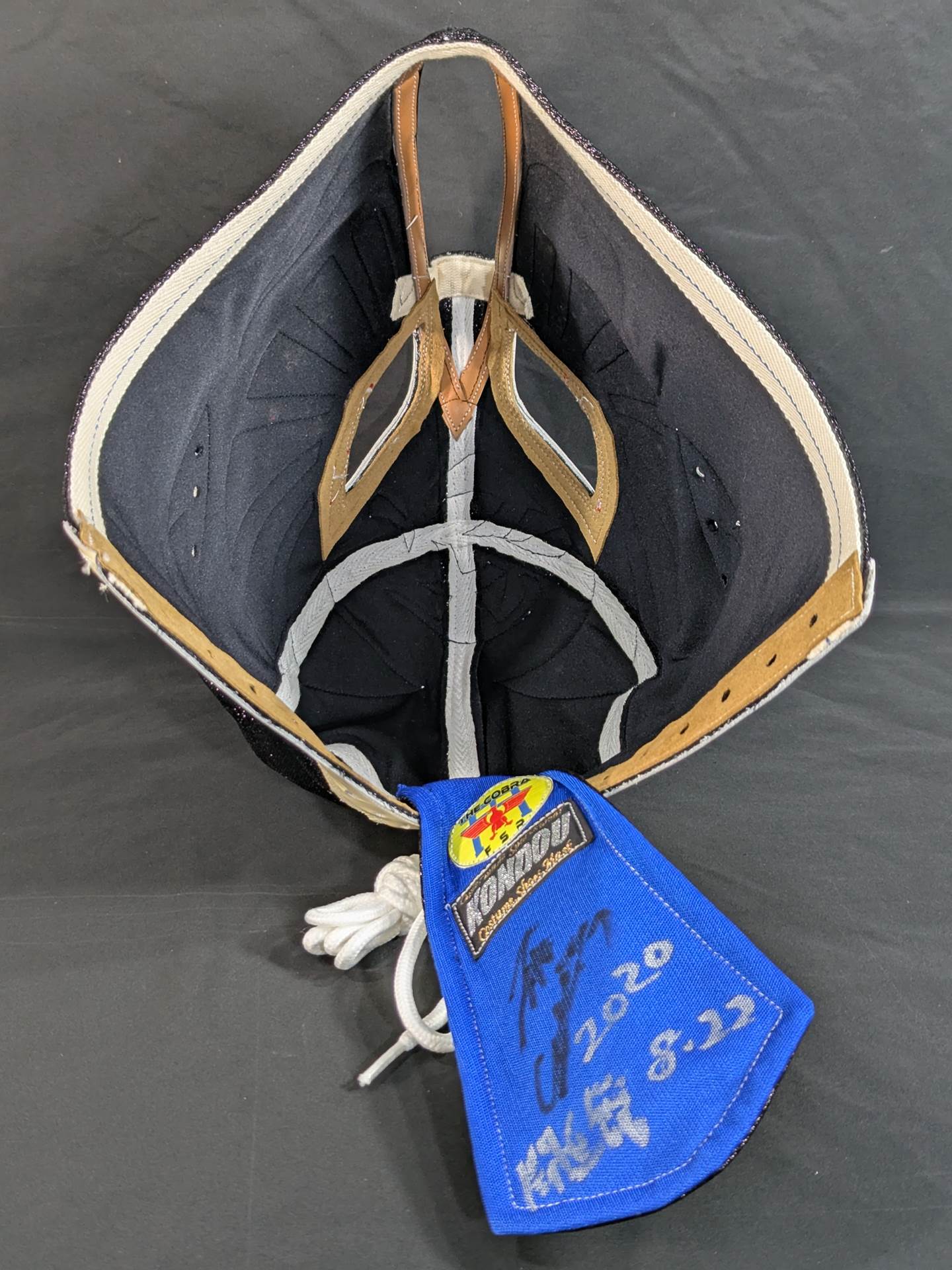 On August 22, 2020, the "Singing Cobra Landing! Mask used during the talk live of "Part 2" Signed (Toudoukan 2020.8.22) With ★wearing photo 85.10.18Korakuen type (Shiro Koshinaka War) ★ Black glitter double fabric pearl leather red leather edge "The Cobra HISTORY The Cobra is the creator of the Japan mask market Japan.