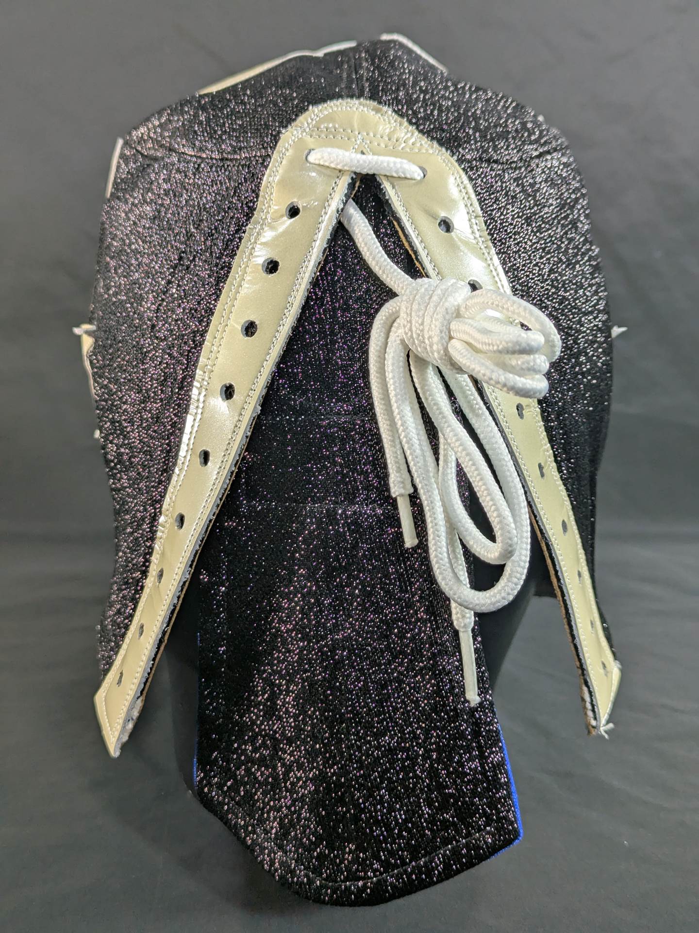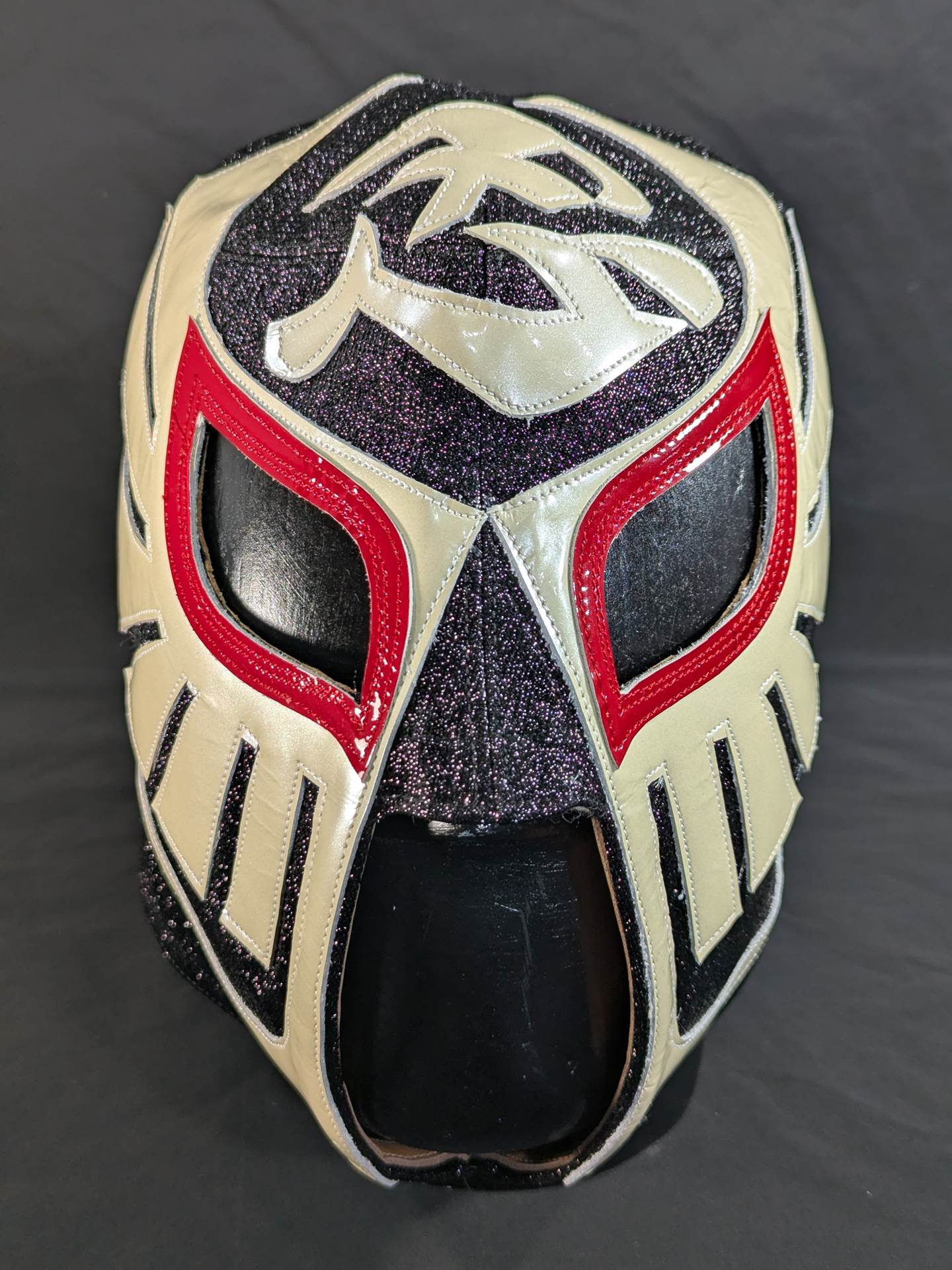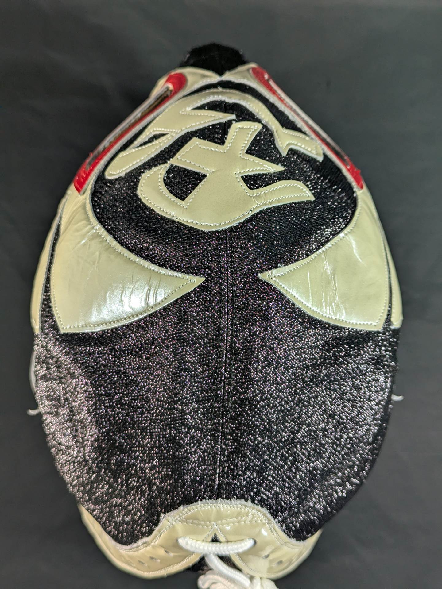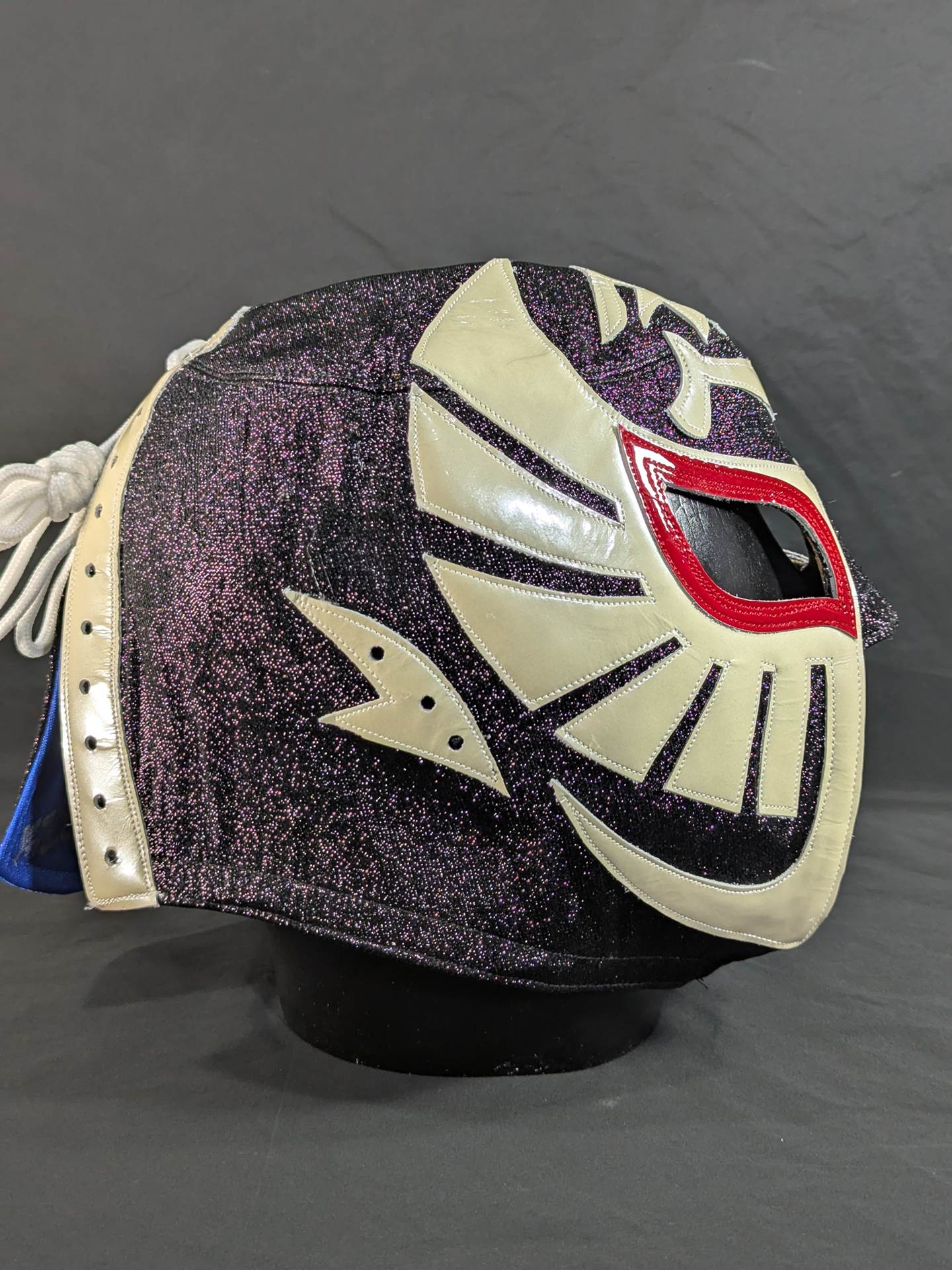 On August 22, 2020, the "Singing Cobra Landing! Mask used during the talk live of "Part 2" Signed (Toudoukan 2020.8.22) With ★wearing photo 85.10.18Korakuen type (Shiro Koshinaka War) ★ Black glitter double fabric pearl leather red leather edge "The Cobra HISTORY The Cobra is the creator of the Japan mask market Japan.