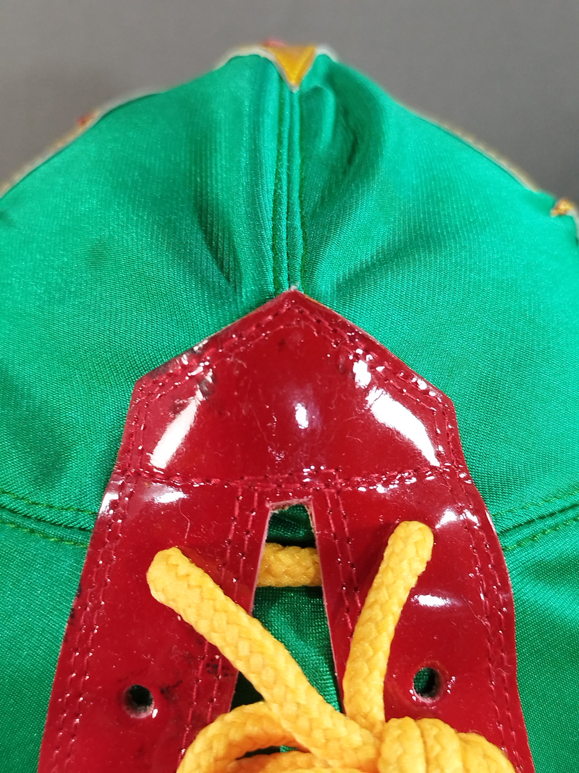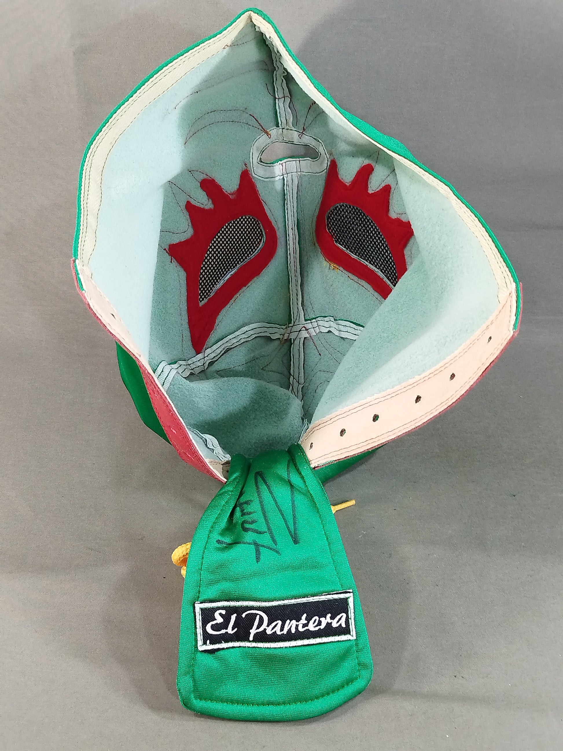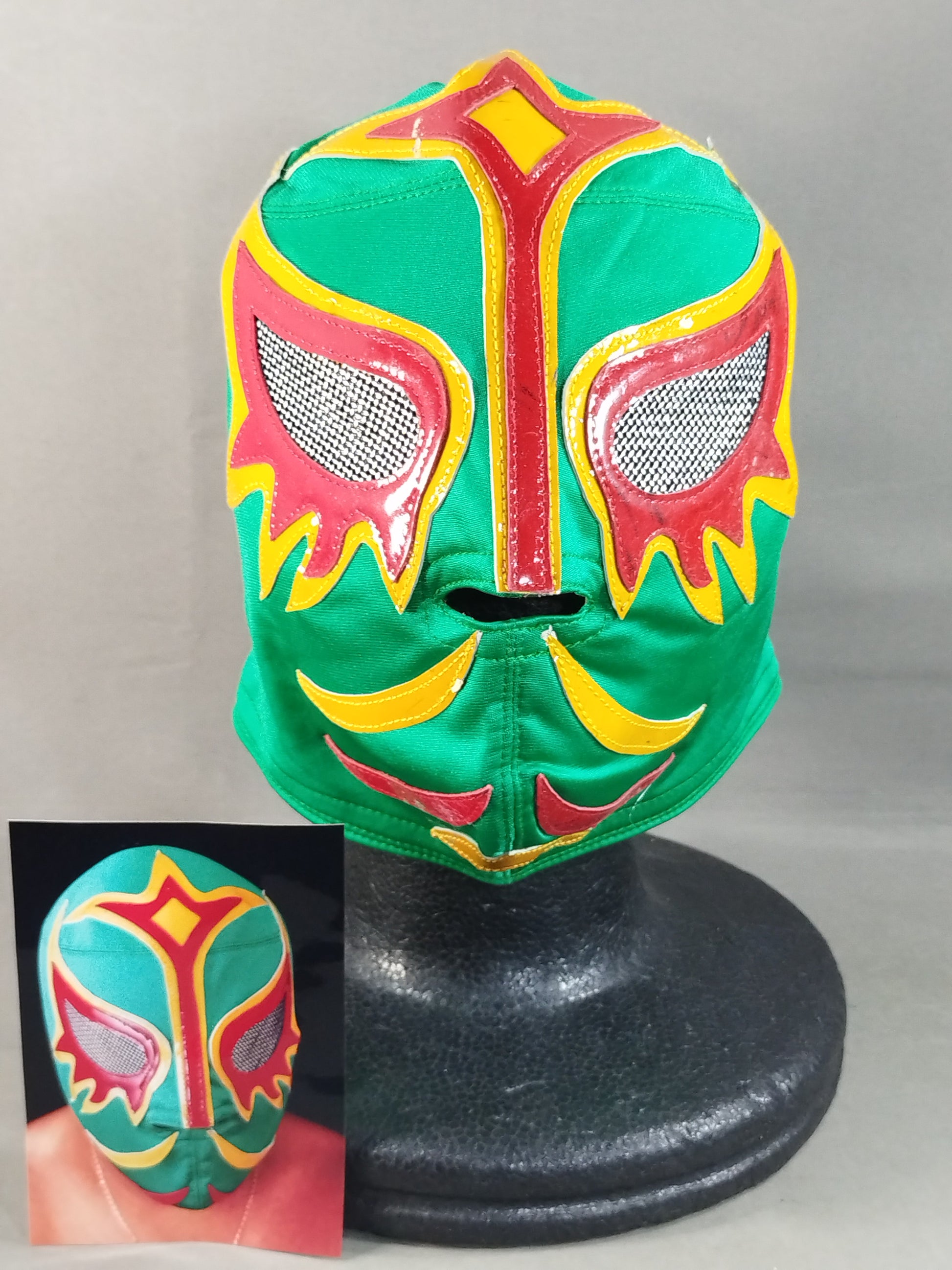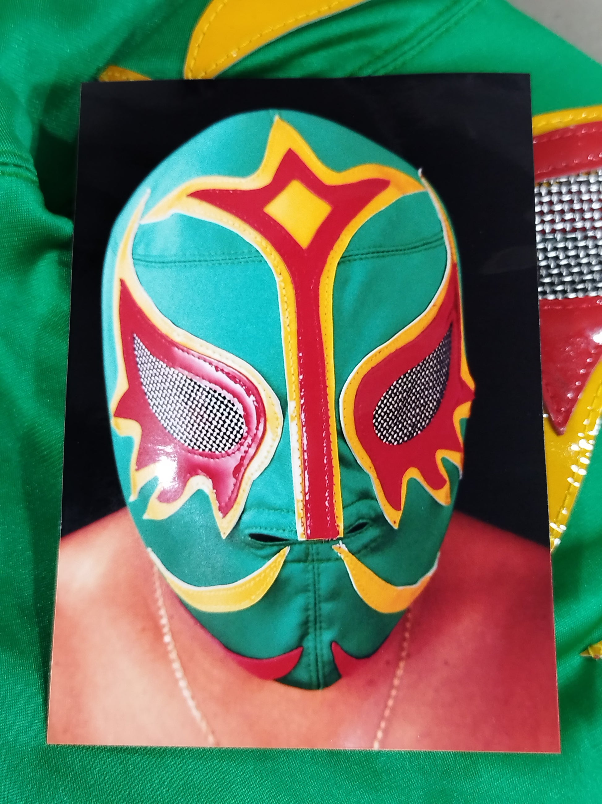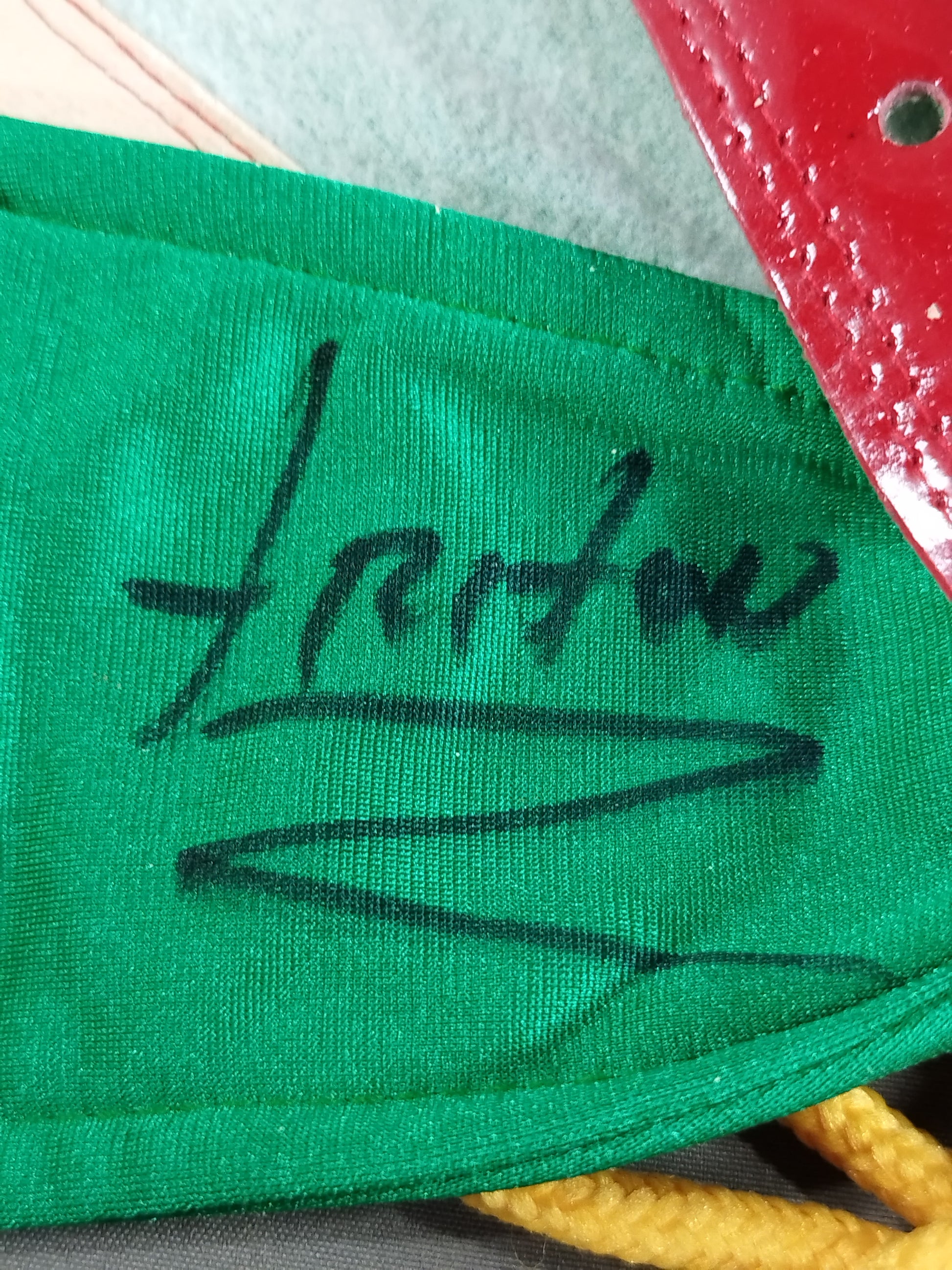 Signed with wearing photo Green Spore fabric yellow background red edge