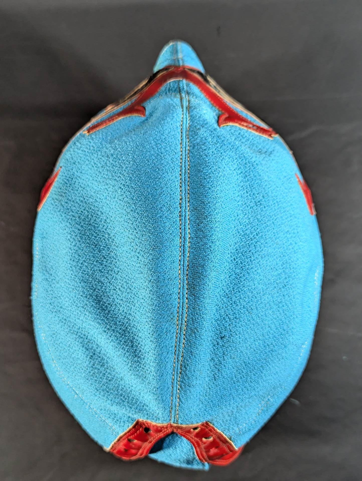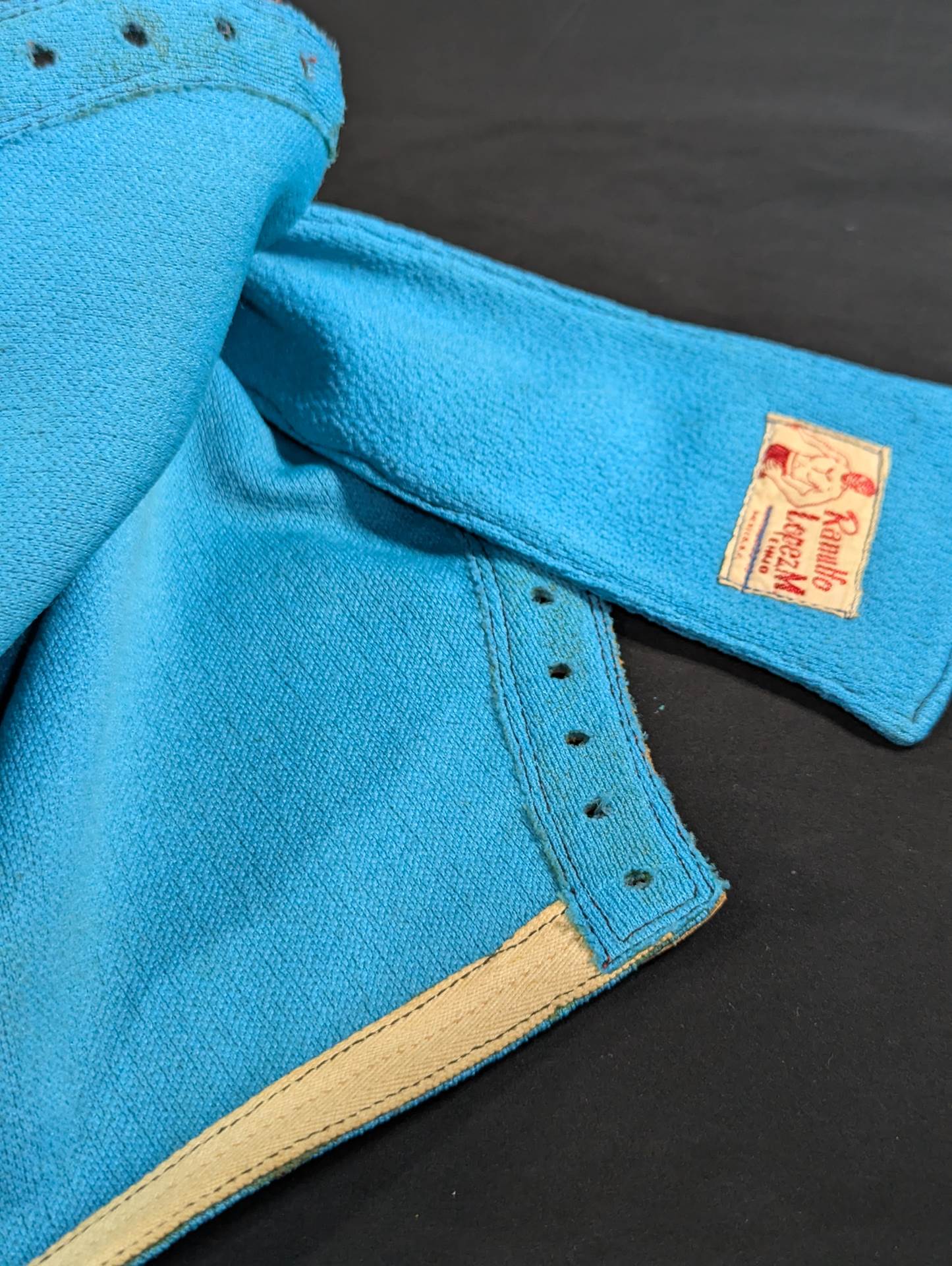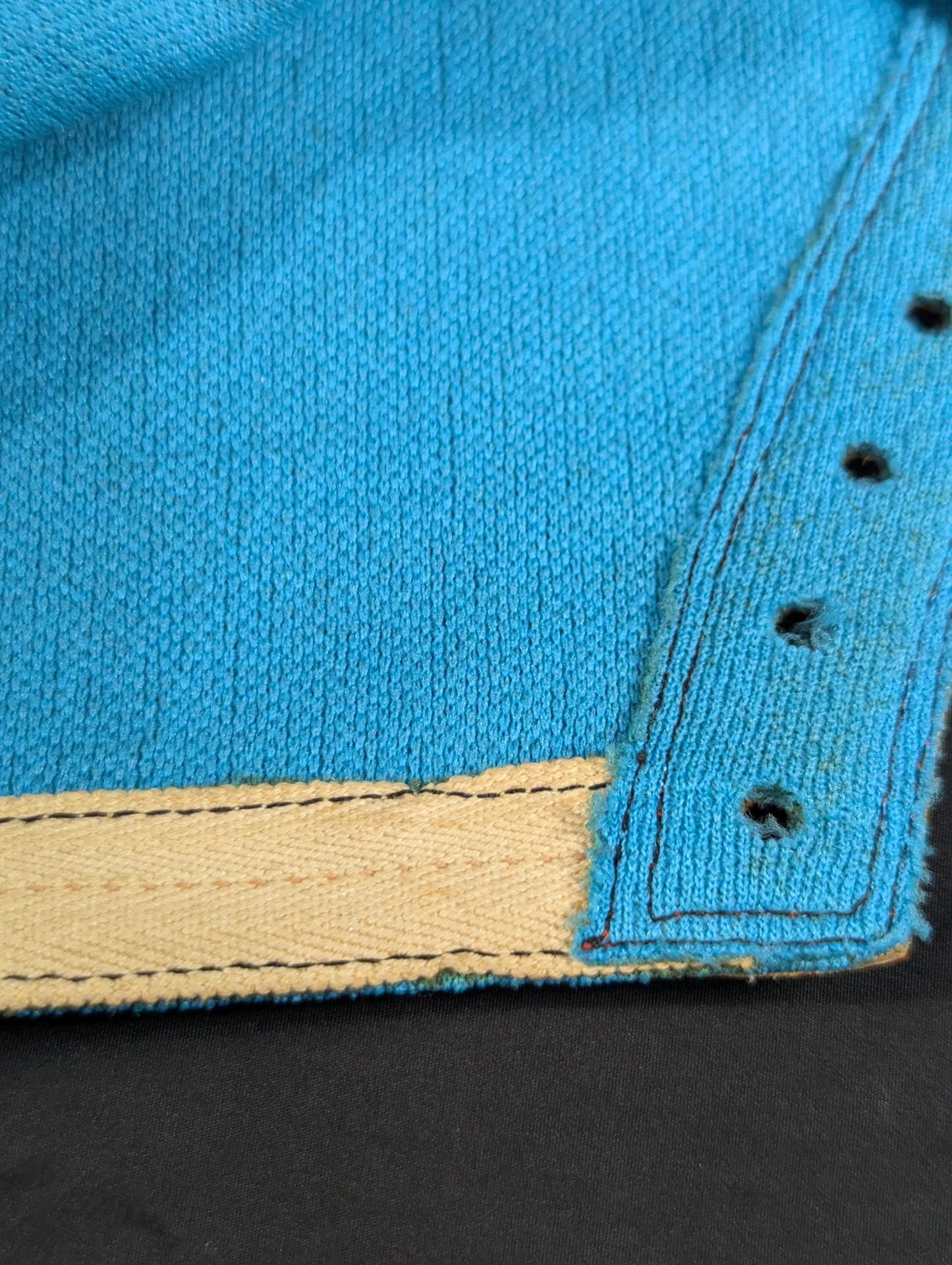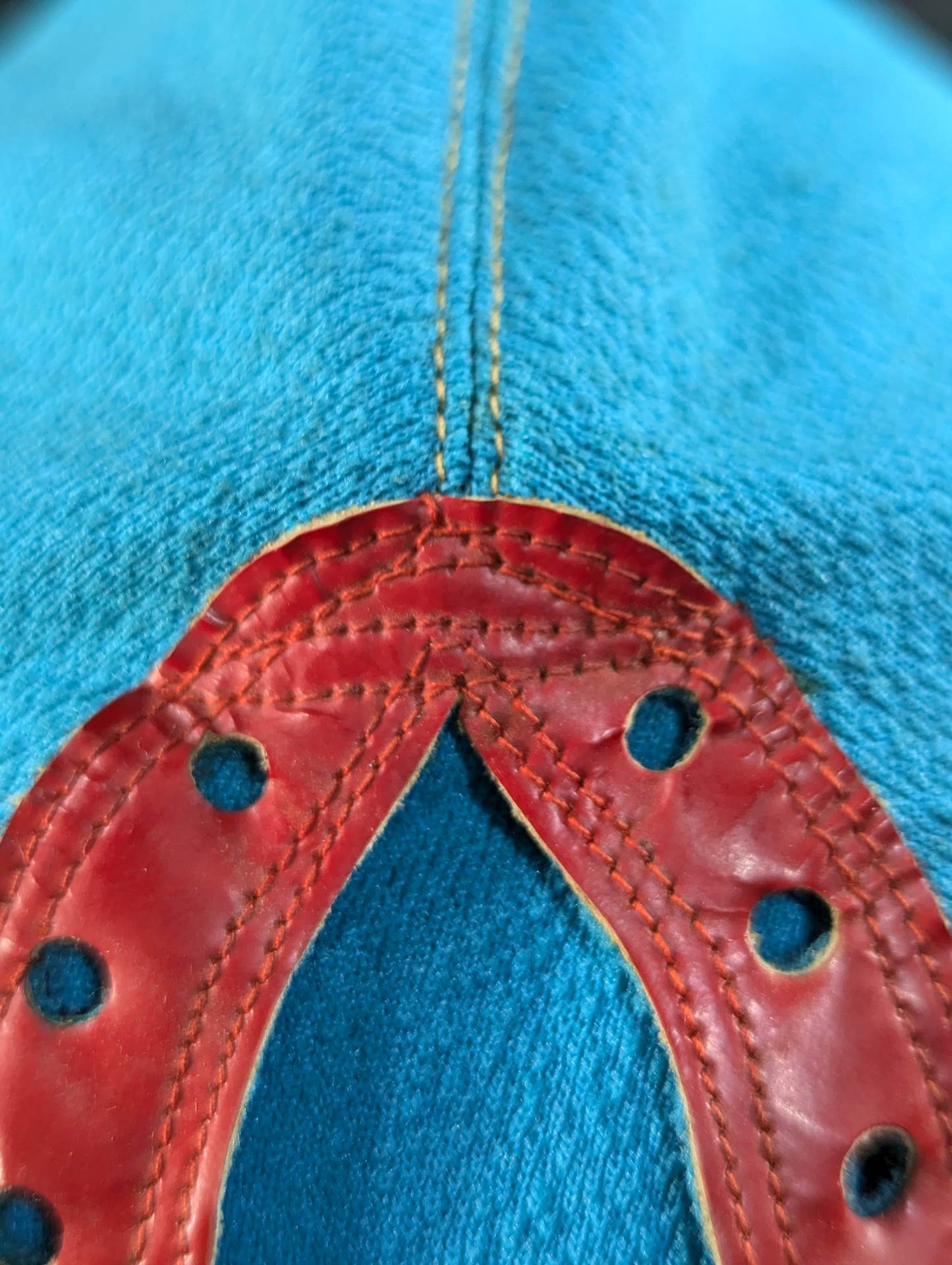 ★80s Original ★ Light Blue Telluren Jersey Fabric Black Leather Edge & Red Leather Edge Vero Made of the Same Material Throat Tape is 1.7cm Long Width and Light Brown Center Stitch No Lining There are 13 string holes on each side, made in the mid-1980s.
