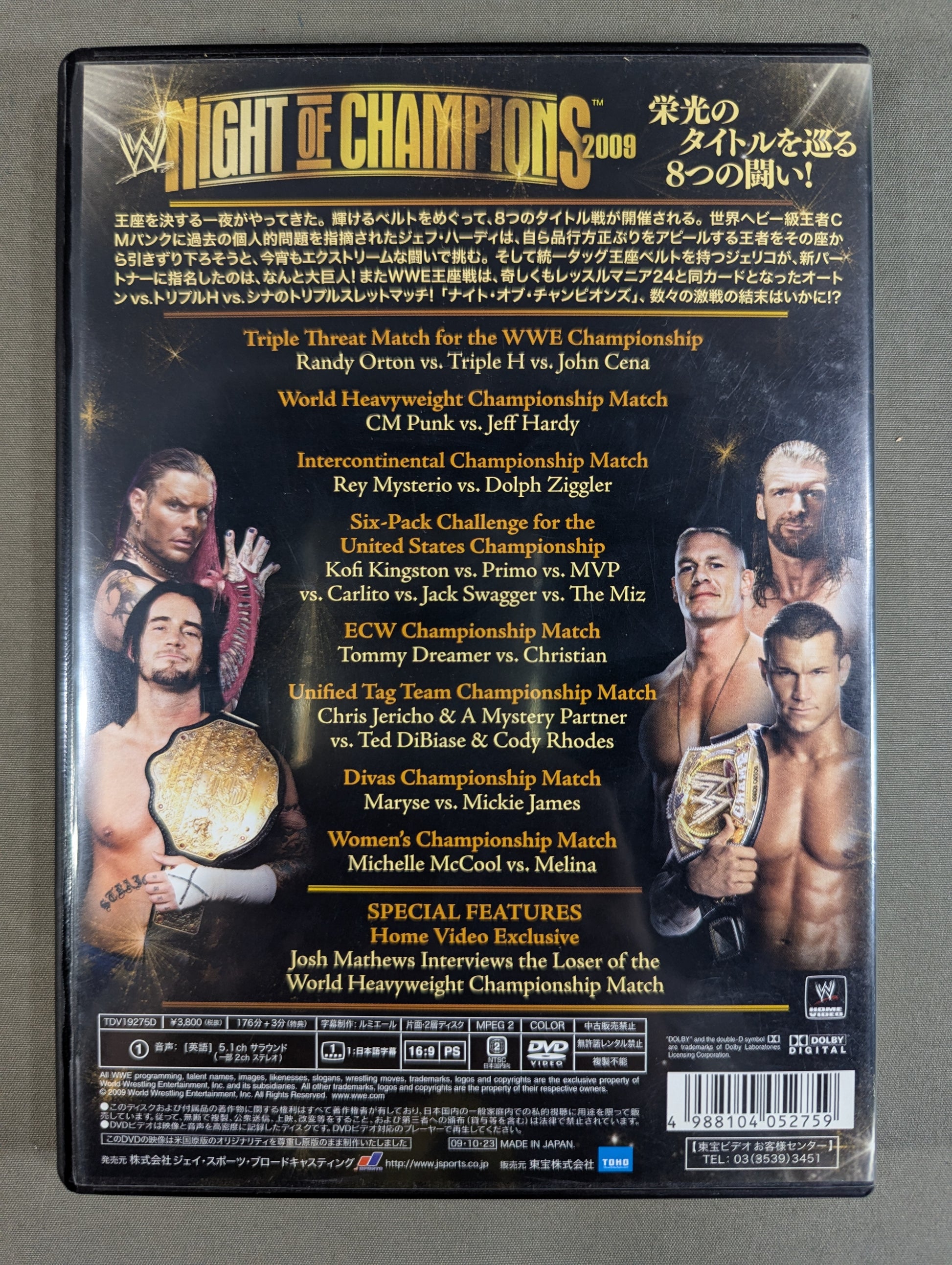 8 battles for the title of glory!! Night of Champions" DVD of the 2009 tournament! WWE Champion Randy Orton will challenge John Cena to a triple rubbing match against Triple H! The World Heavyweight Championship is a PPV full of gorgeous cards such as CM Punk vs. Jeff Hardy. Due to the absence of EDGE due to injury, pay attention to the new partner of unified tag team champion Chris Jericho !!