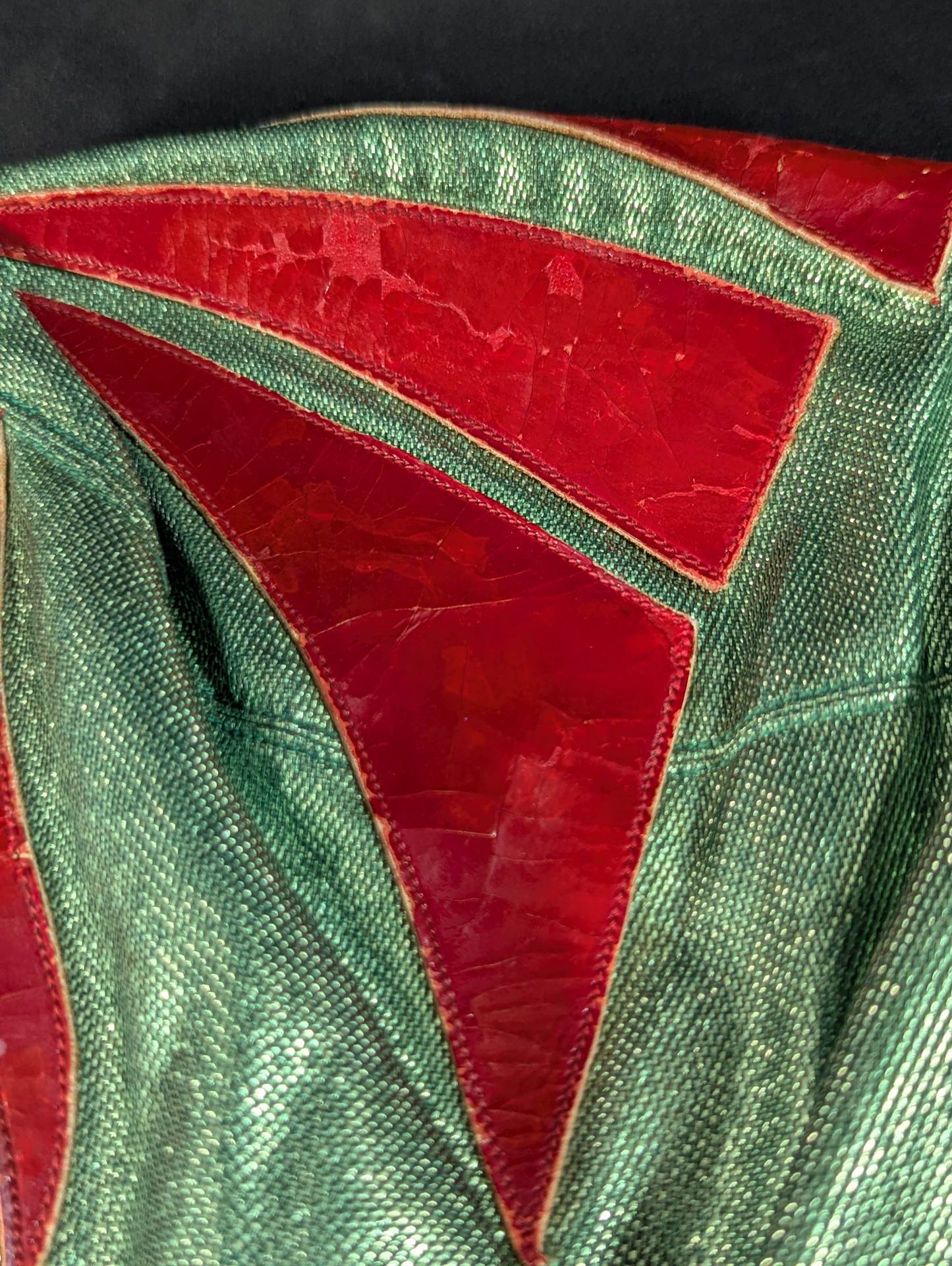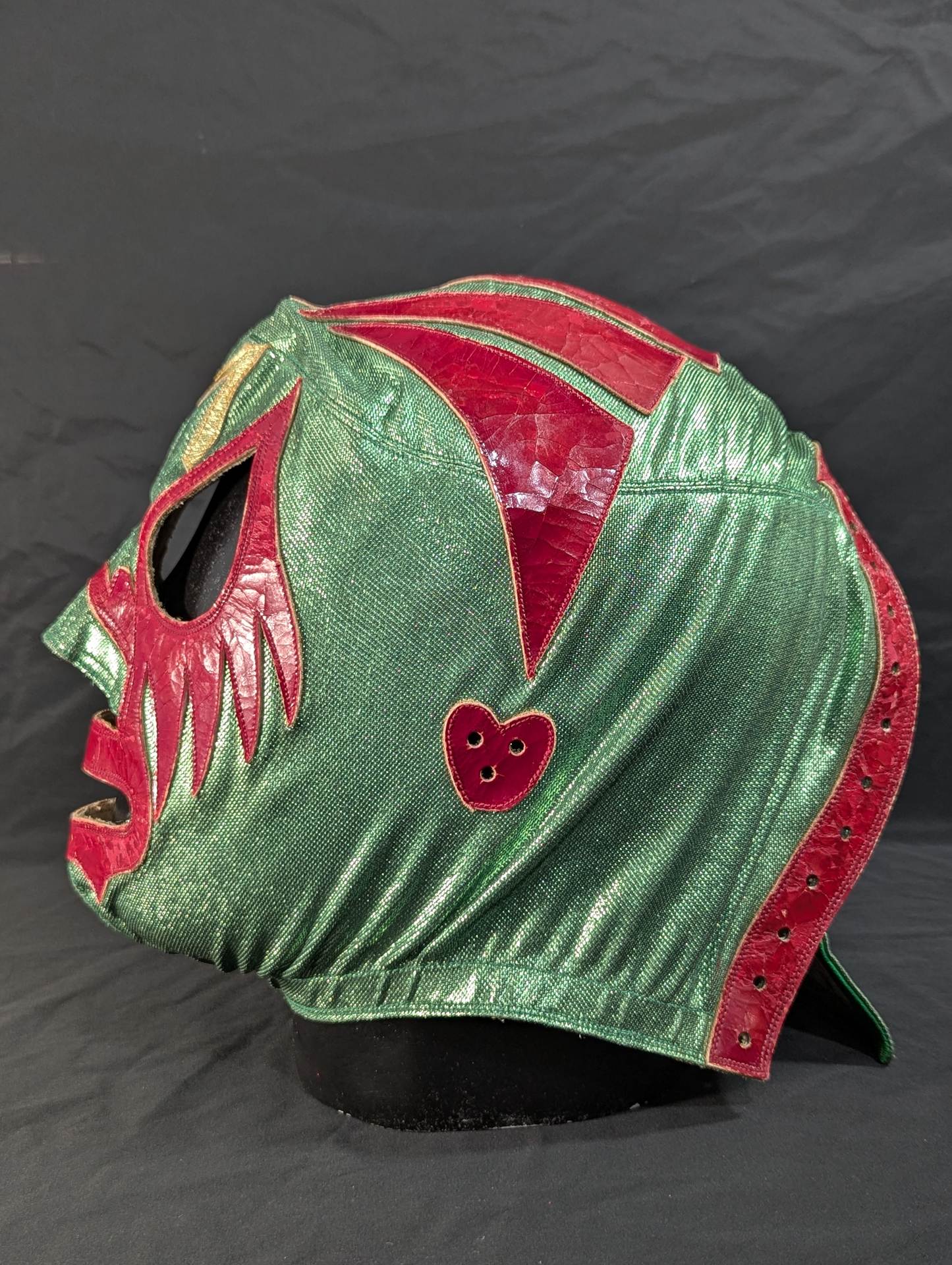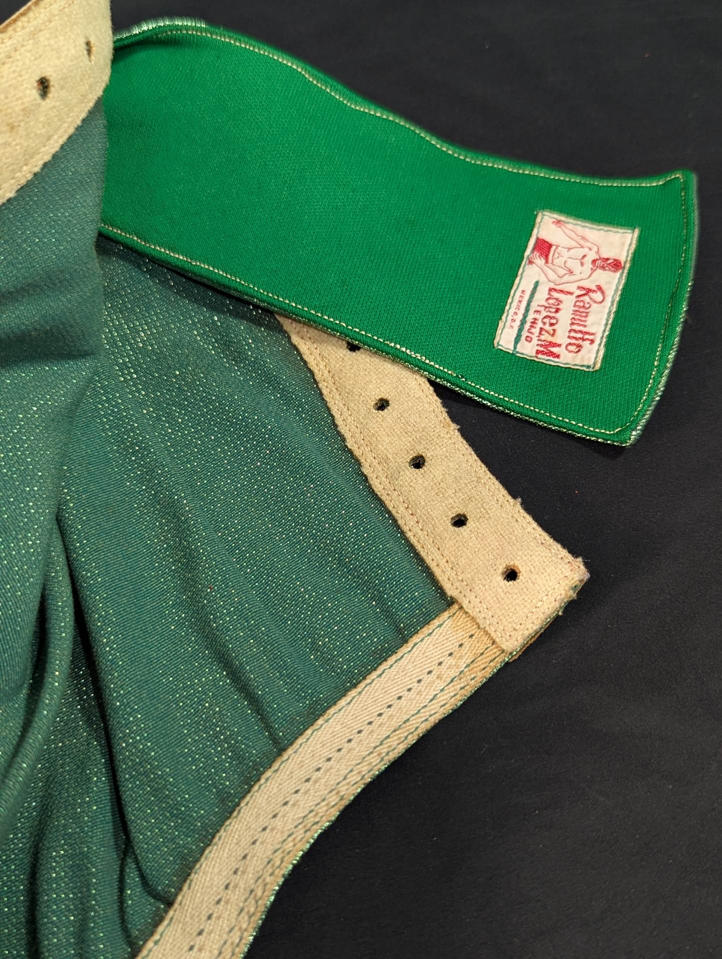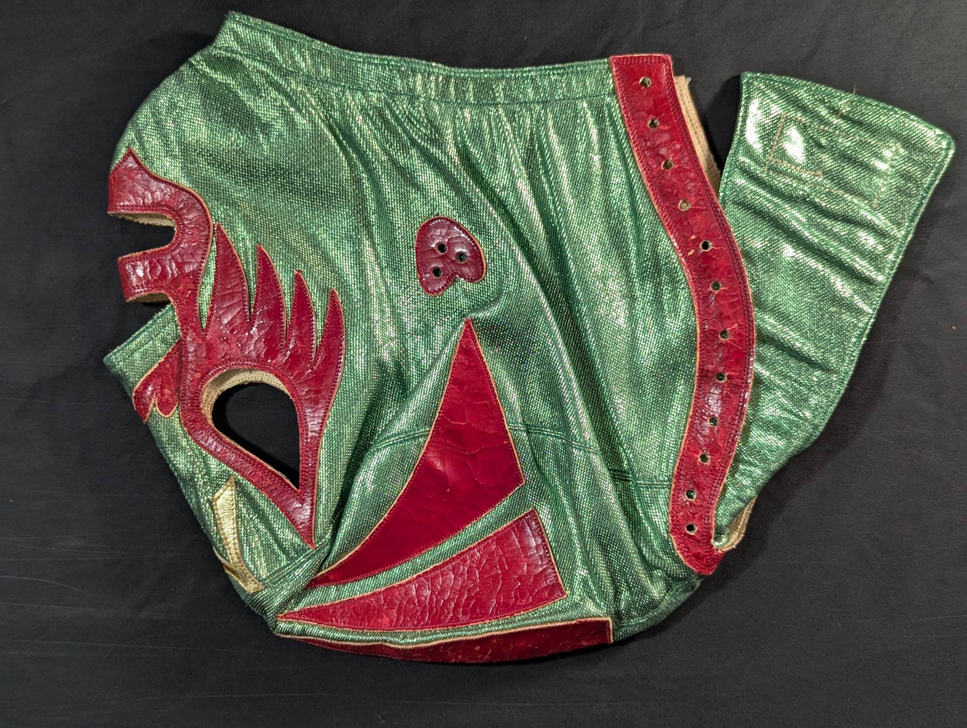 ★70s Original ★ Trade Type (Demon Eye) Green Rubber Glitter Red Leather Edge & Gold Leather edge Vero is made of the same material glitter and green jersey fabric The neck tape is 1.5 cm wide in height, with a green center stitch and one green stitch on the top and two on the bottom December 13, 1979, All Japan Pro Wrestling "Real World Tag League " On the last day of the "Tokyu Hotel, where he stayed, Mascaras himself gave it to his fans. "This is the destination!!" It is no exaggeration to say that the color scheme, rarity, difficulty of obtaining, and a super treasure class that only made a very small number of copies that met all of them, the phantom green rubber glitter made by Lopez ! !  Produced in the late 1970s