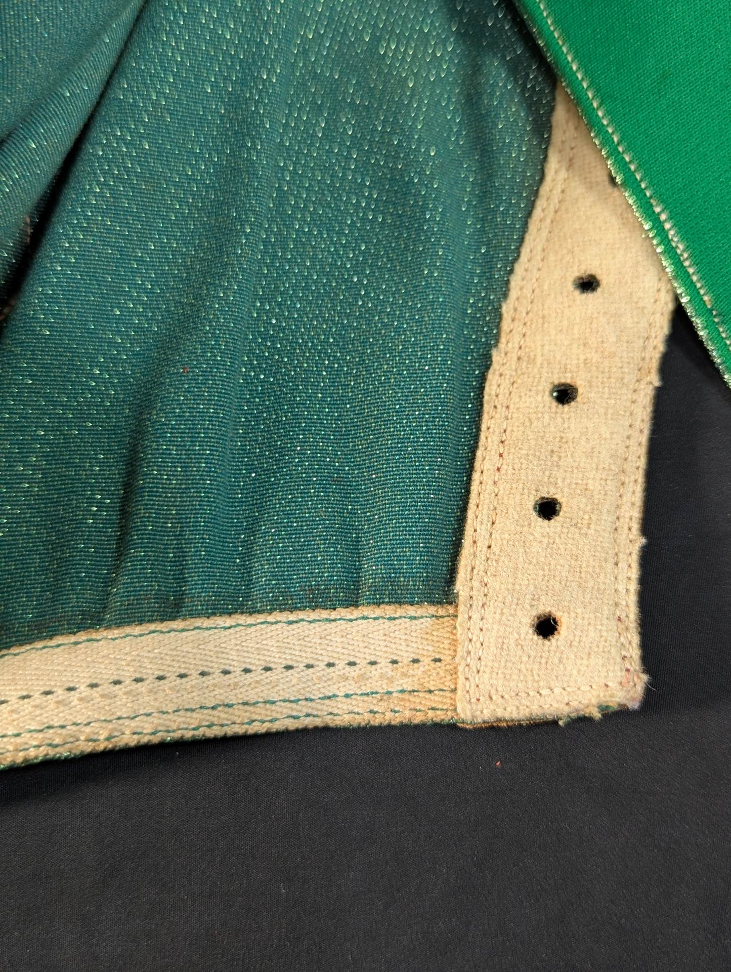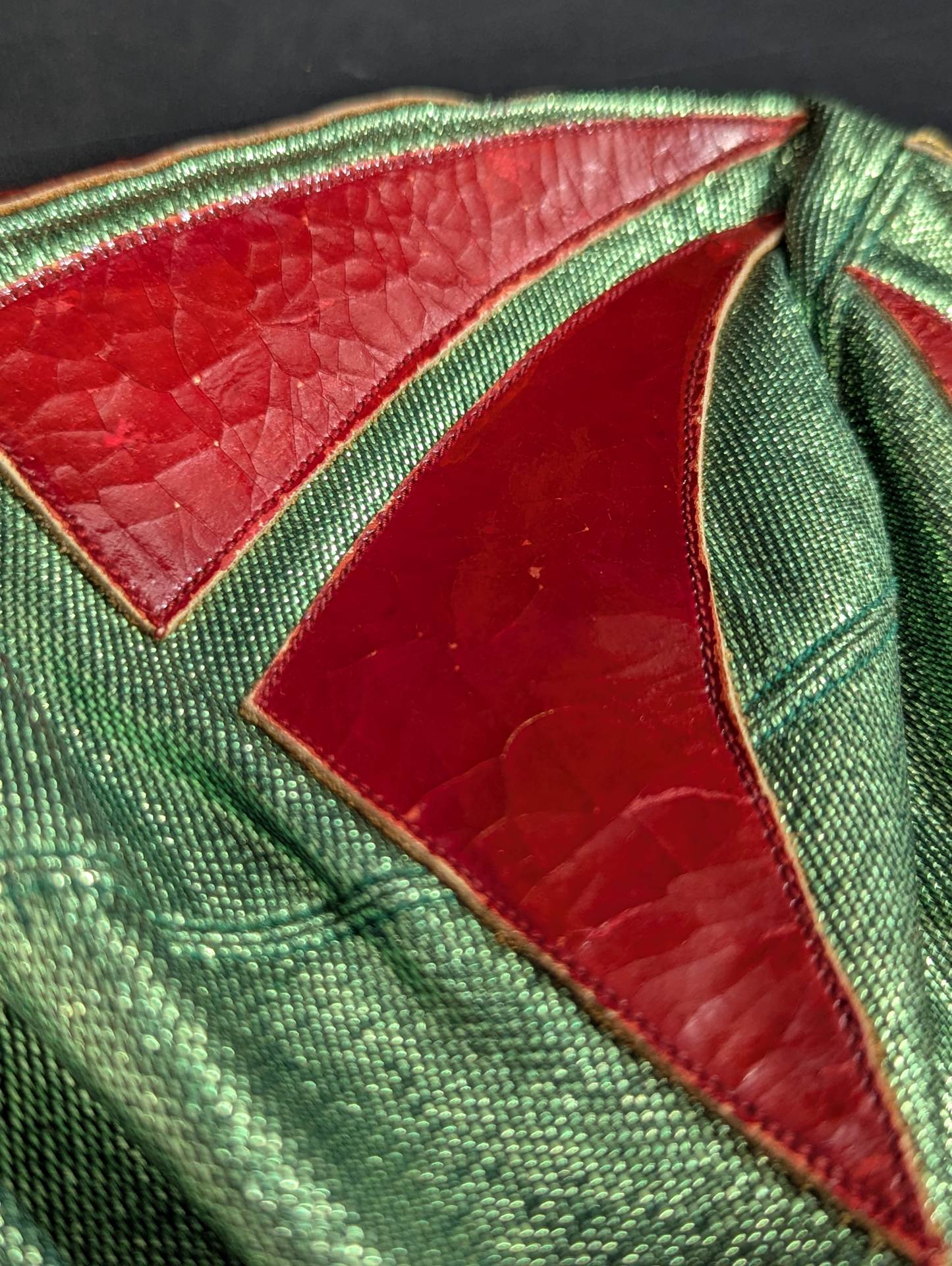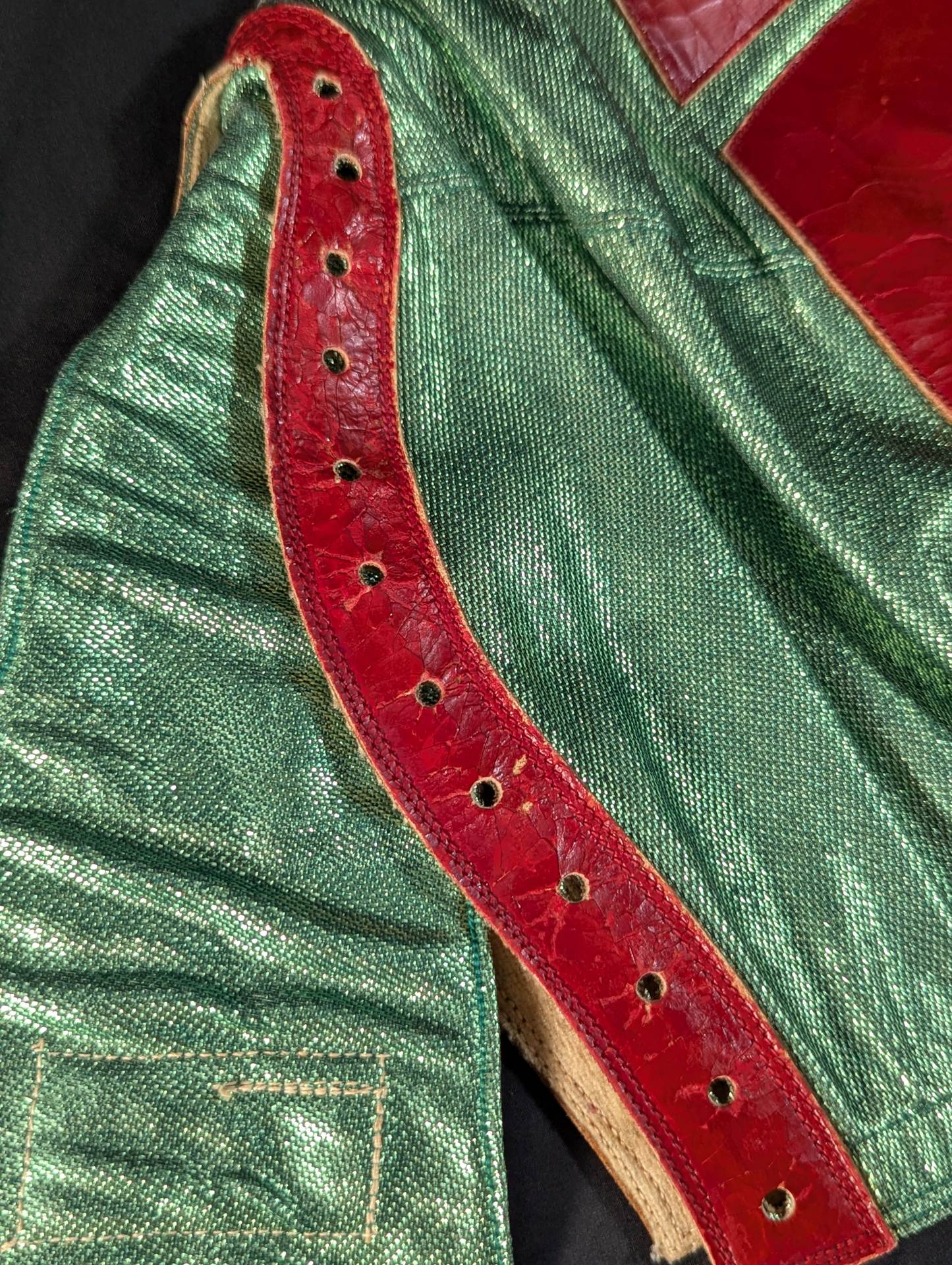 ★70s Original ★ Trade Type (Demon Eye) Green Rubber Glitter Red Leather Edge & Gold Leather edge Vero is made of the same material glitter and green jersey fabric The neck tape is 1.5 cm wide in height, with a green center stitch and one green stitch on the top and two on the bottom December 13, 1979, All Japan Pro Wrestling "Real World Tag League " On the last day of the "Tokyu Hotel, where he stayed, Mascaras himself gave it to his fans. "This is the destination!!" It is no exaggeration to say that the color scheme, rarity, difficulty of obtaining, and a super treasure class that only made a very small number of copies that met all of them, the phantom green rubber glitter made by Lopez ! !  Produced in the late 1970s