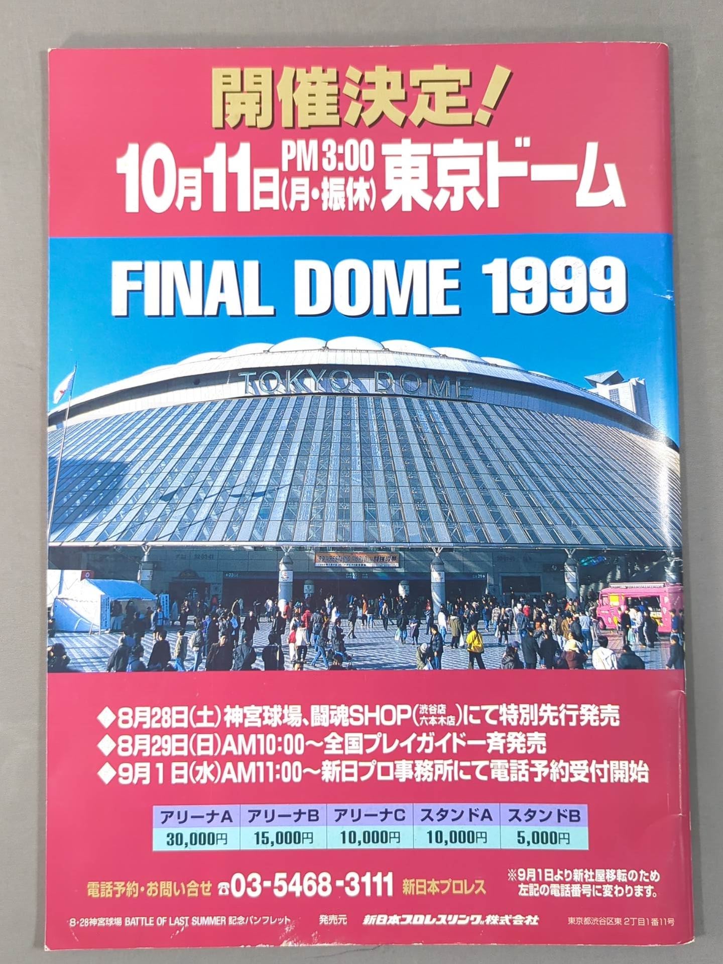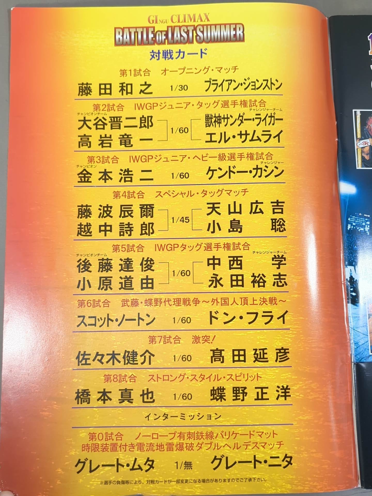 Venue: Jingu Stadium / list of the matches is printed : [No rope Barbed Wire Barricade Mat Time Limit Device with Electric Mine Blasting Double Helldeath Match] Great Muta vs Great Nita / Masahiro Chono vs Shinya Hashimoto / Kensuke Sasaki vs Nobuhiko Takada / Scott Norton vs Don Frye