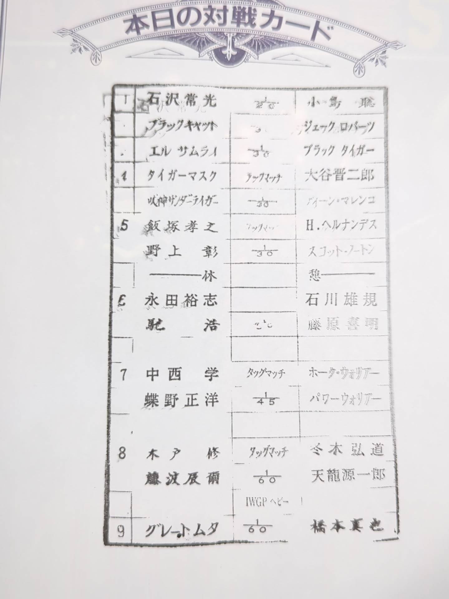 Venue: Aichi Prefectural Gymnasium / stamped with list of matches : [IWGP Heavyweight Fighters Right] Great Muta vs Shinya Hashimoto * Hashimoto's first crown / Tatsumi Fujinami & Osamu Kido vs Tenryu Genichiro &Kodo Fuyuki / G1 Climax Special