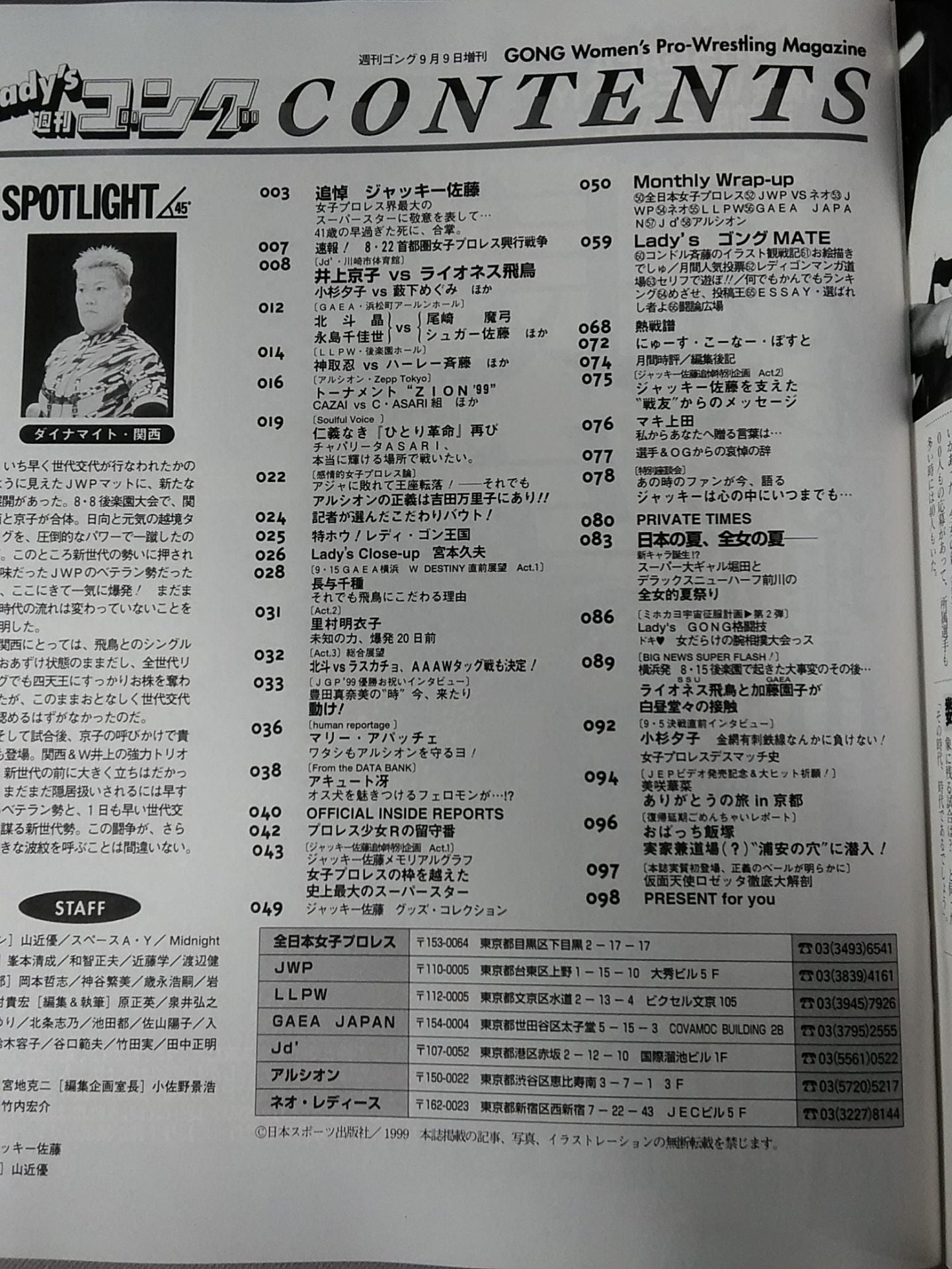1999年 追悼”かけめぐる青春” ジャッキー佐藤にこの一冊を捧ぐ・・・ 京子vs飛鳥は60分時間切れ!8.22興行戦争速報 表紙:ジャッキー佐藤