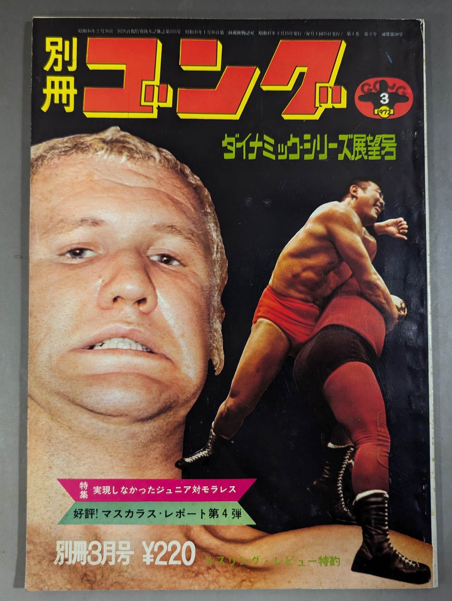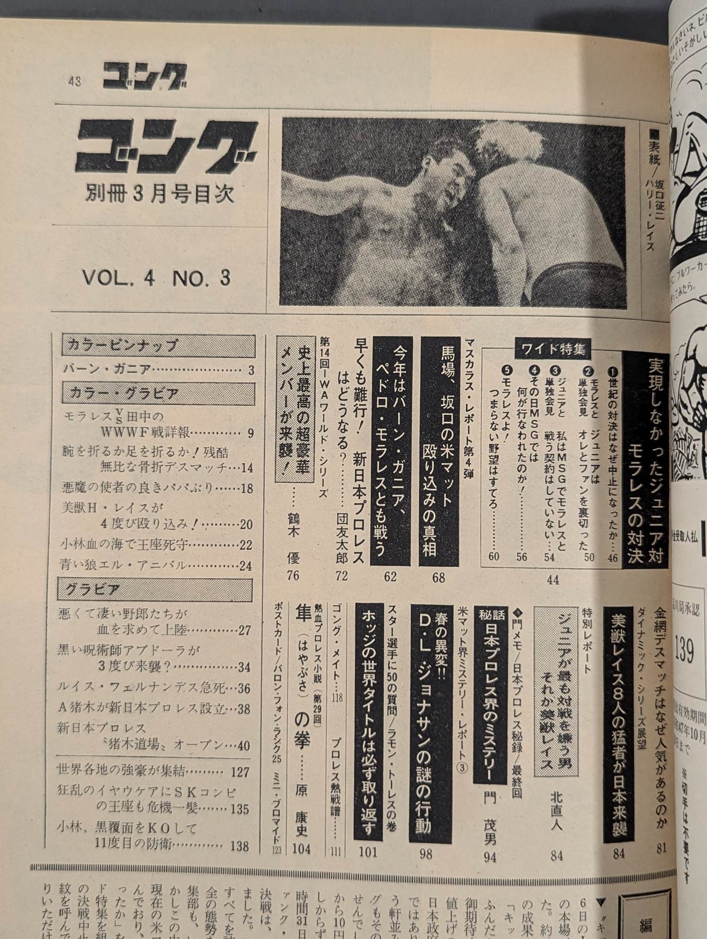 Dynamic Series Outlook Issue / Special Feature: Junior vs. Morales that did not come true / Popular! Mascaras Report Vol.4 / [Appendix] ◯ Pin-up (Verne Gagne ) ○ Postcard (Baron von Rasik) ◯ Mini Promide (Dynamic Series Feature) ×Jumbo Pin-Up (Mascaras Brothers) / Cover: Seiji Sakaguchi, Harley Race