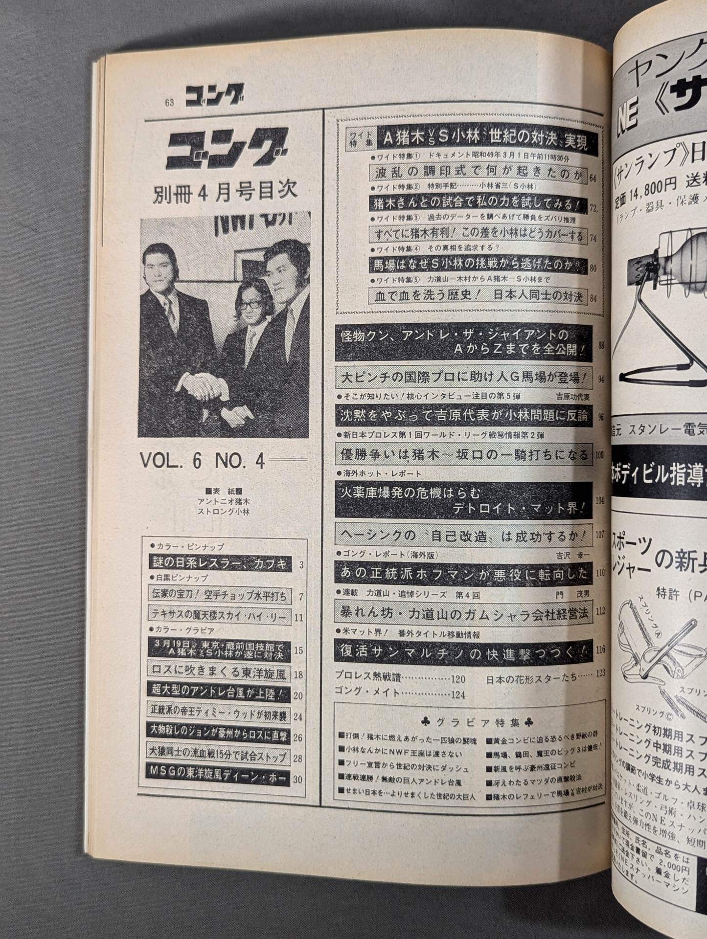A. Inoki vs. S Kobayashi! The showdown of the century has been realized! ○ Color Pin-up: Kabuki vs. Raul Mata ○ Black and White Pin-up: Rikidozan ○ Black and White Pin-up: Sky High Lee Cover: Antonio Inoki , Strong Kobayashi