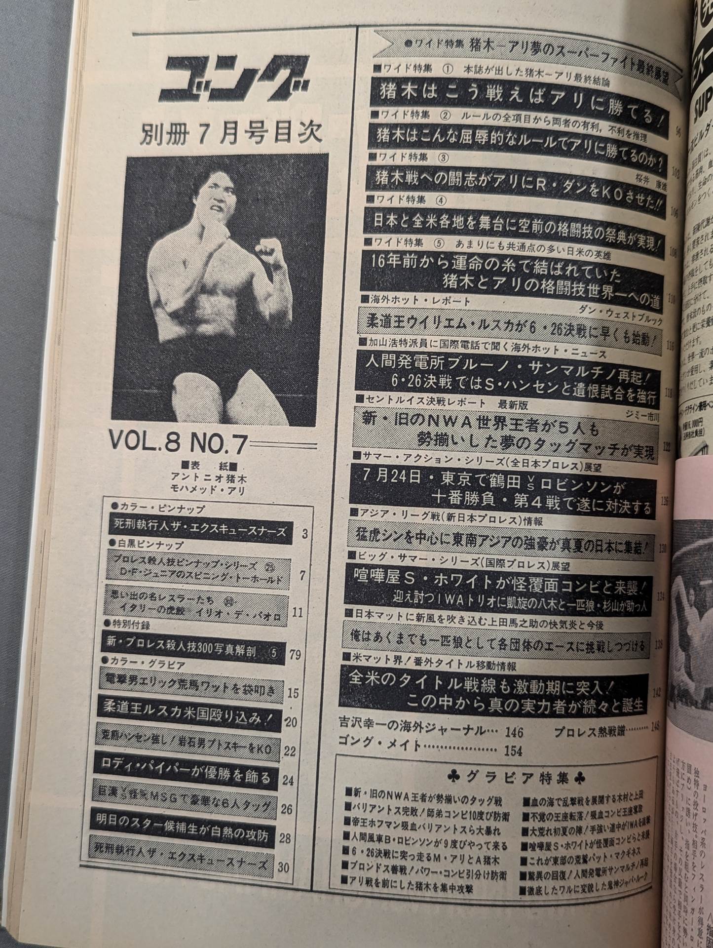 Wide Feature: Inoki -Ali Final Outlook ・St. Louis Decisive Battle Report ・3 promotion Early Summer Series Detailed Report / [Appendix] ○ Color Pin-Up: The Excuse ○ Black and White Pin-Up: Pro Wrestling Killer Pin-Up Series 25 ○ Black and White Pin-up: Ilio De Paolo ○ Special Appendix: New Pro Wrestling 300 photo Anatomy / Cover: Antonio Inoki , Muhammad Ali
