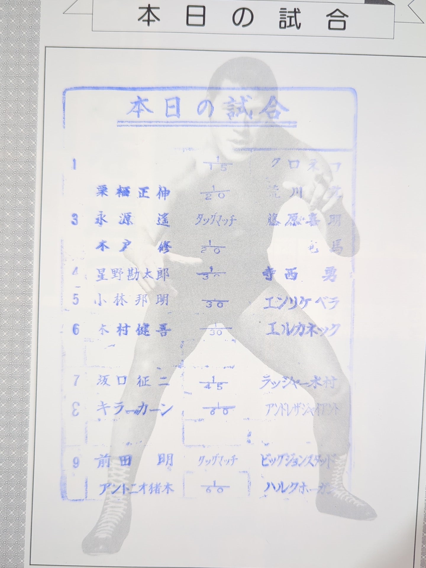 Venue: Aichi Prefectural Gymnasium / stamped with list of matches : Antonio Inoki & Akira Maeda vs. Hulk Hogan & Big John Stud / [Official Match] Killer Khan vs. Andre the Giant / [Appendix] ◯ Poster, ◯ Sticker / '83 IWGP (1st IWGP Final League)