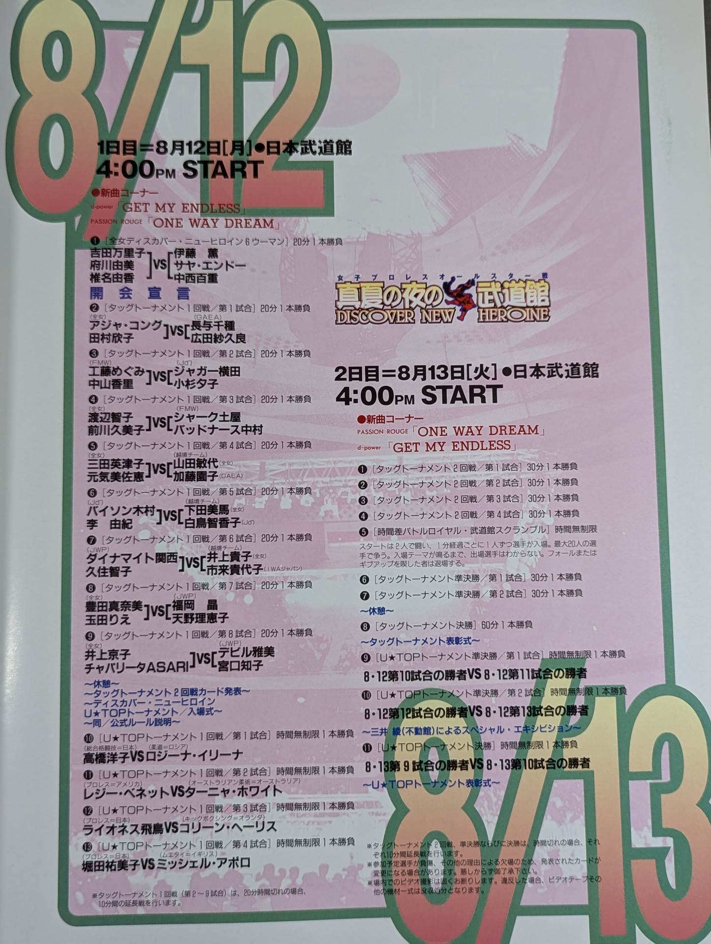 Venue: Japan Budokan / list of the matches is printed: August 12 Yumiko Hotta vs Michelle Apollo / August 13 [U★TOP Tournament Final]