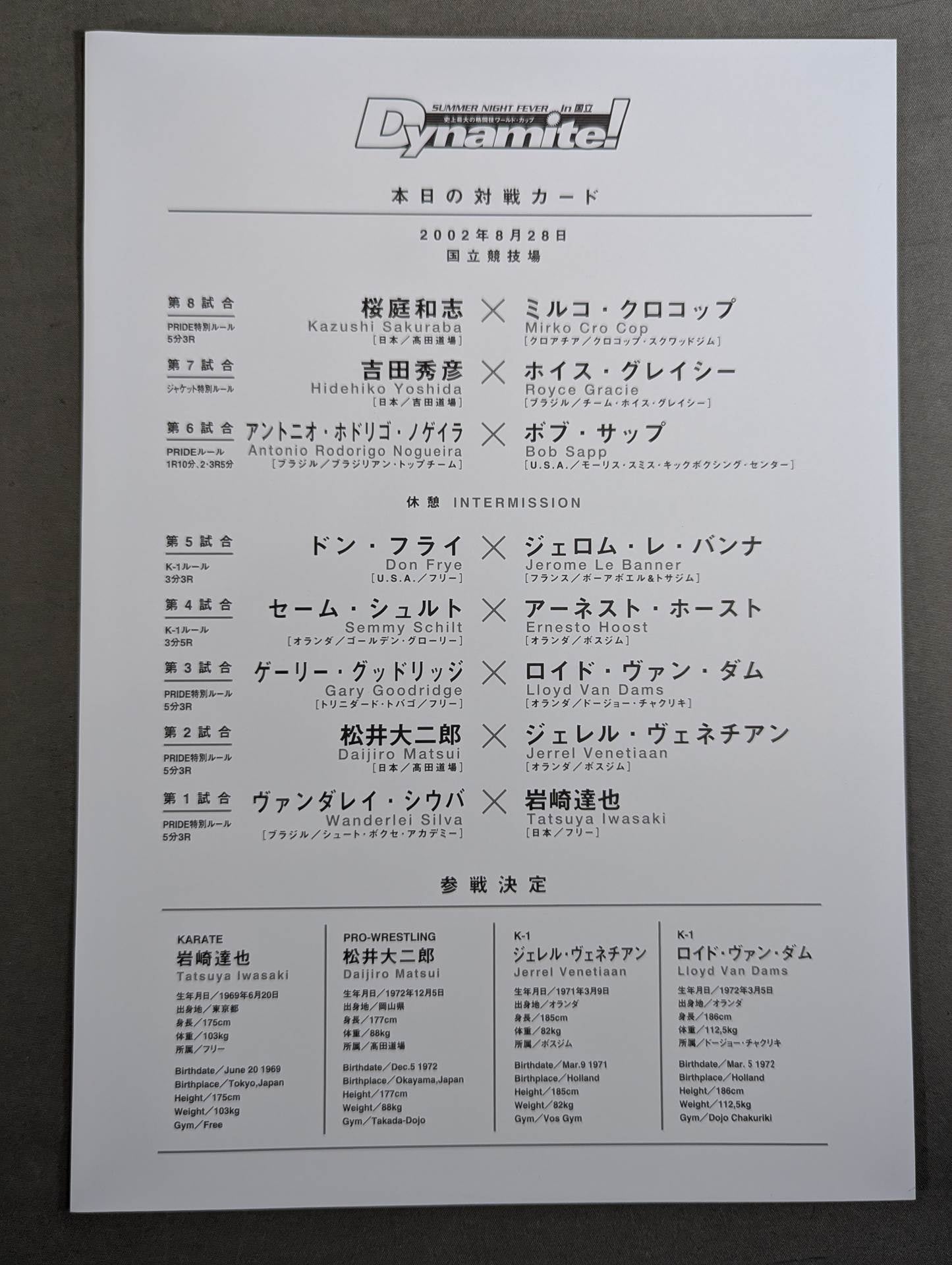 Venue: Japan National Stadium / list of the matches on the separate sheet : Kazushi Sakuraba vs Mirko Cro Cop / Hidehiko Yoshida vs Royce Gracie / Antonio ・Rodrigo Nogueira vs Bob Sapp DYNAMITE! / Dynamite! Summer Night Fever Inn National