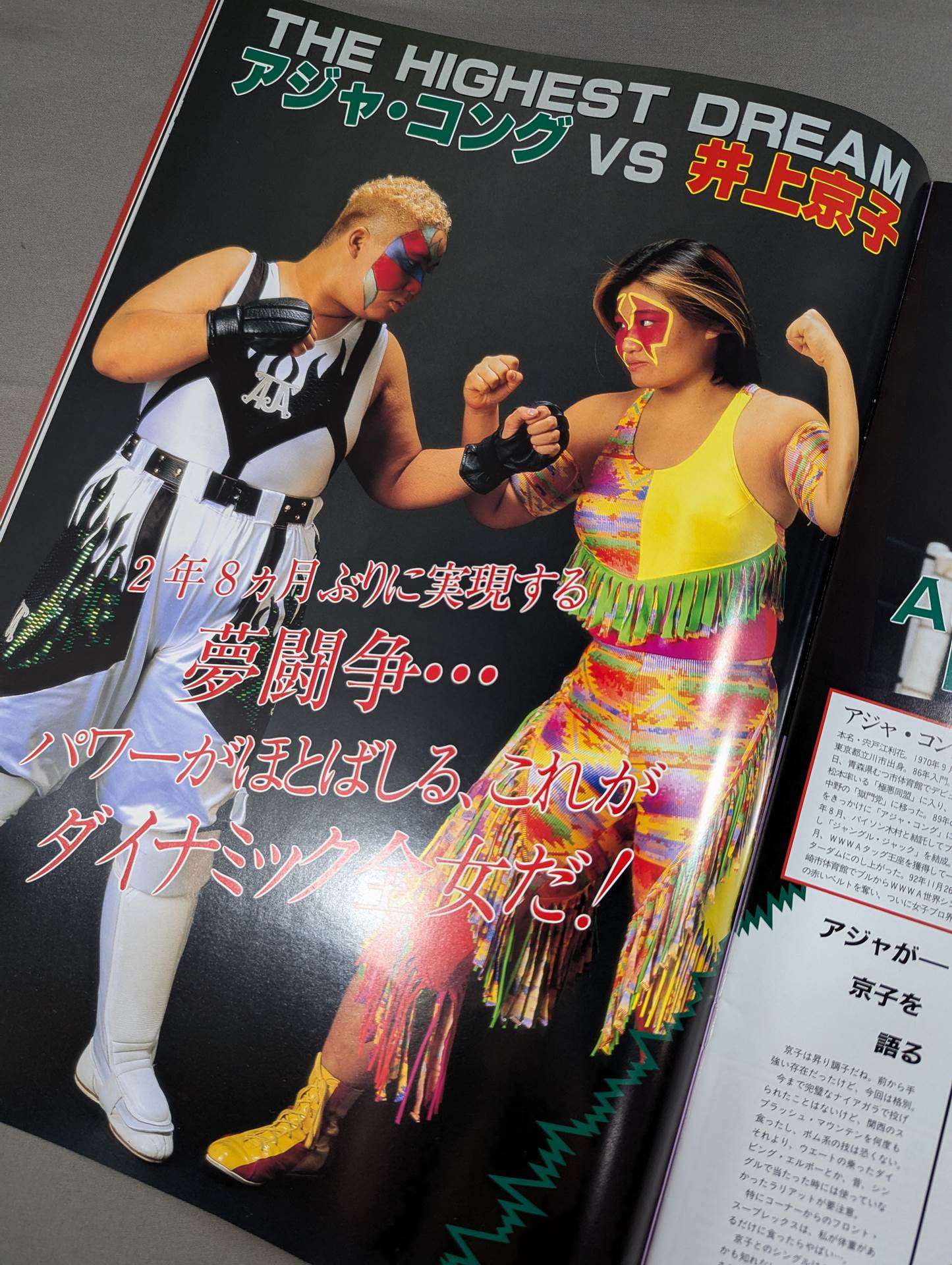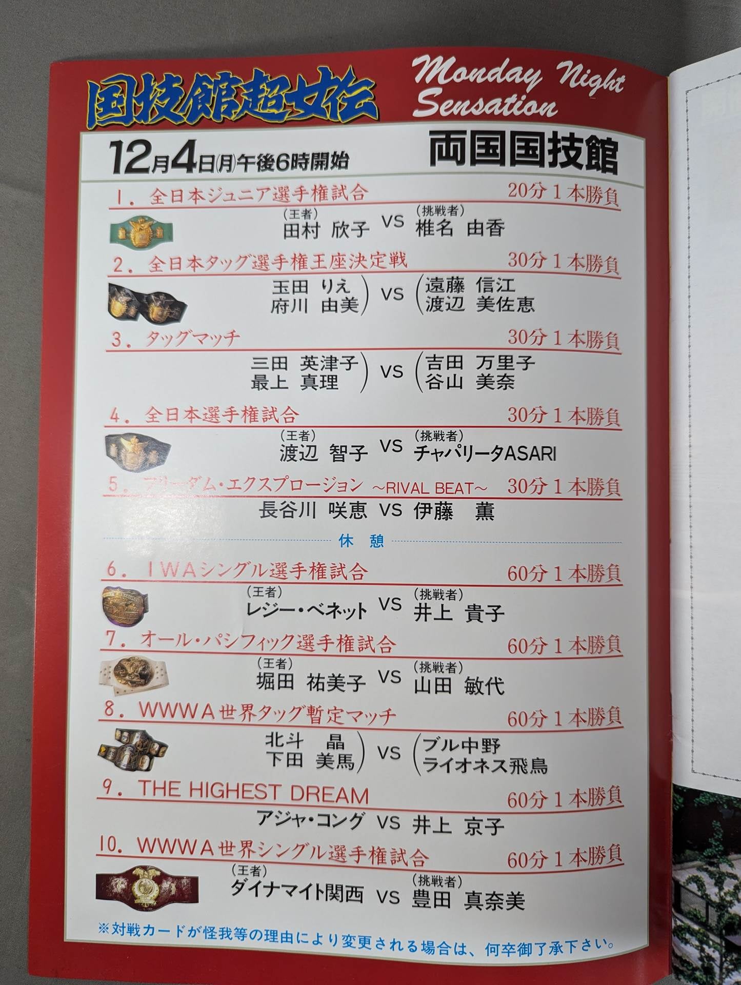 Venue: Ryogoku / list of the matches is printed : [WWWA World Singles fighters Right] Dynamite Kansai vs Manami Toyota / Aja Kong vs Kyoko Inoue / [ WWWA World Tag Team Provisional Match] Akira Hokuto & Mima Shimoda vs Lioness Asuka & Bull Nakano / [All Pacific fighters ] Title match] Yumiko Hotta vs Toshiyo Yamada / [IWA Single fighters] Reggie Bennett vs Takako Inoue