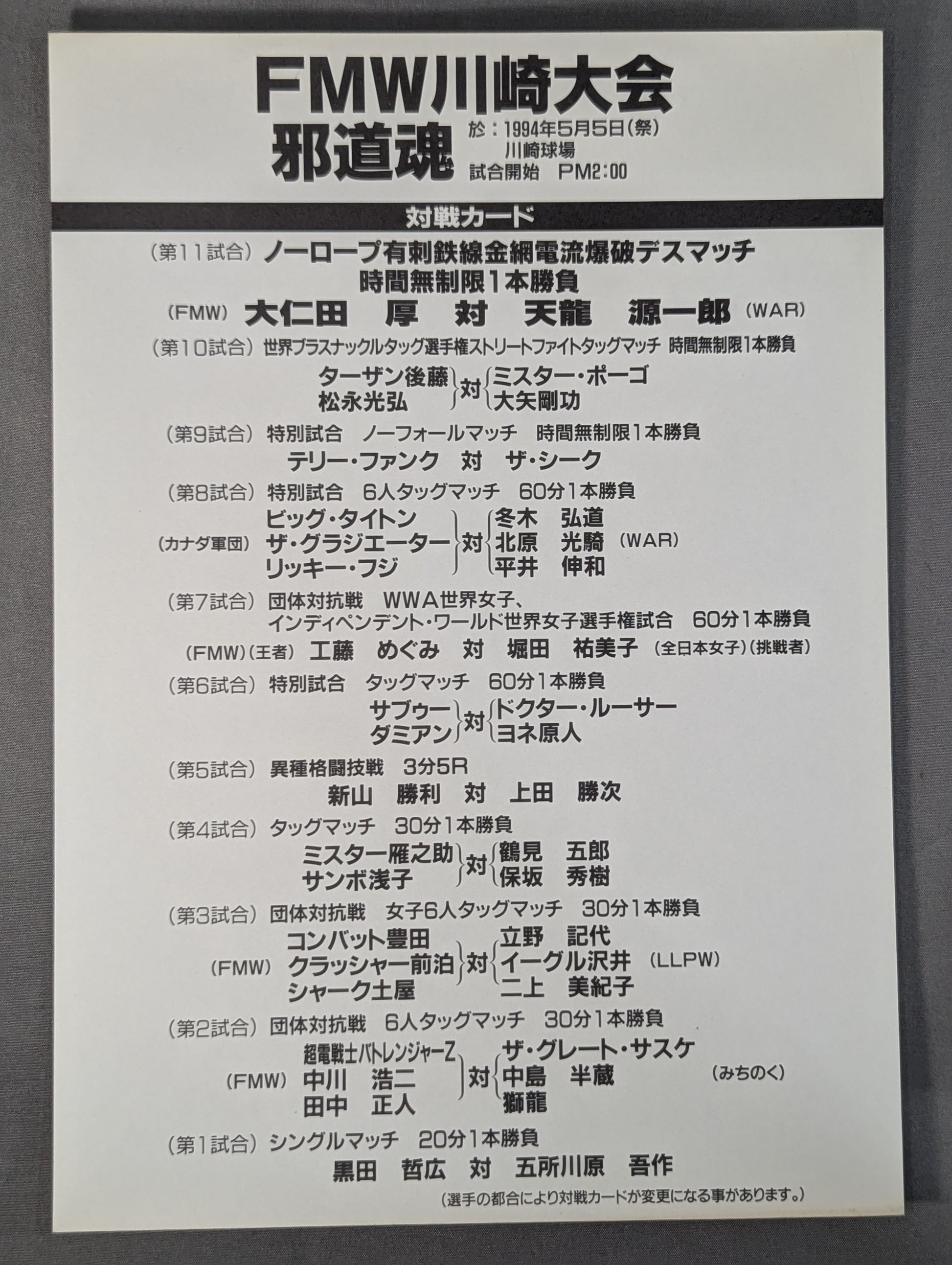 Venue: Kanagawa / Kawasaki Stadium / list of the matches on the separate sheet Available: [No rope Barbed Wire Explosion Deathmatch] Atsushi Onita vs Tenryu Genichiro / Terry Funk vs The Sheik