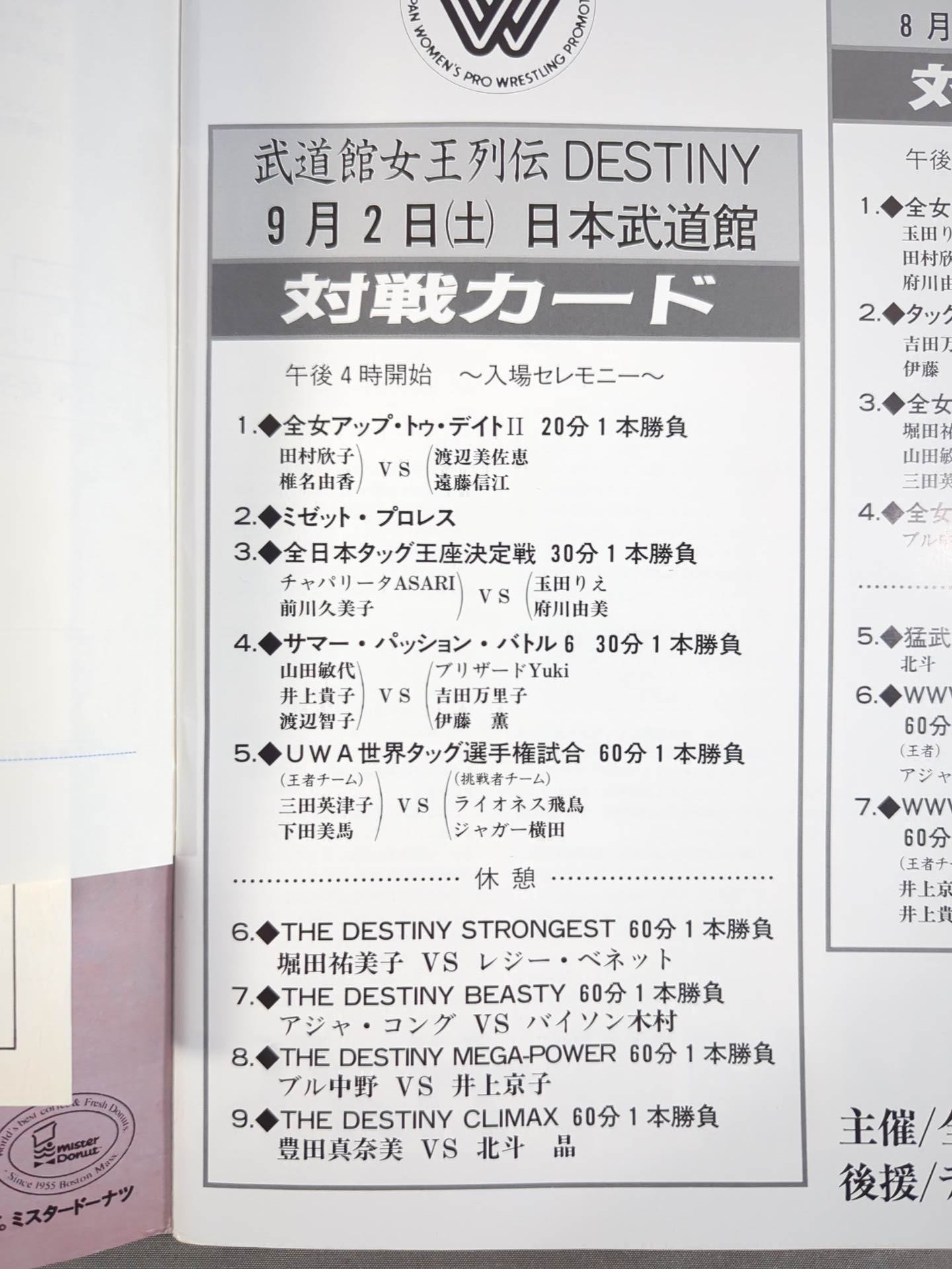 list of the matches is printed :(9.2 Nippon Budokan) Manami Toyota vs Akira Hokuto / (8.30 Osaka Prefectural Gymnasium) [WWWA World Tag Team Fighters Championship] Takako Inoue & Kyoko Inoue vs Manami Toyota & Saki Hasegawa