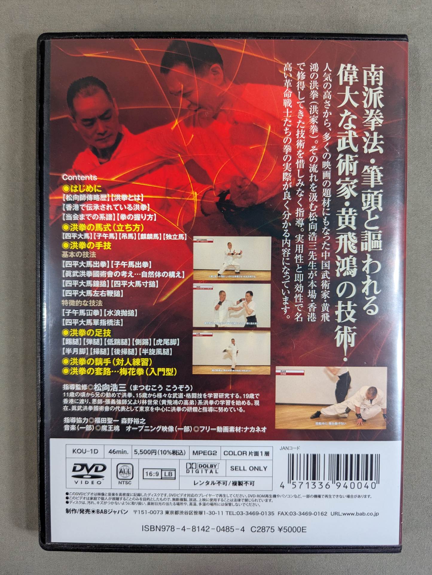 Due to his popularity, Chinese martial artist Huang Feihong has been the subject of many martial arts action movies such as Jackie Chan and Jet Lee. The fist technique of this legendary martial artist is Hongken (also known as Koken Hongjiaquan). Hongquan is a Chinese southern martial art that originated from Southern Shaolin. As one of the five famous fists in Guangdong Province, it is studied all over the world. And since it is a martial art of the turbulent era of the end of the Qing Dynasty, its characteristics are said to be practical and immediate. In this DVD, Kozo Matsumukai, who follows the flow of Huang Feihong (*), generously instructs the techniques and training methods of Hong Quan that he has learned in Hong Kong. It is a rare martial arts DVD in Japan that shows the actual fists of revolutionary warriors.