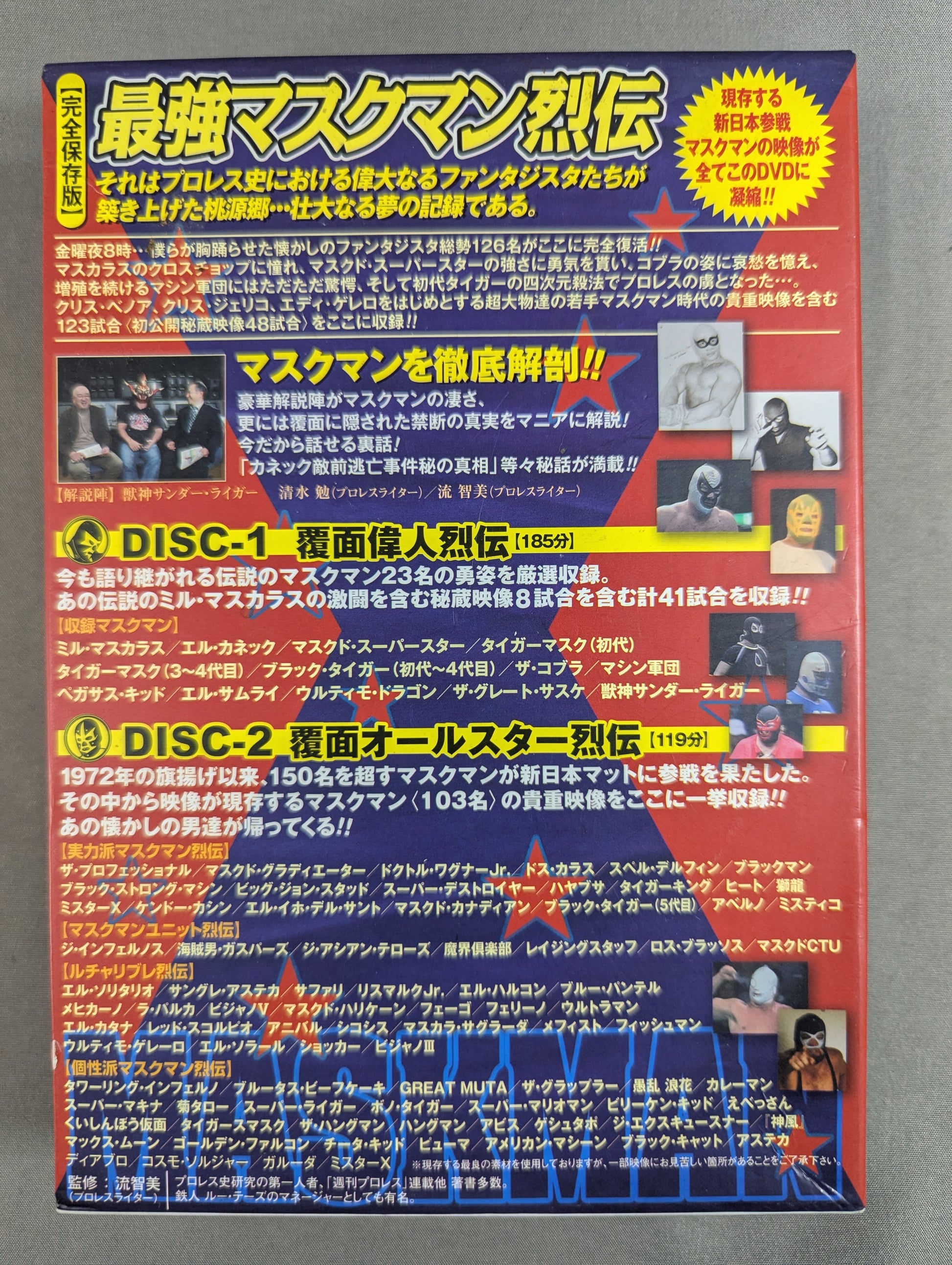 DISC.1 The Legend of the Masked Great Man (185 minutes) Carefully selected and recorded the bravery of 23 legendary mask men that are still talked about today. A total of 41 matches are recorded, including 8 treasured video matches including the fierce battle of the legendary Mil Mascaras ! / DISC.2 Masked All-Star Retsuden (119 minutes) Since the flag was raised in 1972, more than 150 masked men have been He participated in the New Japan Pro Wrestling mat. Among them, the valuable video of Mask Man (103 people) whose video is still in existence is recorded here! ! Those nostalgic men are coming back! !