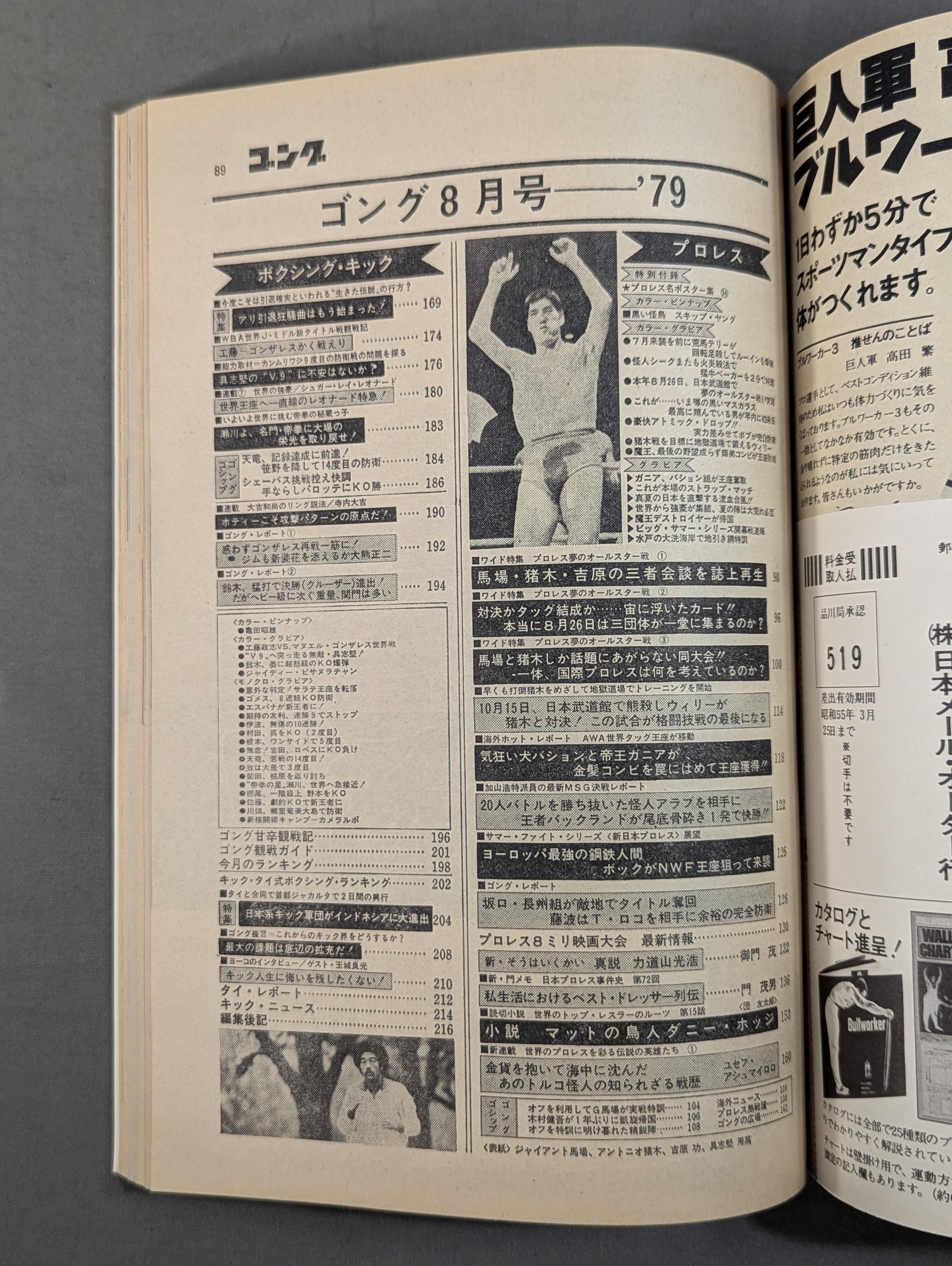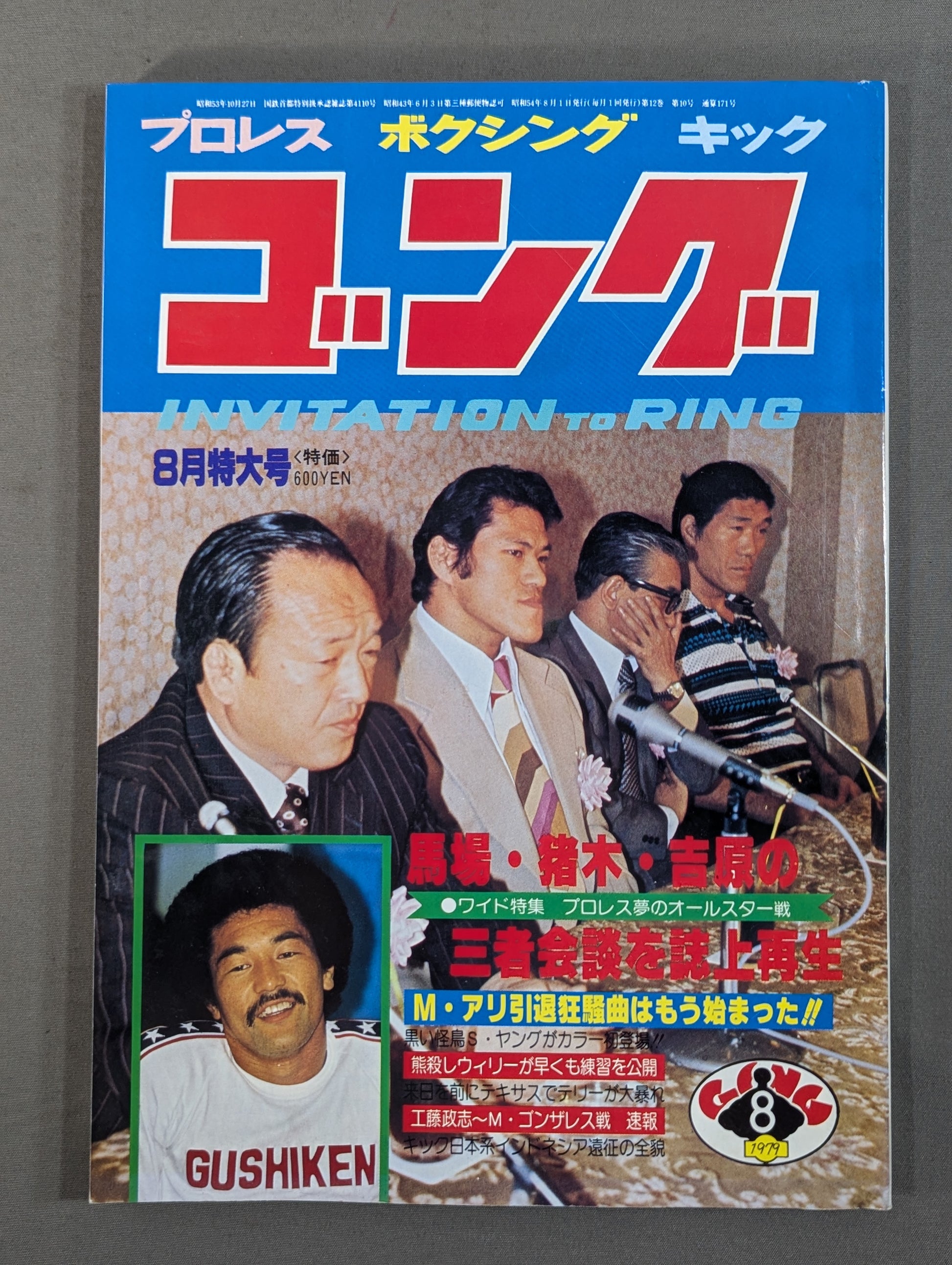 ・Replay of the tripartite meeting between Baba, Inoki , and Yoshiwara in the magazine [Appendix] ○ Pin-up: Front Skip Young / Akio Urakameda ○ Special Appendix: Pro Wrestling Famous Poster Collection [34] 7.27 Budokan 2 major fighters Title match cover: Isao Yoshihara, Antonio Inoki , Giant Baba , Yoko Gushiken
