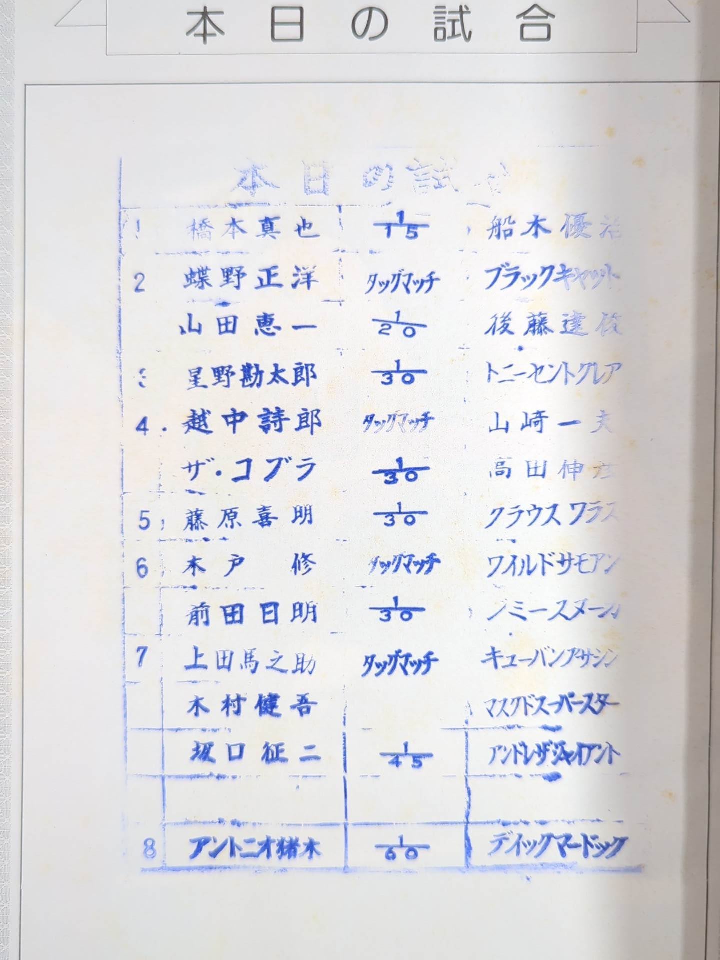 Venue: Ryogoku (final match) / stamped with list of matches : [ IWGP Heavyweight Championship Championship Match] Antonio Inoki vs Dick Murdoch / Seiji Sakaguchi & Kengo Kimura& Umanosuke Ueda vs Andre the Giant & Masked Superstar & Cuban Assassin / 86IWGP Champion Series