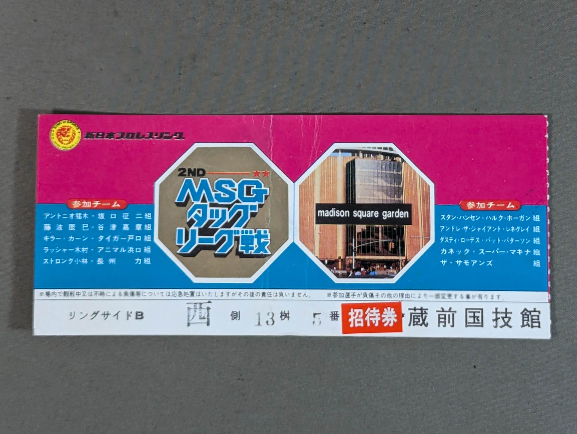Ringside B West 13 MASU (square wooden cup) No. 5 *Labeled with "Invitation Ticket" / Antonio Inoki & Tatsumi Fujinami vs Stan Hansen & Laurent Bo, Lasher Kimura & Tiger Toguchi vs Dusty Rhodes & Dick Murdoch, Tiger Mask vs El Canek