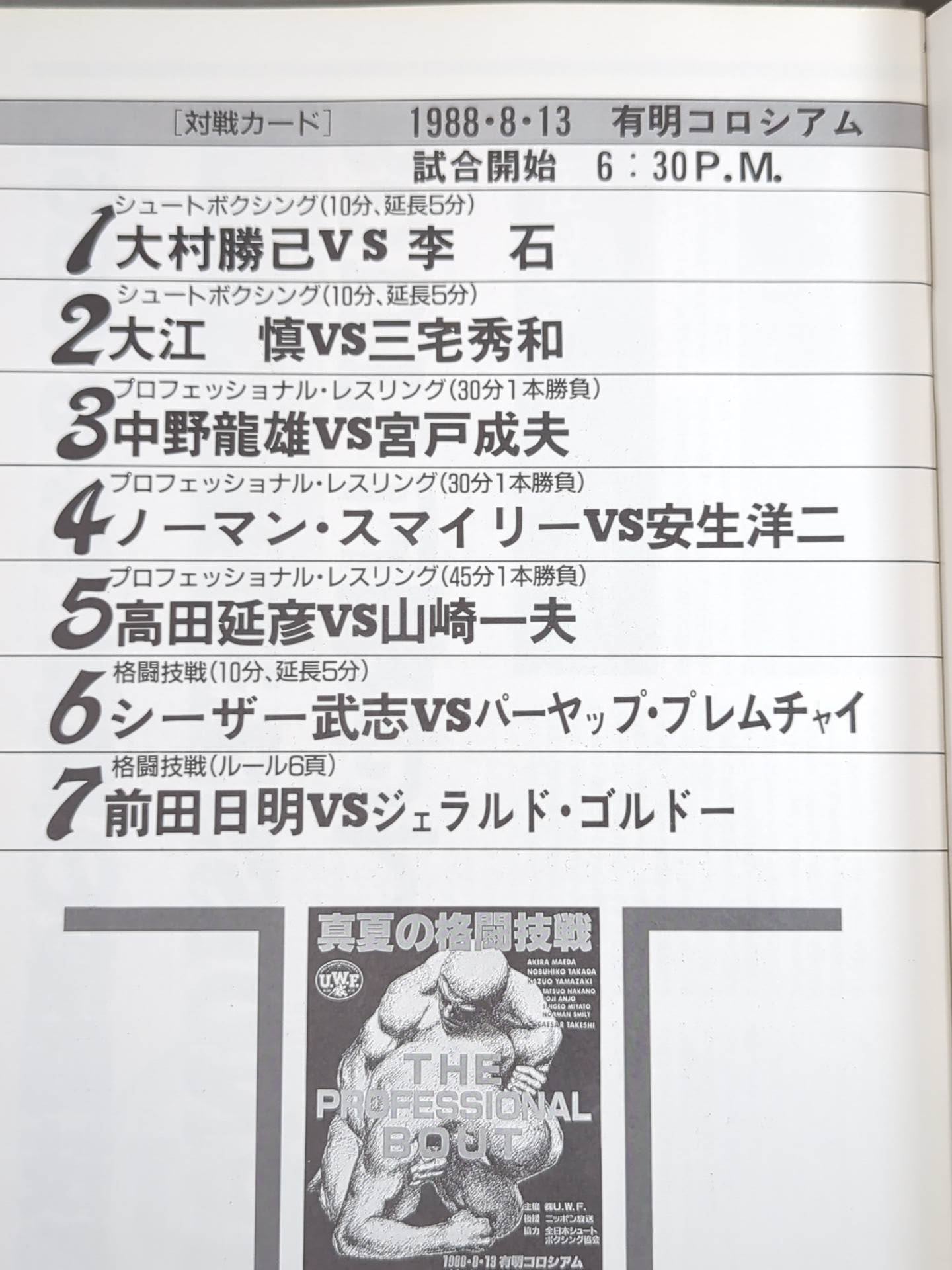 Venue: Ariake Coliseum / list of the matches is printed : Akira Maeda vs Gerald Gordo / Caesar Takeshi vs Payap Premchai / Nobuhiko Takada vs Kazuo Yamazaki