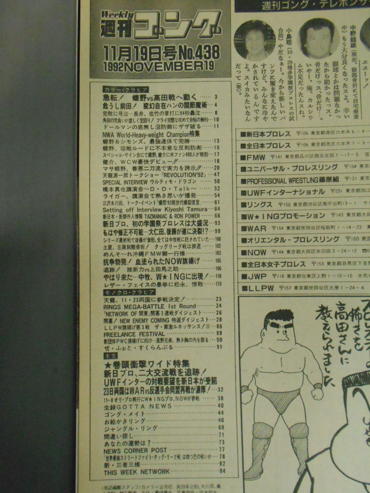 New Japan Pro Wrestling will be entrusted with Takada's challenge, and will he fight Chono on November 22 with Ryogoku ? / Pin-up: Toshiaki Kawada Cover: Masahiro Chono , Nobuhiko Takada