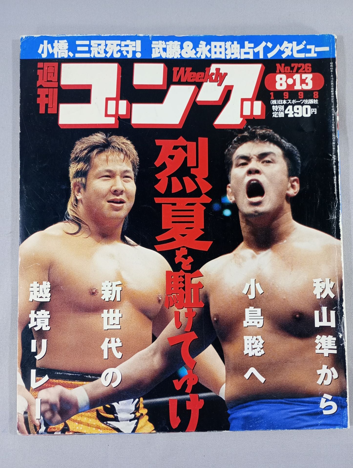 Running through the scorching summer Jun Akiyama to Satoshi Kojima A new generation of cross-border relays! / Pin-up: Jushin Thunder Liger (August Calendar) / Cover: Jun Akiyama, Satoshi Kojima