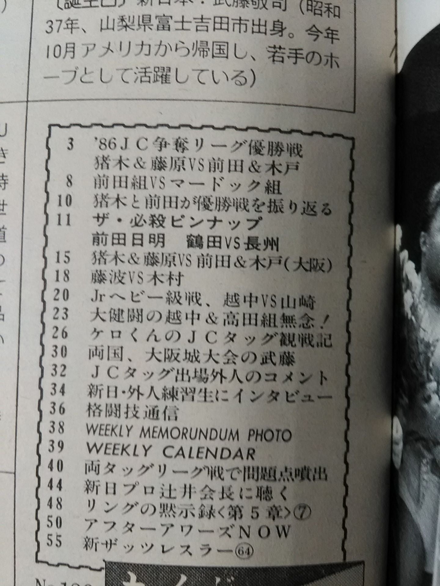 Inoki and Maeda Sui face off / The Champion. Inoki and Tsururyu combination. Kusaruna Maeda and Riki Choshu . / Pin-up: Akira Maeda , Jumbo Tsuruta vs. Riki Choshu / Cover: Antonio Inoki , Yoshiaki Fujiwara