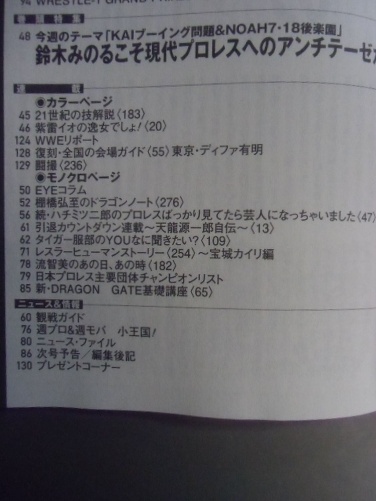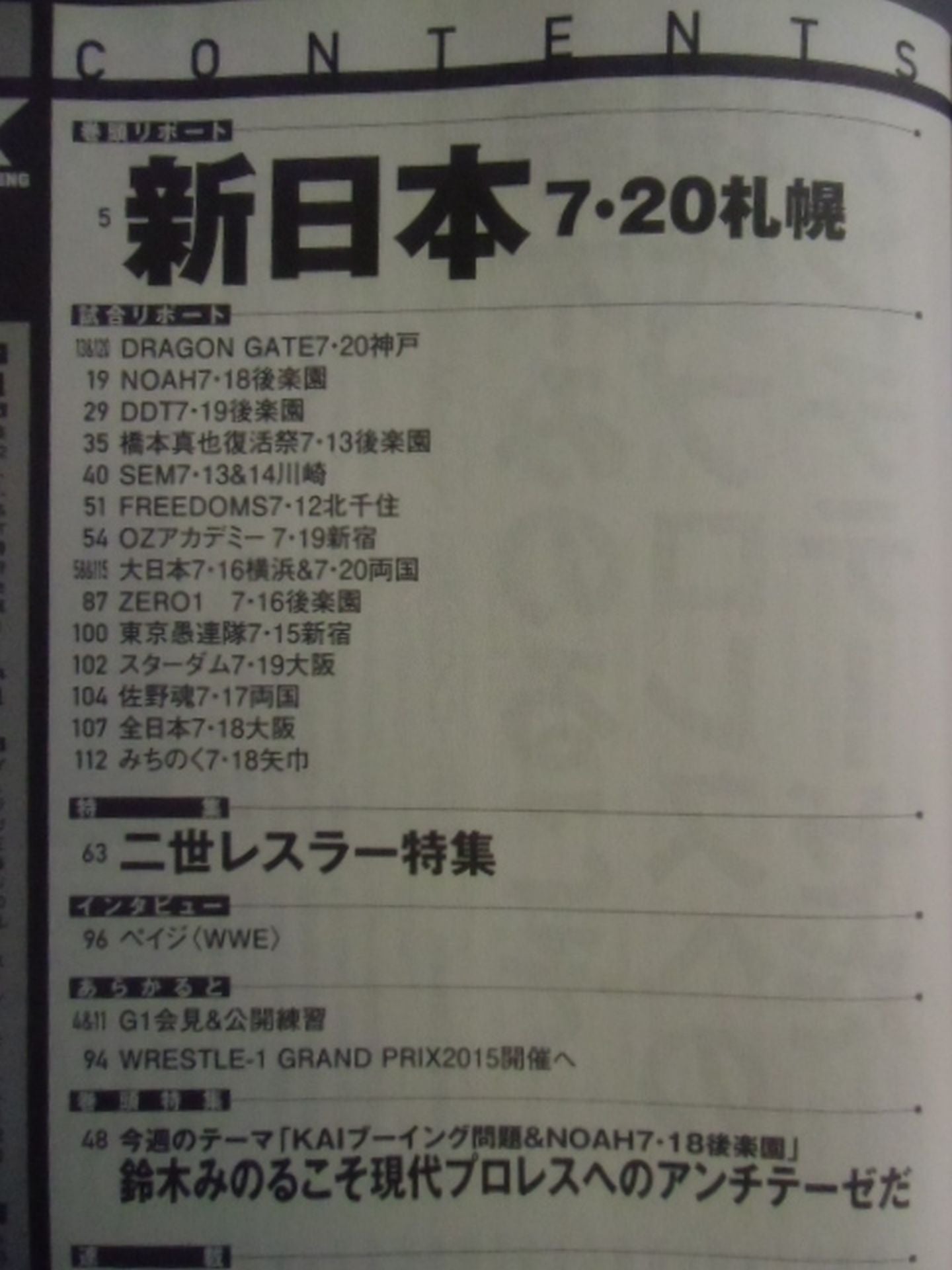 Summer Door G1 Climax Tanahashi, AJ Hakusei Launch! / "7.20" Sapporo, Ryogoku , Kobe Pro Wrestling Three Cities Story Total Power Special Feature / Ark Riot! Suzuki's victory sparks anger and plastic bottles Cover: Hiroshi Tanahashi , Kota Ibushi