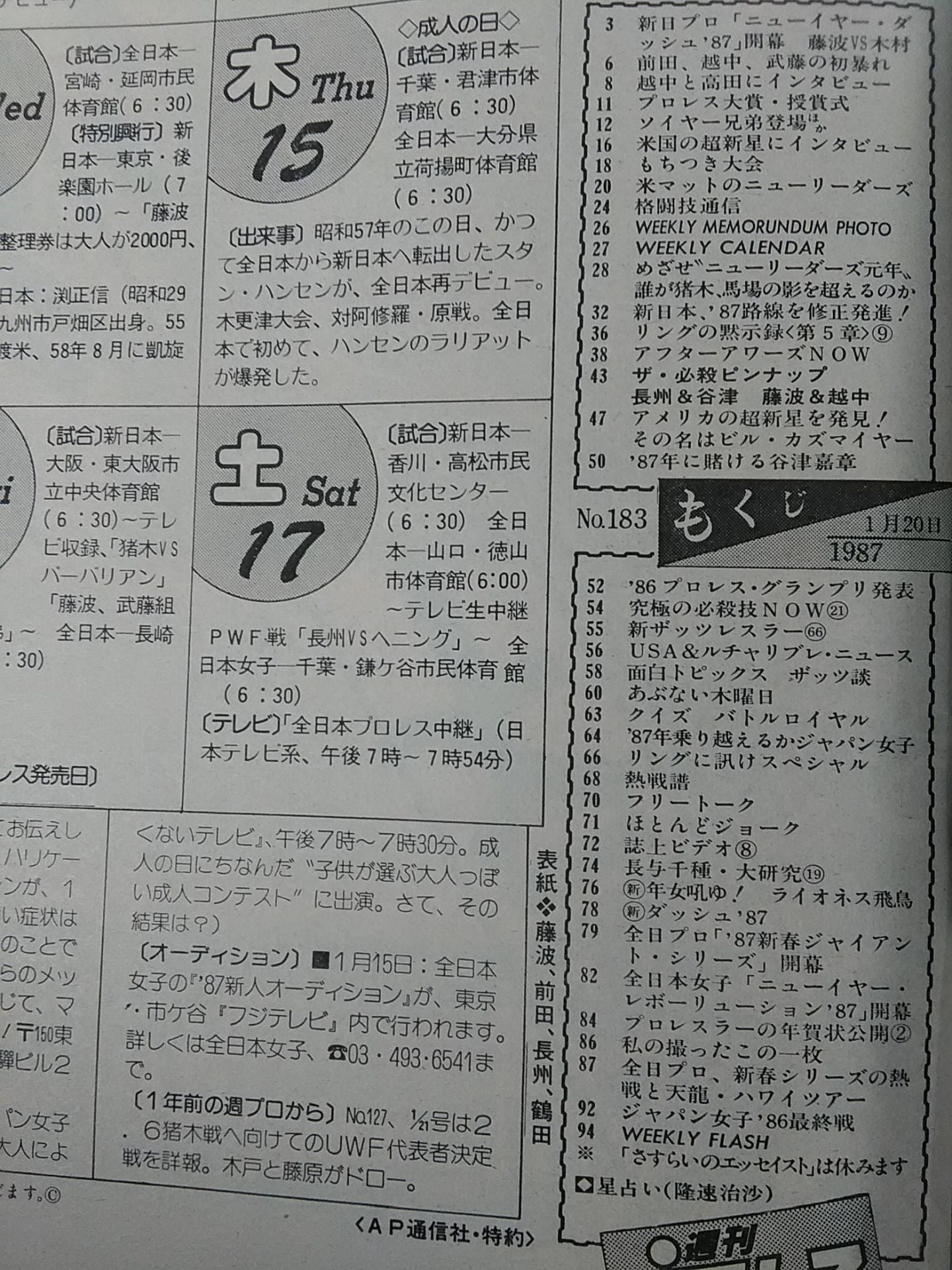 1987 Maeda declares independent box office / Fighting spirit LIVE Part II will be held at Osaka Castle Hall on March 26th!! Don't just shake hands! ! / ◯ Pin-up (Riki Choshu & Yazu / Fujinami & Echinaka) Cover: Akira Maeda , Tatsumi Fujinami , Riki Choshu , Jumbo Tsuruta