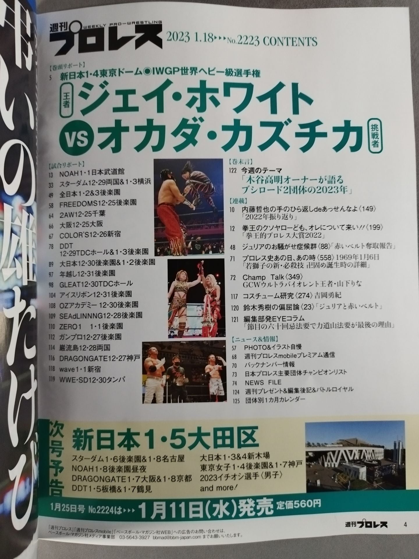 I saw a miracle! Muta vs. SHINSUKE overwhelms with a huge impact early in the new year / [Opening report] New Japan Pro Wrestling 1 & 4 Tokyo Dome ◎ IWGP World Heavyweight fighters rights: (Champion) Jay White vs. Kazuchika Okada (Challenger) / [Match Report] NOAH 1 & 1 Japan Budokan, Stardom 12 & 29 Ryogoku &1.3 Yokohama and others / [End of the book] This week's theme "Owner Takaaki Kitani talks about the 2023 year of Bushiroad 2 promotion" / Cover: Great Muta, Shinsuke Nakamura