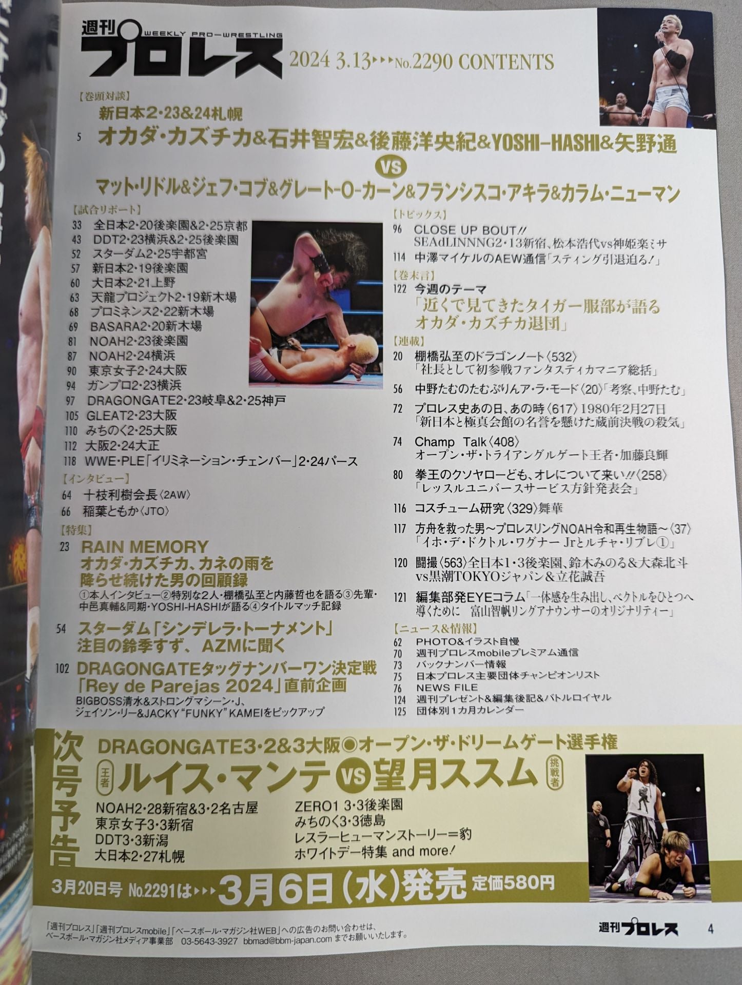 AFTER RAIN / [Introductory Dialogue] New Japan Pro Wrestling 2.23 & 24 Sapporo Kazuchika Okada & Tomohiro Ishii & Hirooki Goto & YOSHI‐HASHI& Toru Yano vs MATT RIDDLE & Jeff Cobb & Great ‐O Kahn & Francisco Akira & Callum Newman / [Special Feature] RAIN MEMORY Kazuchika Okada , Memoirs of the Man Who Kept Rain on Money Cover: Kazuchika Okada , Tetsuya Naito