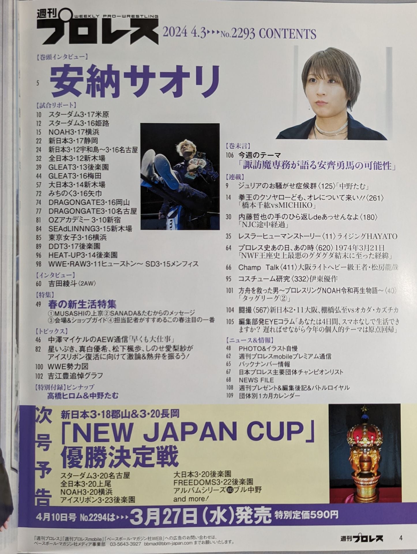 Saori Anou signs exclusive contract with Stardom from April / New Japan Pro Wrestling "NJC", stardom "Cinderella" best 4 lined up / Spring new life support project / HAYATO Human Story / Yutaka Yoshie memorial graph / Pin-up: Hiromu Takahashi & Tam Nakano Cover: Saori Anou