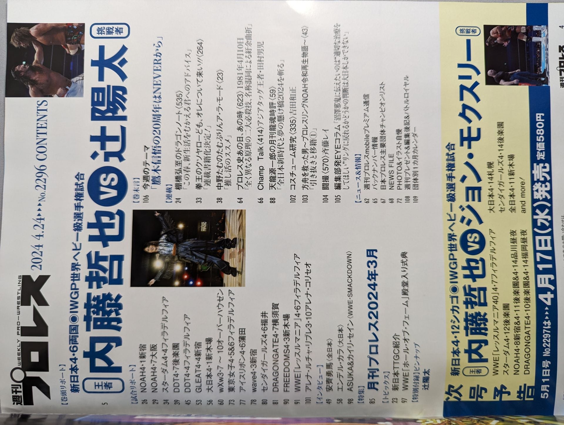 2024 Tetsuya Naito shakes off Yota Tsuji to defend the IWGP World / Interview with "Youngest Triple Crown Champion" Yuma Anzai  / Stardom America Maika  V3 / Kaito Kiyomiya  & Ryohei Oiwa  GHC Tag Team Capture / WrestleMania First Day & Bull Nakano Hall of Fame Award / Pin-Up: Yota Tsuji  Cover: Tetsuya Naito, Yota Tsuji