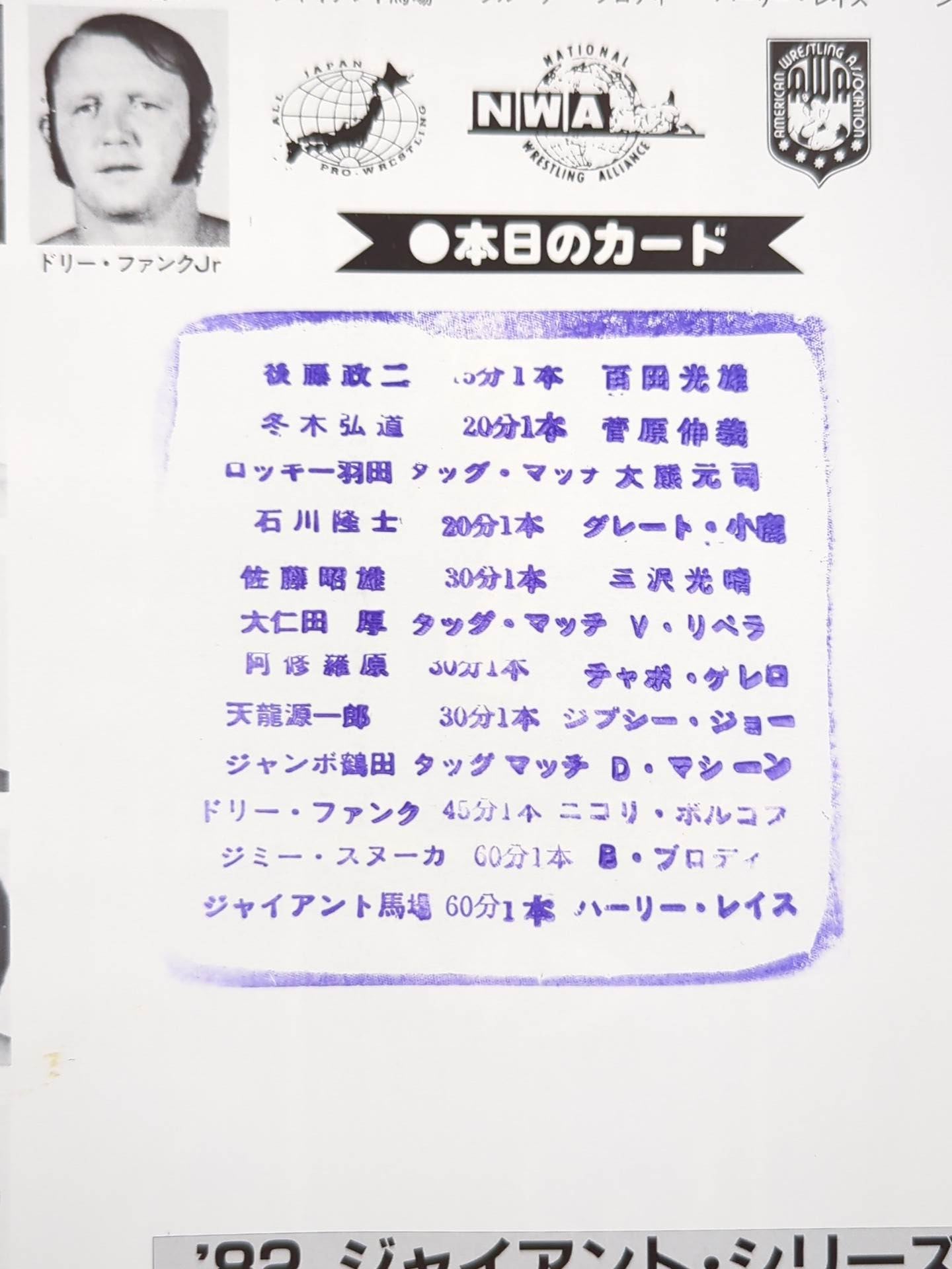 Venue: Aichi Prefectural Gymnasium / stamped with list of matches : [PWF Heavyweight Fighters Giant Baba vs Harley Race / Bruiser Brody vs Jimmy Snuka *During the match, Tsuruta broke in and no contest