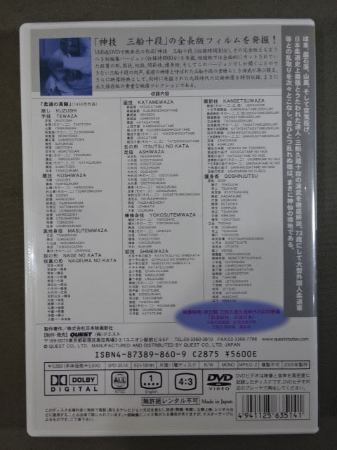 The work "Divine Technique: Mifune Judan" has already been released on VHS & DVD(Recording time: 30 minutes). A separate edited version (recording time 60 minutes), which can be said to be the complete version, is discovered. In the shortened version, the shape of the throwing, solid techniques, strangulation techniques, joint techniques, and self-defense techniques were completely cut. And the flesh voice of Mifune Judan, which can only be heard in this version. The wonderful performance of Mifune Judan, who was called the god of judo, is revived again. In addition, as a video bonus, a special recording video of the Kudan era was excavated at the same time. It is truly a valuable collection of images of the permanent preservation edition. 《Contents》Breaking KUZUSHI / Technique TEWAZA / Waist Technique KOSHIWAZA / True Sacrifice Technique MASUTEMIWAZA / Throwing Form NAGE NO KATA / Throwing Back Shape NAGEURA NO KATA / Solid Technique KATAMEWAZA / Gonokata ITSUTSU NO KATA / Foot Technique ASHIWAZA / Horizontal Sacrifice Technique YOKOSUTEMIWAZA / Strangulation Technique SHIMEWAZA / Joint Technique KANSETSUWAZA / Self-Defense GOSHINJUTSU / Tachiai TACHIAI "Video Bonus" First Release, Phantom Video of the Kuzo Mifune Kudan Era "Judo Secret Technique Martial Arts Japan" Mifune Kudan Creation Form of Random Throwing Mifune Kudan Creation Self-Defense Technique