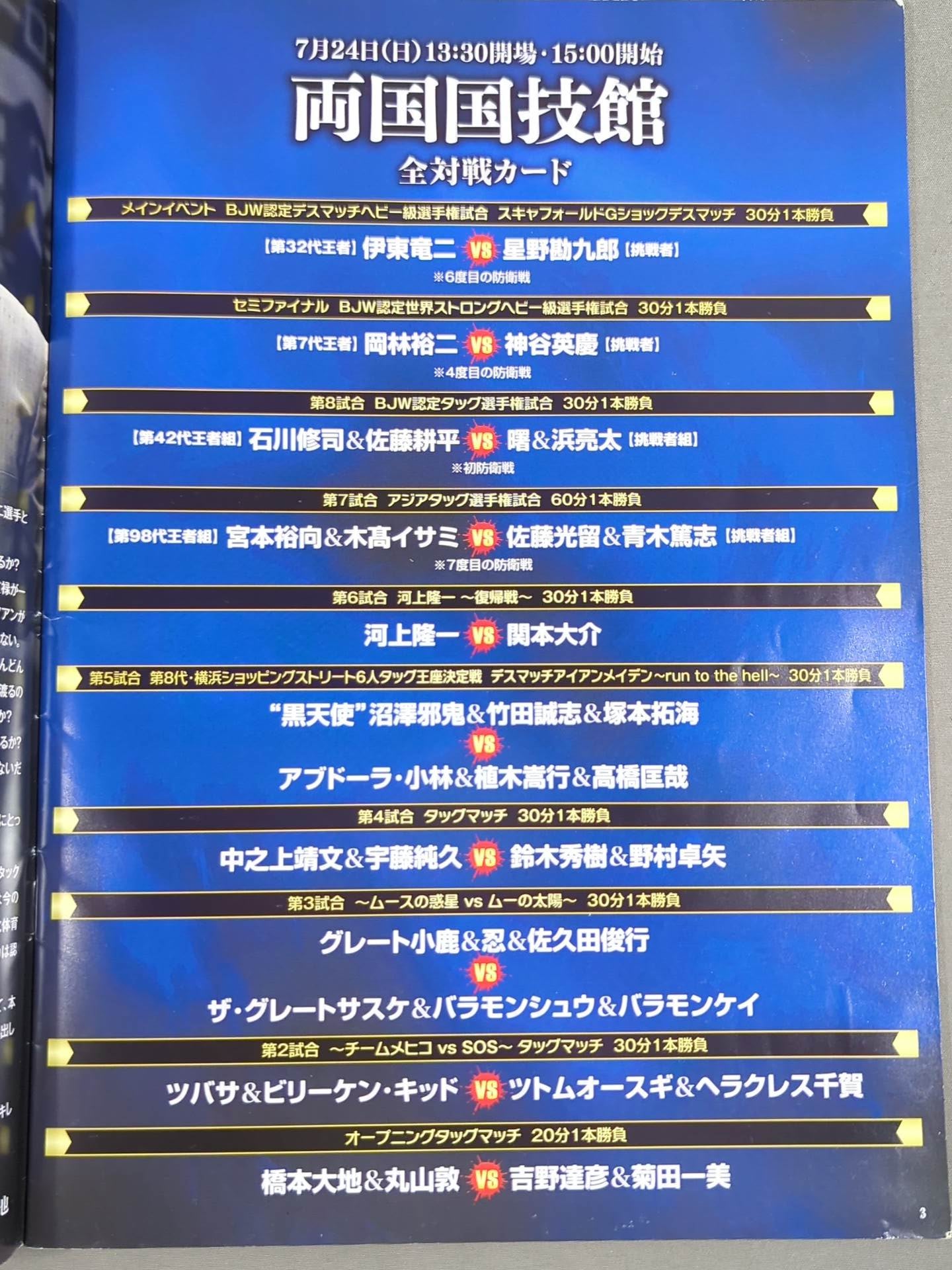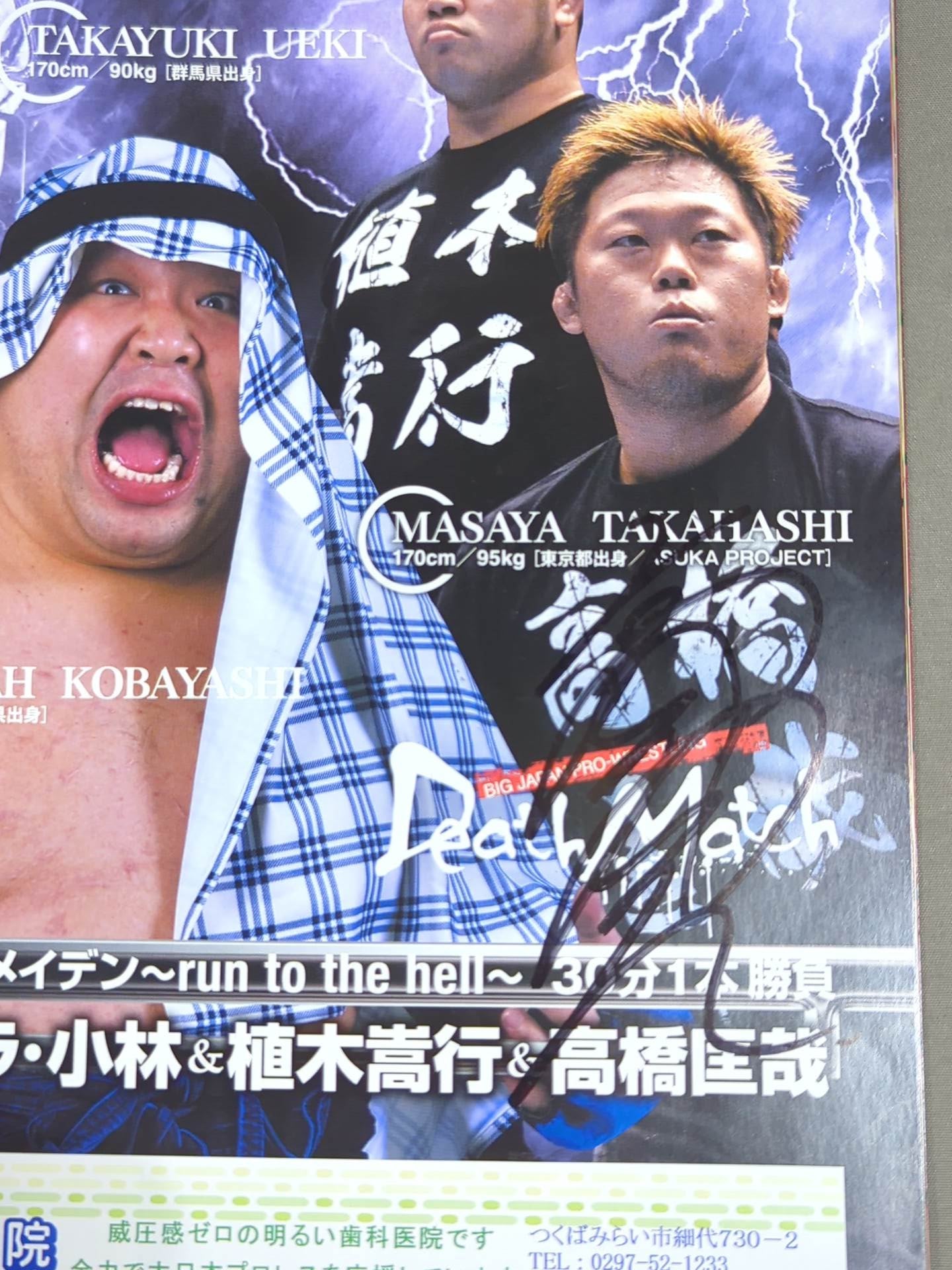 Ryuji Ito , Kankuro Hoshino, Yuji Okabayashi , Hideyoshi Kamiya, Ryuichi Kawakami, Daisuke Hashimoto , Jaki Numazawa "Black Angel" , Masaya Takahashi , Yasufumi Nakanoue , Takuya Nomura , Toshiyuki Sakuda , Tsutomu Osugi, Hercules Chiga, Atsushi Maruyama, Tatsuhiko Yoshino , Kazumi Kikuta, Kazuki Hashimoto , Yuichi Taniguchi above 18 fighters hand signed autograph !! / Venue: Ryogoku / The list of the matches is printed: [BJW Certified Deathmatch Heavyweight Fighters Rights match] Ryuji Ito vs Kankuro Hoshino