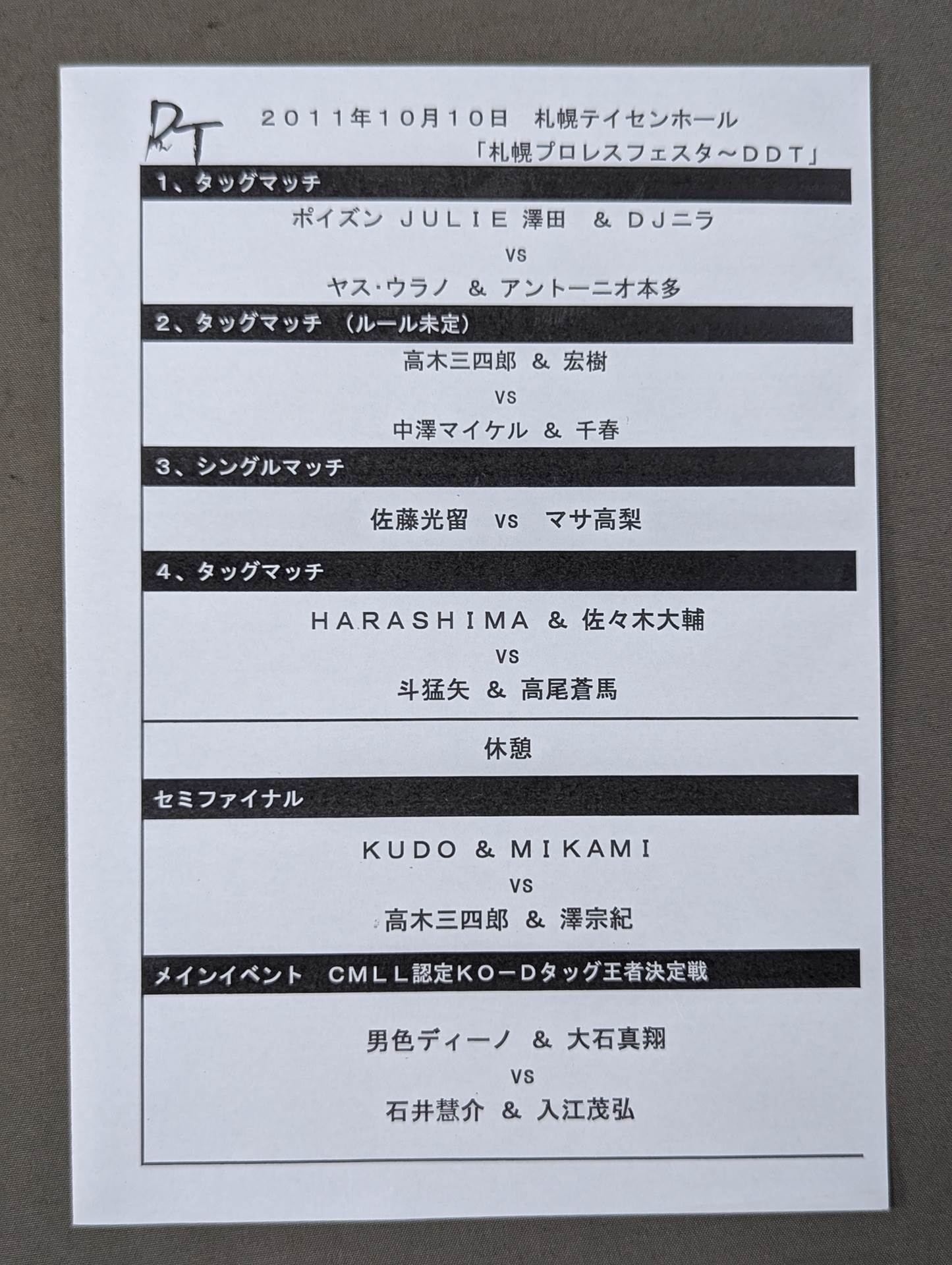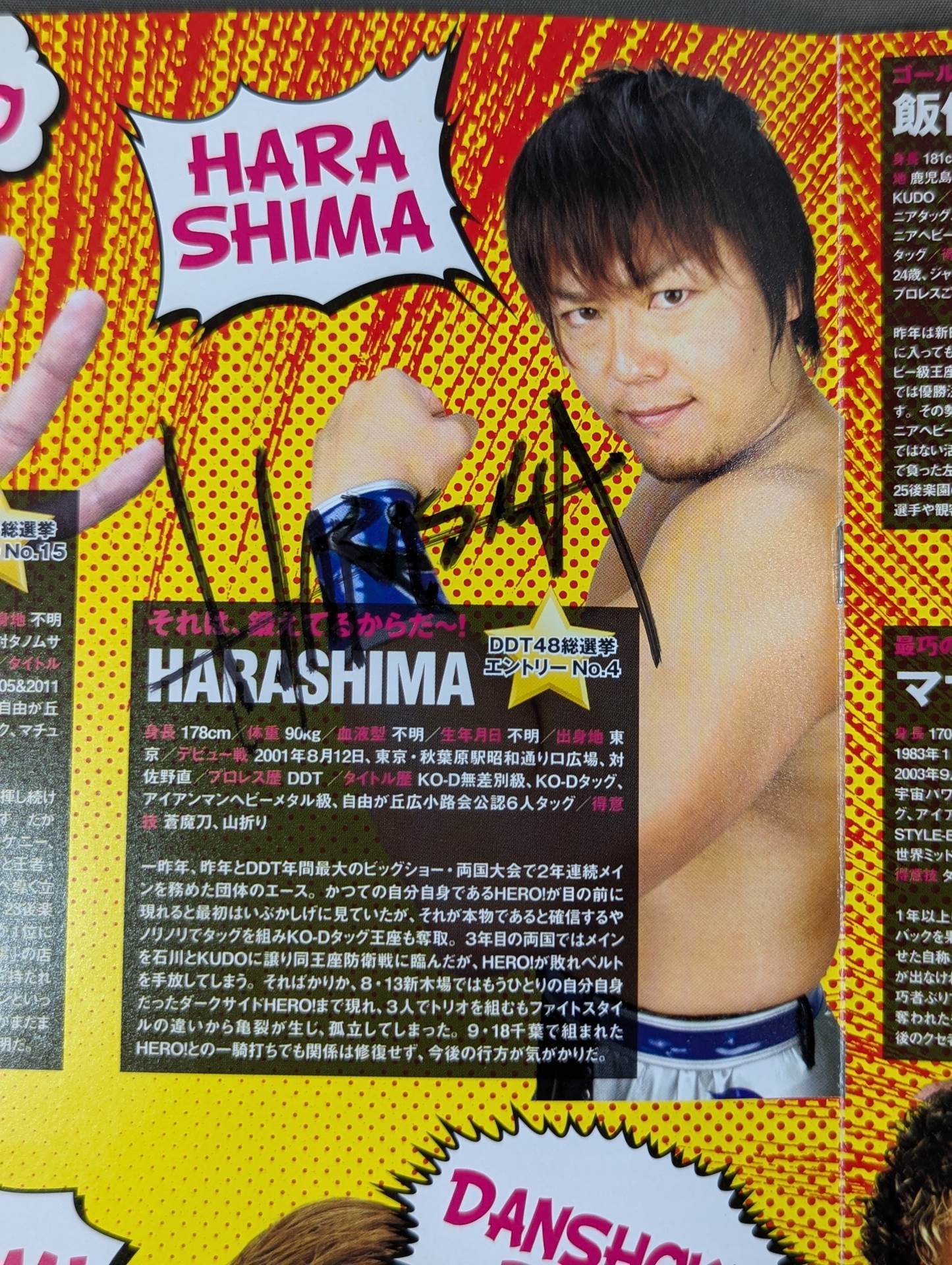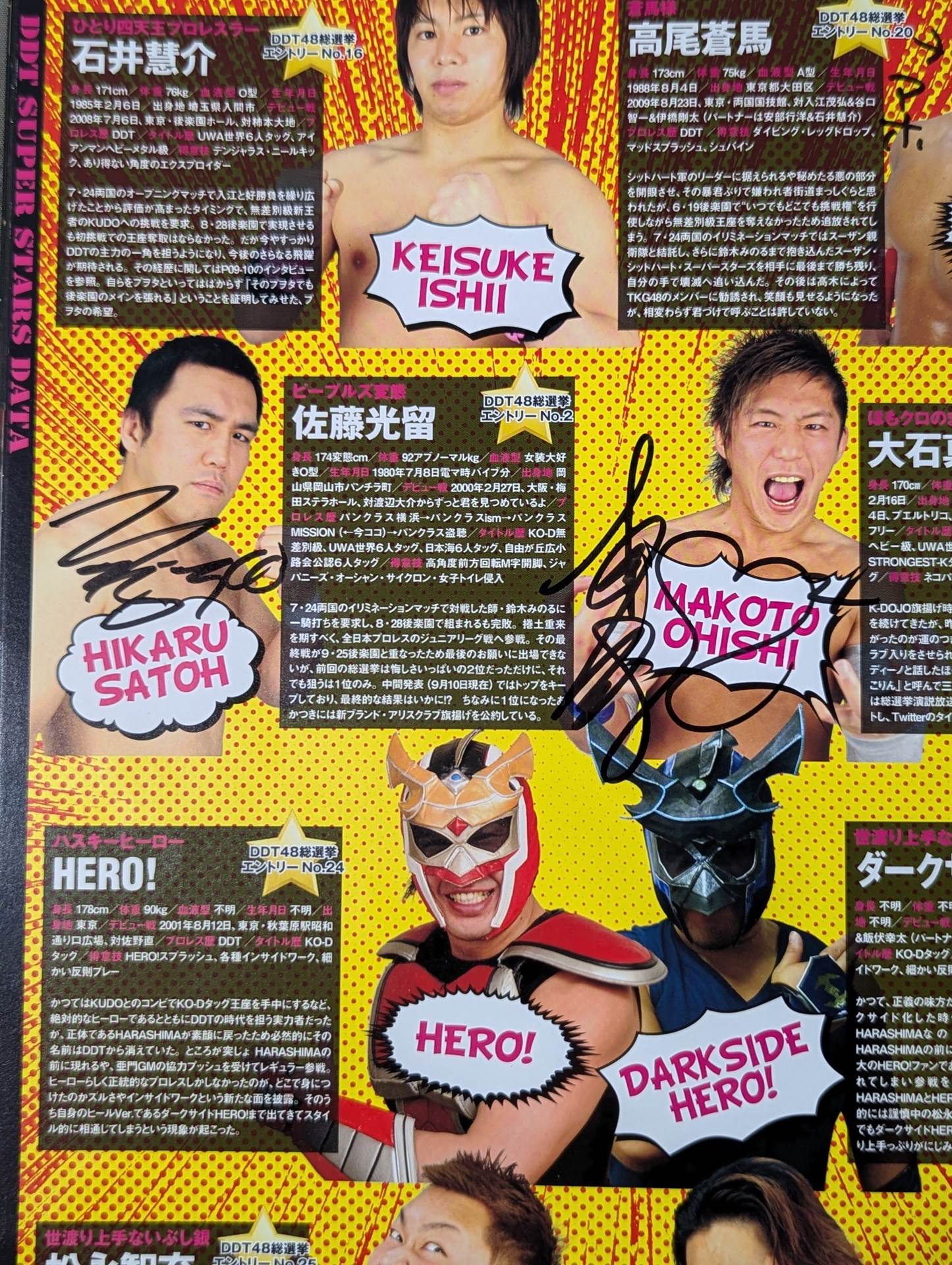 HARASHIMA, Antonio Honda , Hikaru Sato , Makoto Oishi More than 4 fighters hand signed autograph !! / Venue: Hokkaido, Sapporo Teisen Hall / There is a list of the matches on the separate sheet: [KO-D Tag Team Championship Match] Danshoku Dino & Makoto Oishi vs Keisuke Ishii &Shigehiro Irie