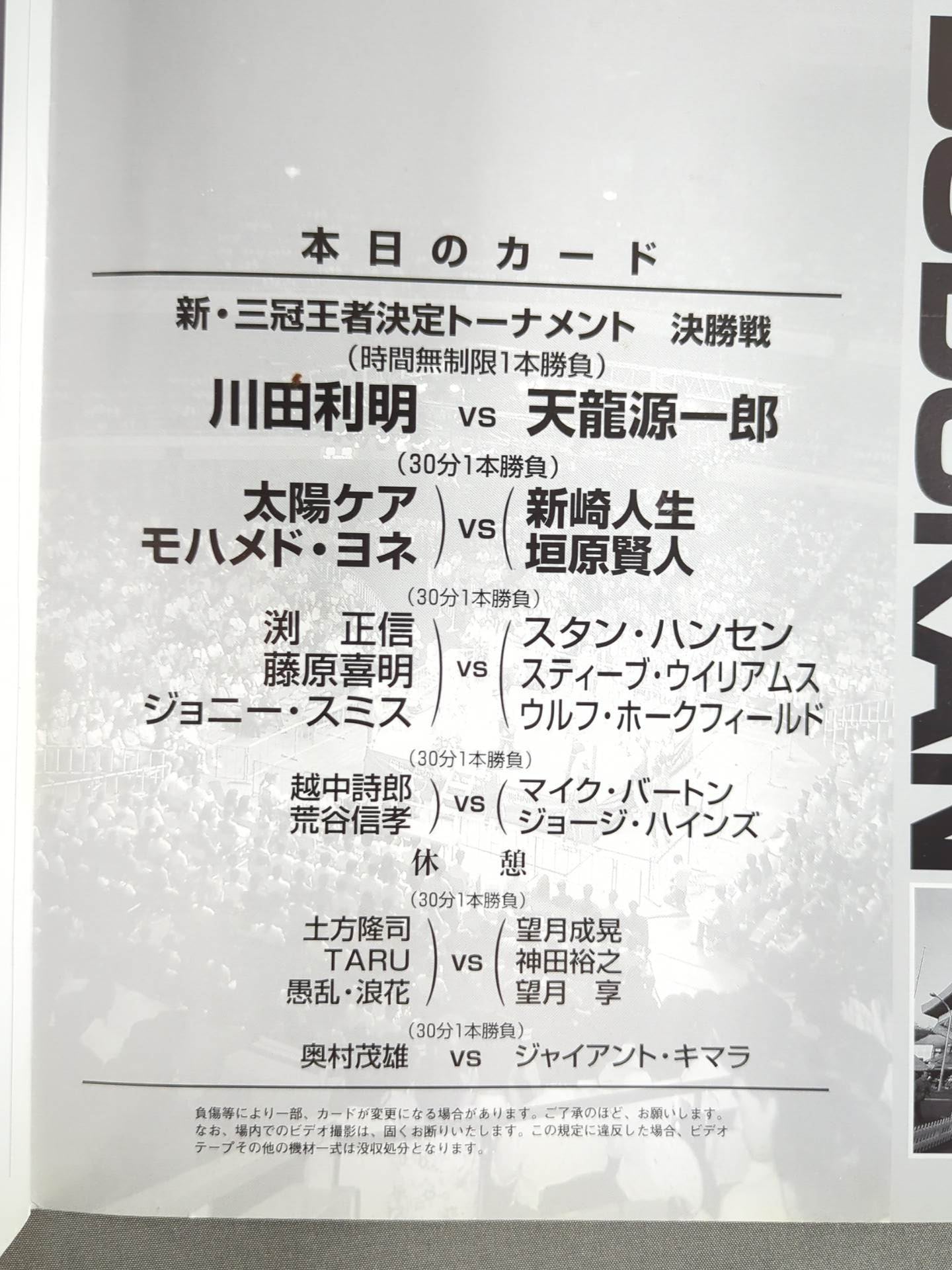 Venue: Nippon Budokan / list of the matches is printed : [Triple Crown Heavyweight fighters Championship Match] Toshiaki Kawada vs. Tenryu Genichiro / Taiyo Kea & Muhammad Yone vs Jinsei Shinzaki & Kento Kakihara