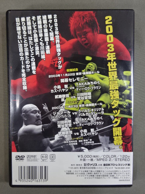 Muto, Arashi vs Kojima, Kazu Hayashi and 5 other matches ○ The 2003 Real World Tag League kicked off with a bang. In the second consecutive match at Korakuen in the opening round, Muto-gumi clashed with Kawada-gumi and Kojima-gumi. Was the Muto team able to survive this series of battles? A complete recording of noteworthy cards that you can't take your eyes off of!