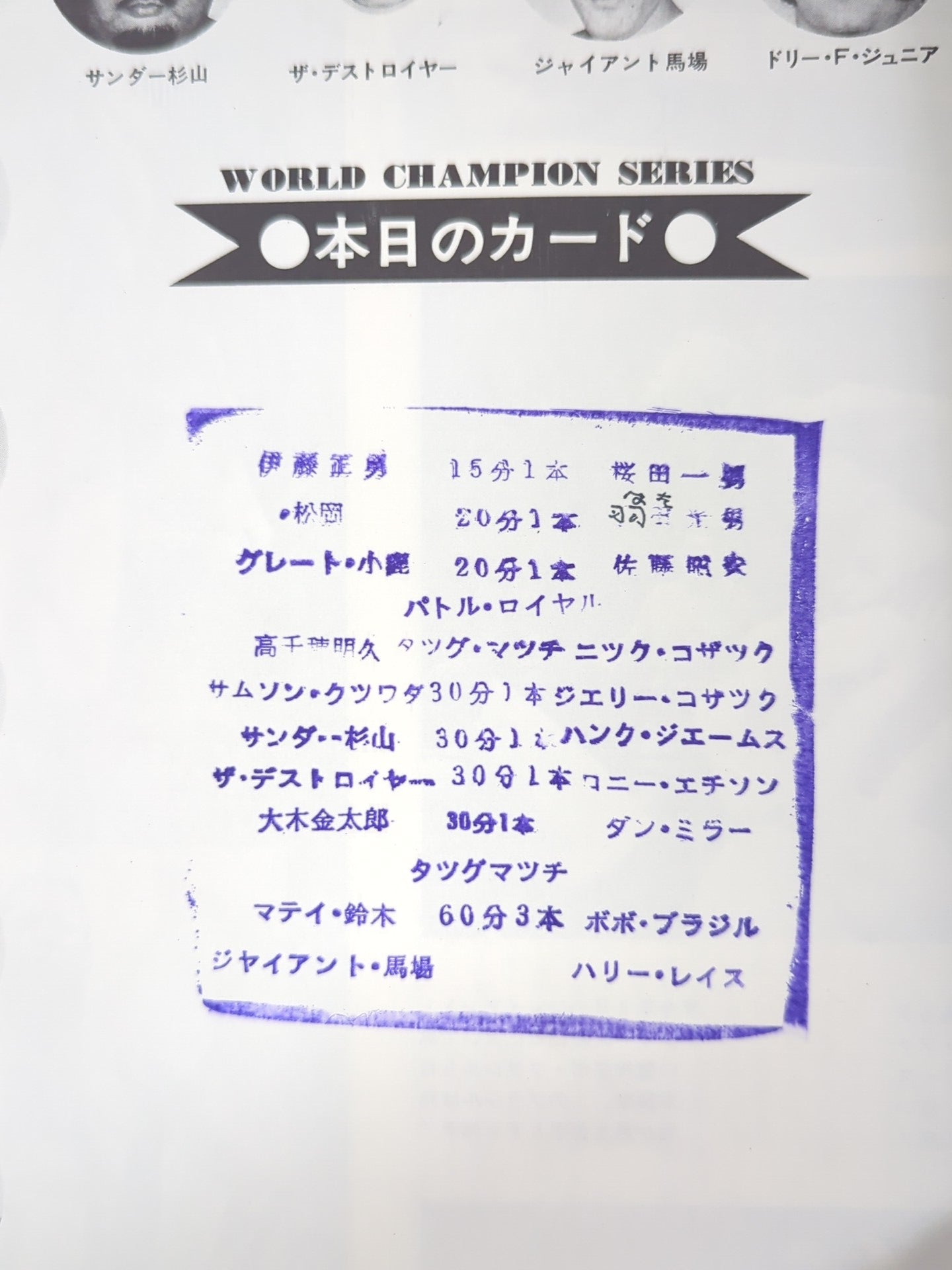 Venue: Hokkaido, Bihoro Town Sports Center / stamped with list of matches : Giant Baba & Matty Suzuki vs Harley Race & Bobo Brazil / Kintaro Oki vs Dan Miller