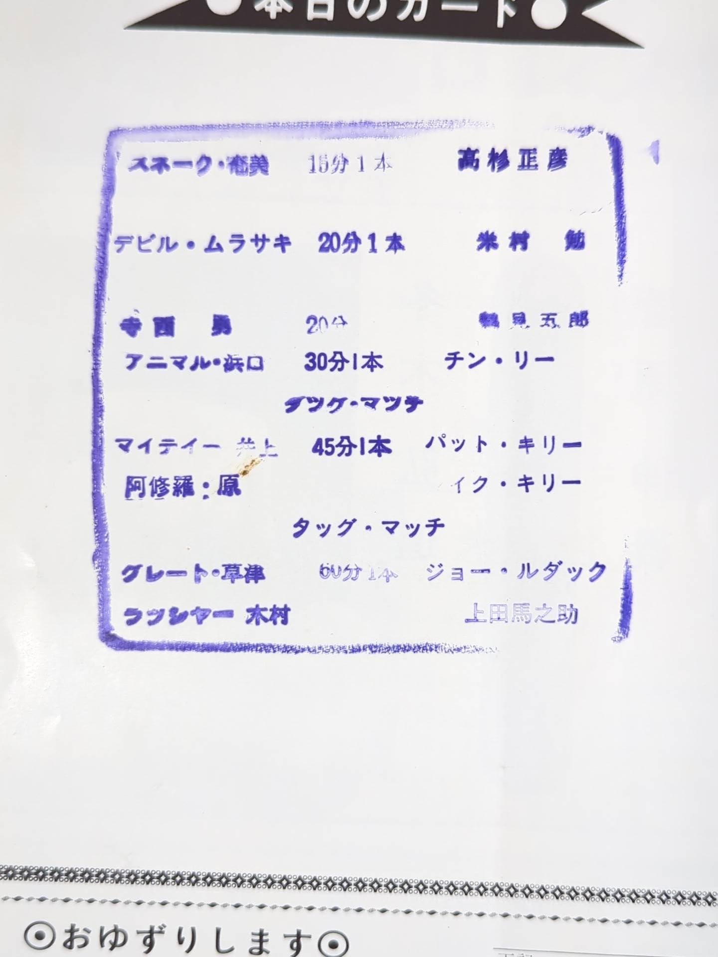 stamped with list of matches : Rasher Kimura & Great Kusatsu vs Umanosuke Ueda & Joe Ludak / Mighty Inoue & Asura Hara vs Pat Killy & Mike Killy