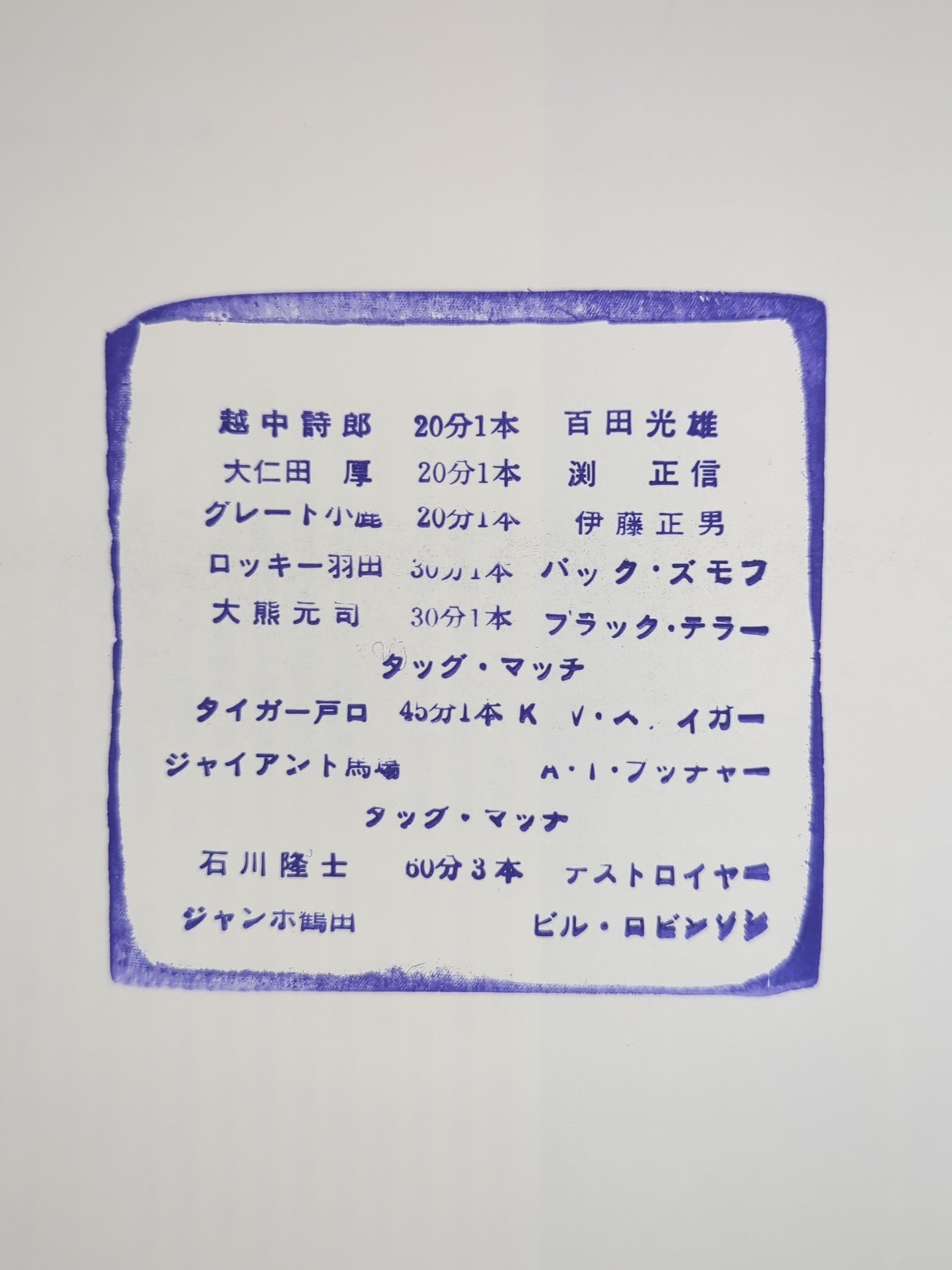 Venue: Kitami City Training Center, Hokkaido / stamped with list of matches : Jumbo Tsuruta & Keiji Ishikawa vs Bill Robinson & The Destroyer / Giant Baba & Tiger Toguchi vs Abdullah the Butcher & Carl Fons Tiger