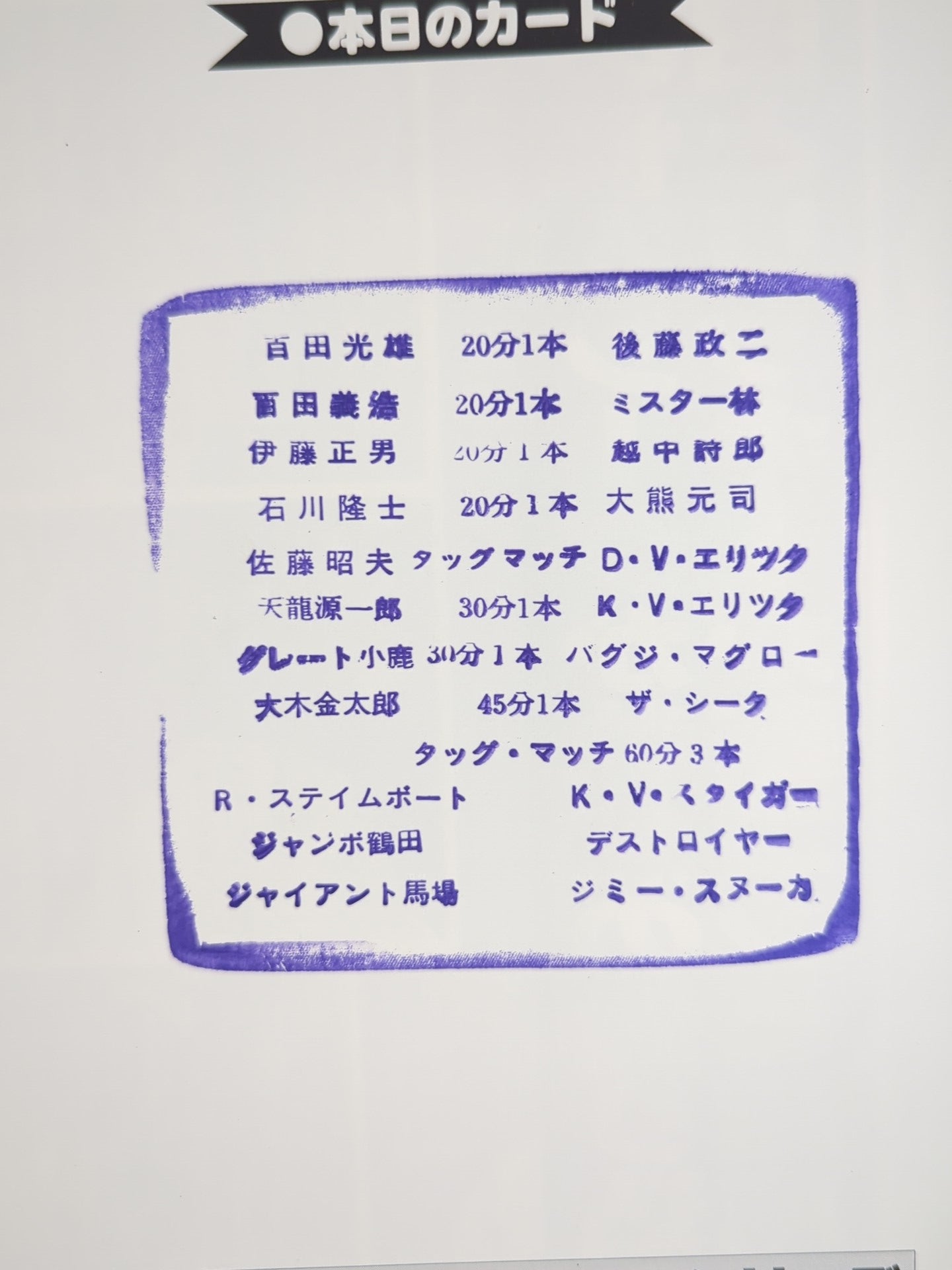 Venue: Hokkaido, Hokkaido, Makubetsu Municipal Stadium / stamped with list of matches : Giant Baba & Jumbo Tsuruta & Ricky Steamboat vs Jimmy Snuka & The Destroyer & Carl von Steiger / Kintaro Oki vs The Sheik