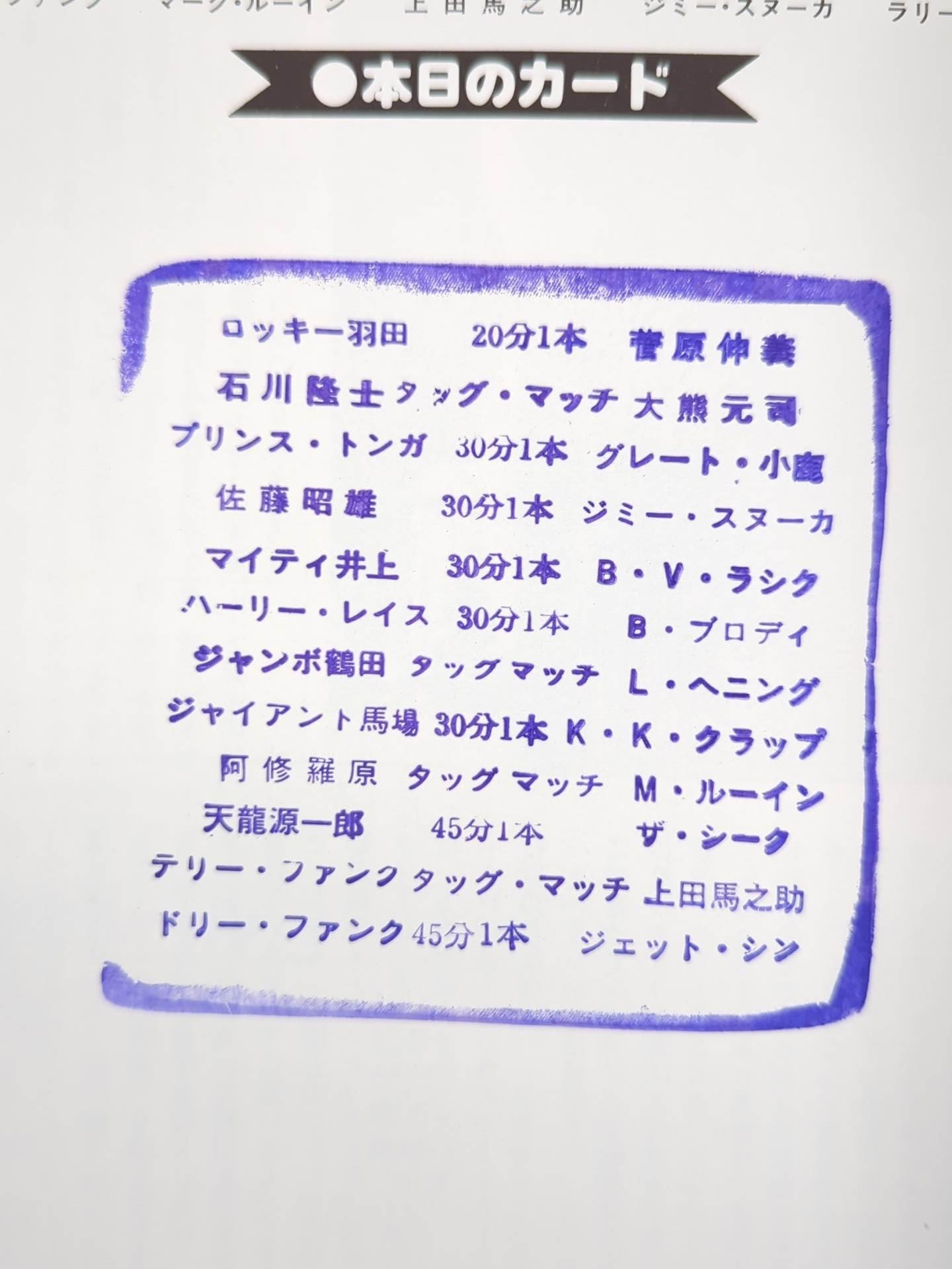 Venue: Korakuen Hall (Opening Match) / stamped with list of matches : [Official Match] Terry Funk & Dory Funk Jr. vsUmanosuke Ueda & Tiger Jeet Singh